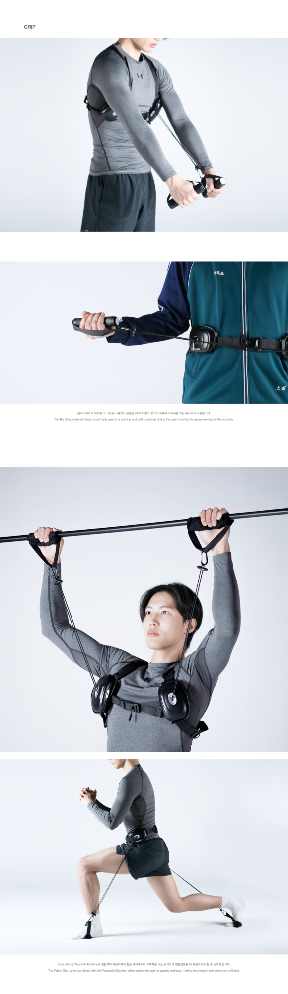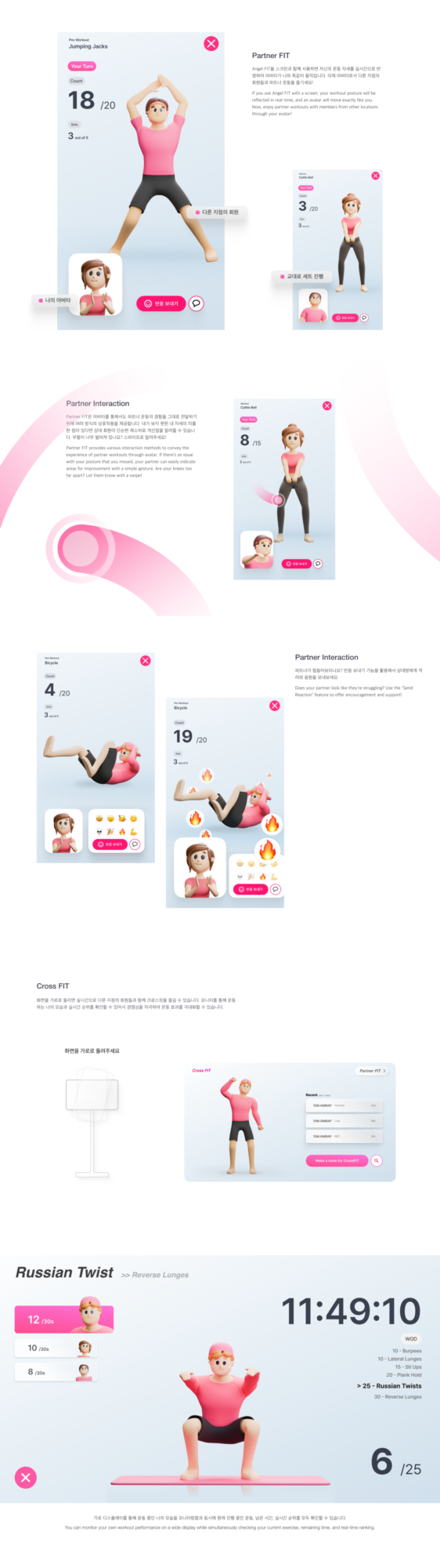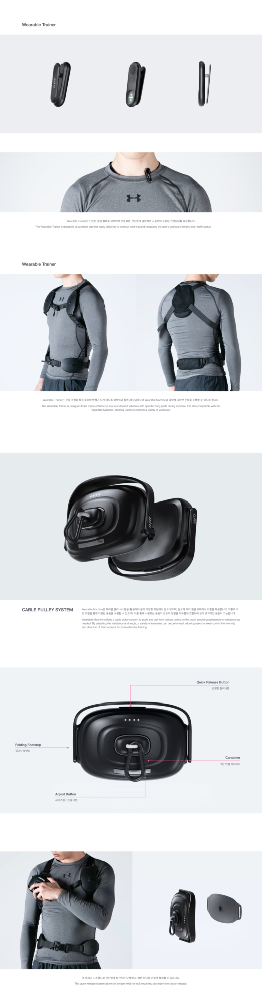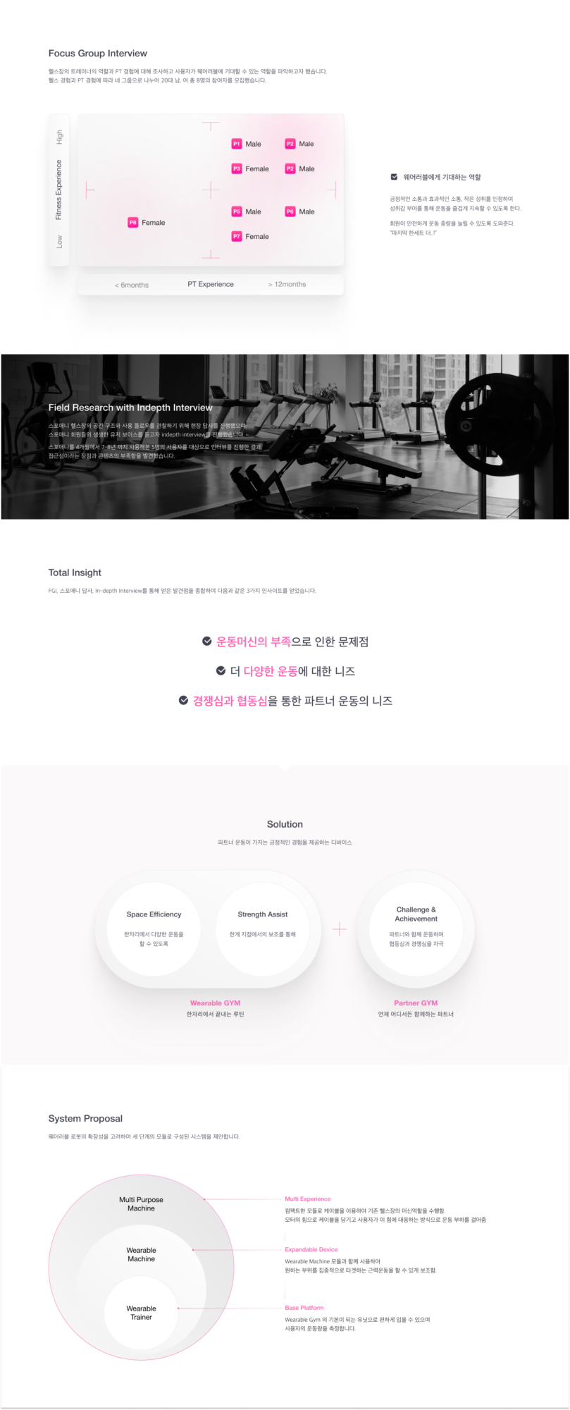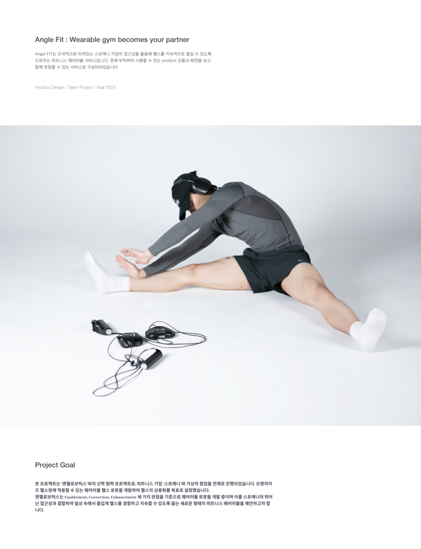 본 프로젝트는 ‘엔젤로보틱스’와의 산학 협력 프로젝트로, 피트니스 기업 ‘스포애니’와 가상의 협업을 전제로 진행되었습니다. 프랜차이즈 헬스장에 적용할 수 있는 웨어러블 헬스 로봇을 개발하여 헬스의 상용화를 목표로 설정했습니다. 엔젤로보틱스는 Enablement, Correction, Enhancement 세 가지 관점을 기준으로 웨어러블 로봇을 개발 중이며 이를 스포애니의 뛰어난 접근성과 결합하여 일상 속에서 즐겁게 헬스를 경험하고 지속할 수 있도록 돕는 새로운 형태의 피트니스 웨어러블을 제안하고자 합니다. 이러한 키워드를 프로젝트에 녹여내어 헬스장에 범용적으로 적용될 수 있는 케이블 폴리 방식의 새로운 웨어러블 디바이스를 제안하고, 다양한 지점의 사람들이 하나의 공간에서 함께 운동하는 것처럼 느낄 수 있도록 도와주는 프로그램 인터페이스를 제안합니다.