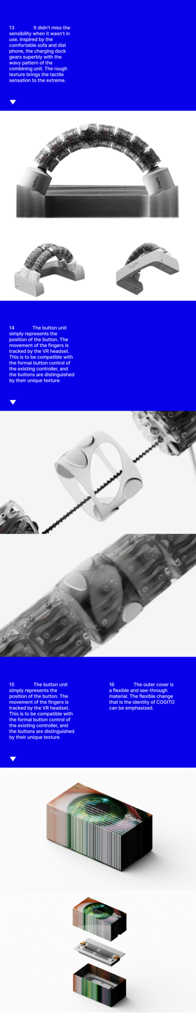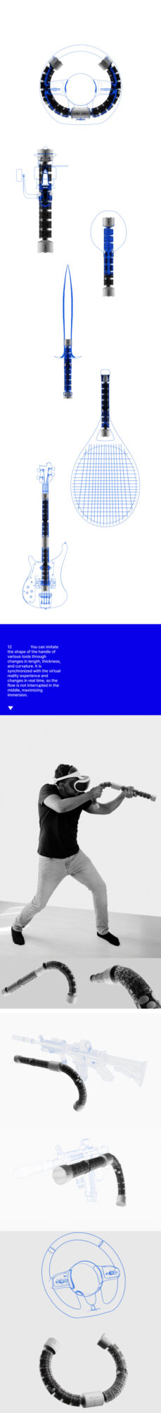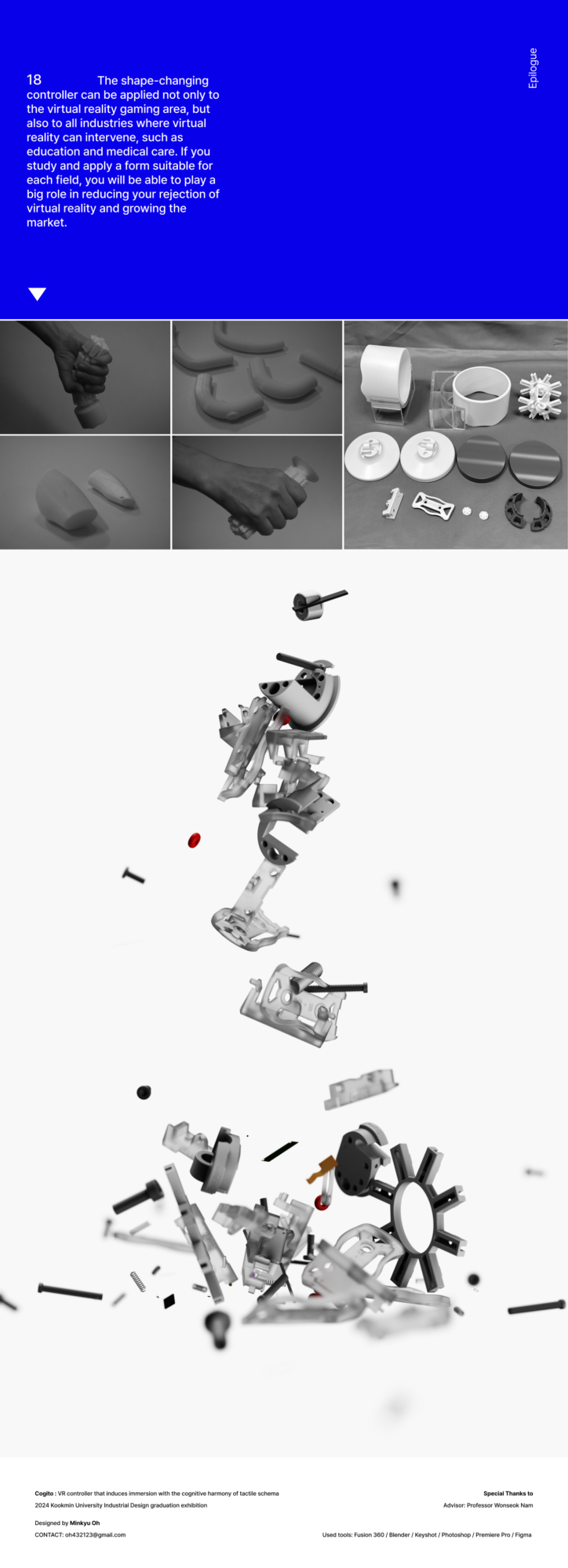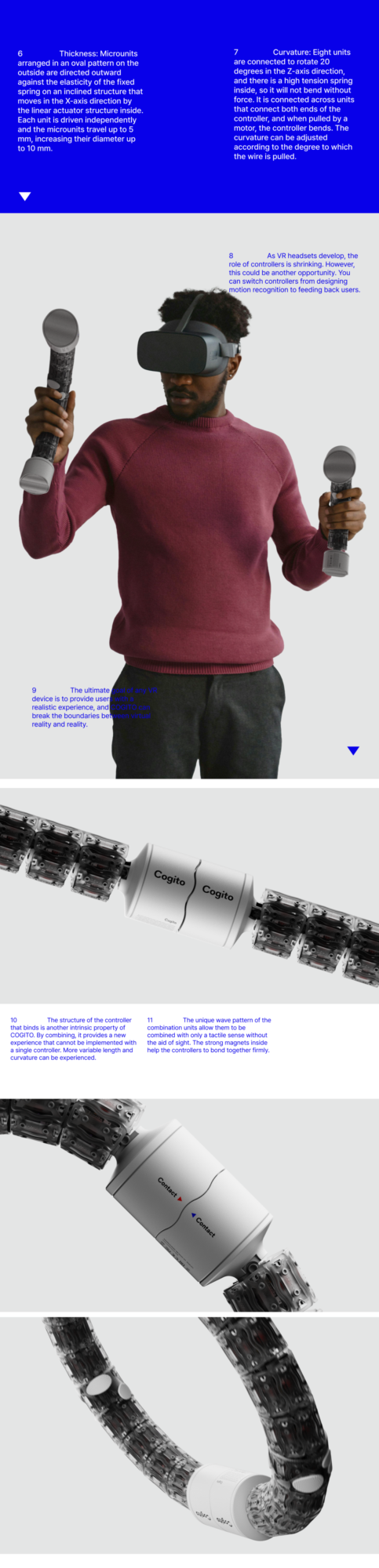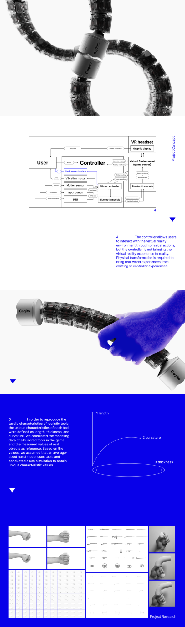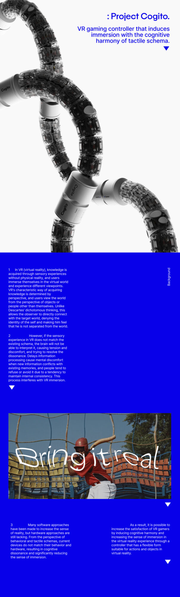 이 과정은 VR 몰입에 방해가 됩니다. 많은 소프트웨어 접근법이 현실감을 높이기 위해 시도되었지만, 하드웨어 접근법은 여전히 부족합니다. 행동과 촉각적 스키마 관점에서 현재의 장치들은 행동과 하드웨어가 일치하지 않아 인지 부조화를 초래하고 몰입감을 크게 떨어트립니다. Cogito는 가상 현실에서의 행동과 객체에 적합한 유연한 형태의 컨트롤러를 통해 인지적 조화를 유도하고 몰입감을 증대시켜 VR 게이머들의 만족도를 높일 수 있습니다.
