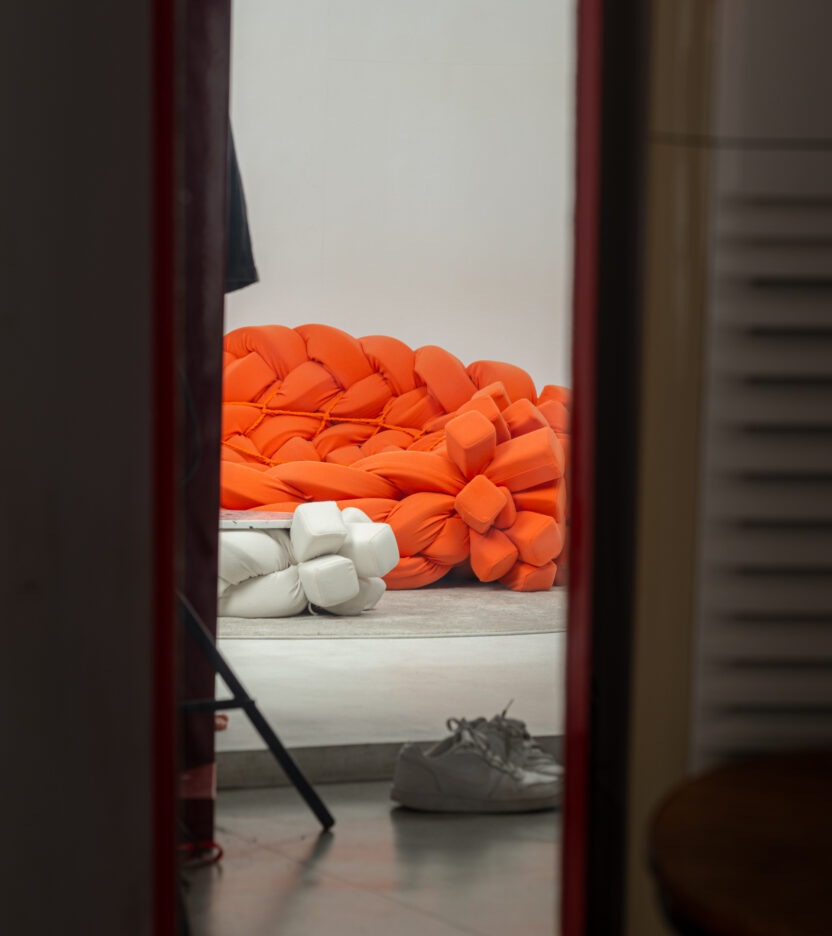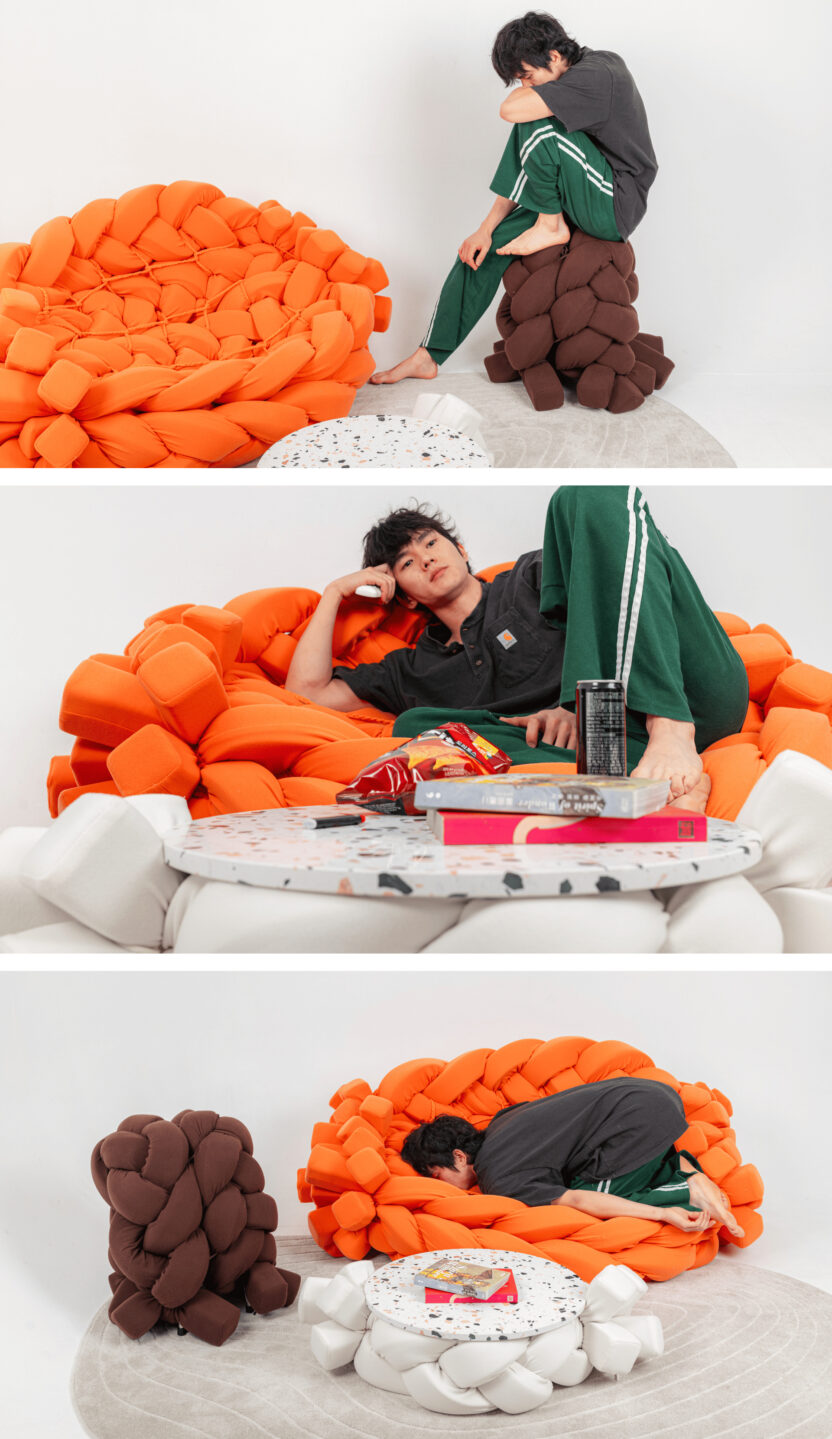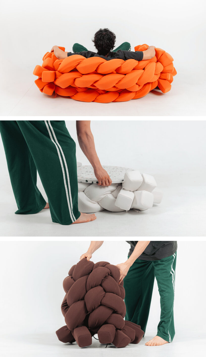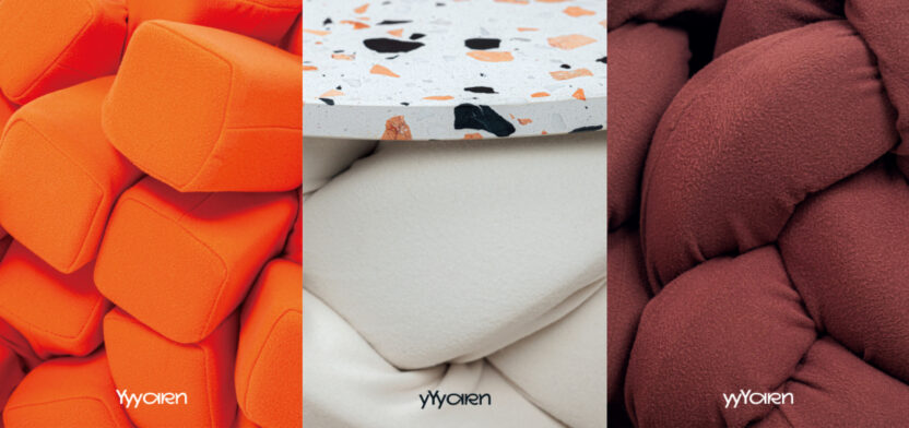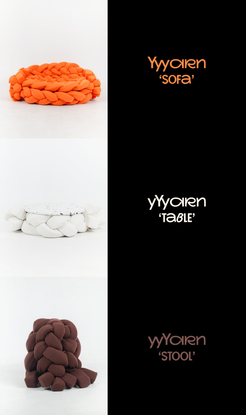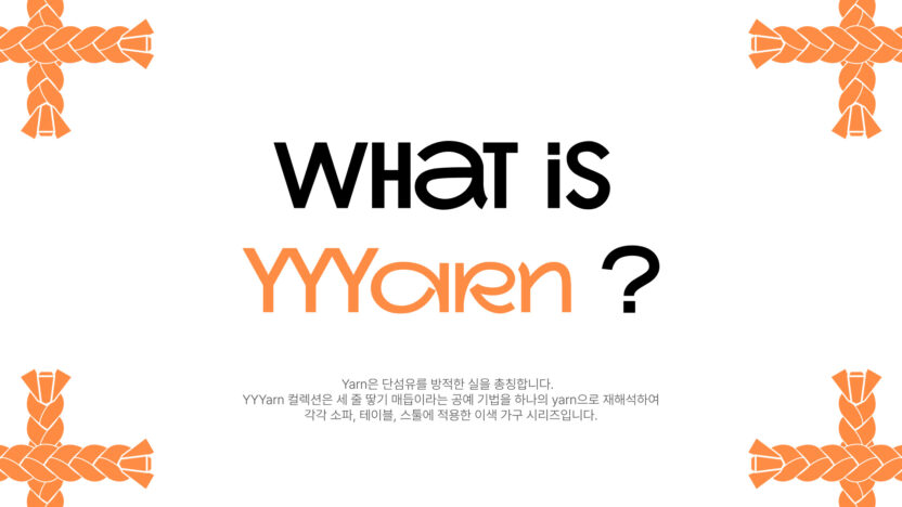Yarn은 단섬유를 방적한 실을 총칭합니다. 이에 영감을 받은 'YYYarn'은 세 줄 땋기 매듭이라는 공예 기법을 하나의 Yarn으로 재해석하여 각각 소파, 테이블, 스툴에 적용한 이색 가구 시리즈입니다.