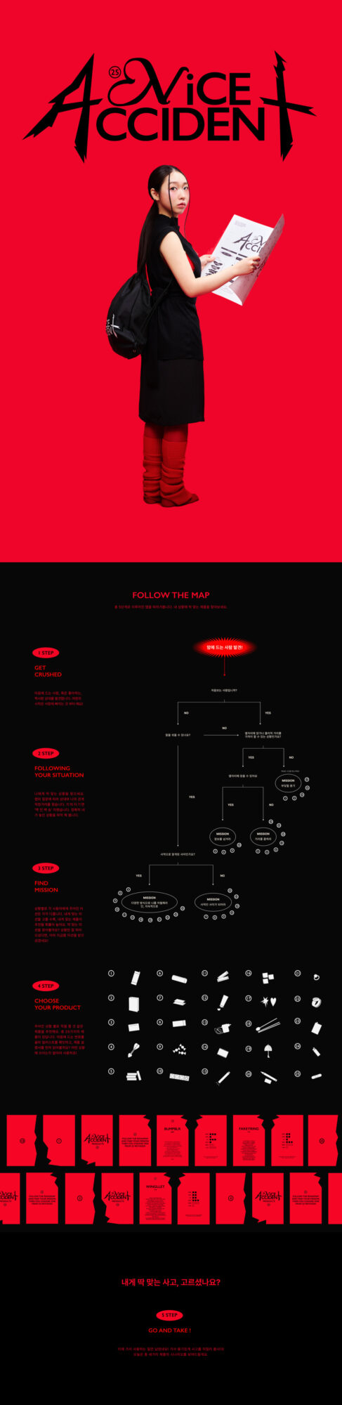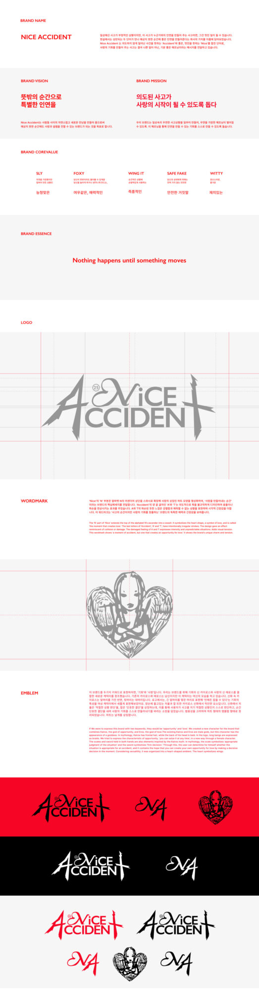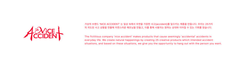 가상의 브랜드 'NICE ACCIDENT'는 일상 속에서 우연을 가장한 사고(accident)를 일으키는 제품을 만듭니다. 우리는 총 25가지의 의도된 사고 상황을 연출해 자연스러운 해프닝을 만들고, 이를 통해 사용자는 원하는 상대와 이어질 수 있는 기회를 얻게 됩니다. 사랑의 신 에로스와 기회의 신 카이로스의 융합을 형상화한 이 브랜드는, 우리가 '사랑의 기회'를 스스로 만들수 있도록 도와주며, 제품을 통해 우리의 사랑에 용기를 북돋워줍니다.