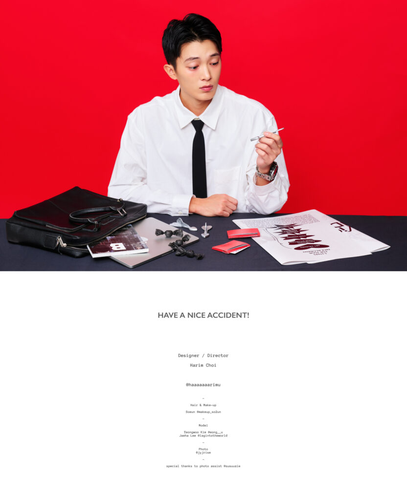 The fictions company 'NICE ACCIDENT' makes products that cause seemingly 'accidental' accidents in everyday life. We create natural happenings by creating 25 creative products which intended accident situations, and based on these situations, we give you the opportunity to hang out with the person you want. This brand, which embodies the fusion of Eros, the god of love, and Kairos, the god of opportunity, helps us create our own ‘opportunities for love’ and encourages our love through products.