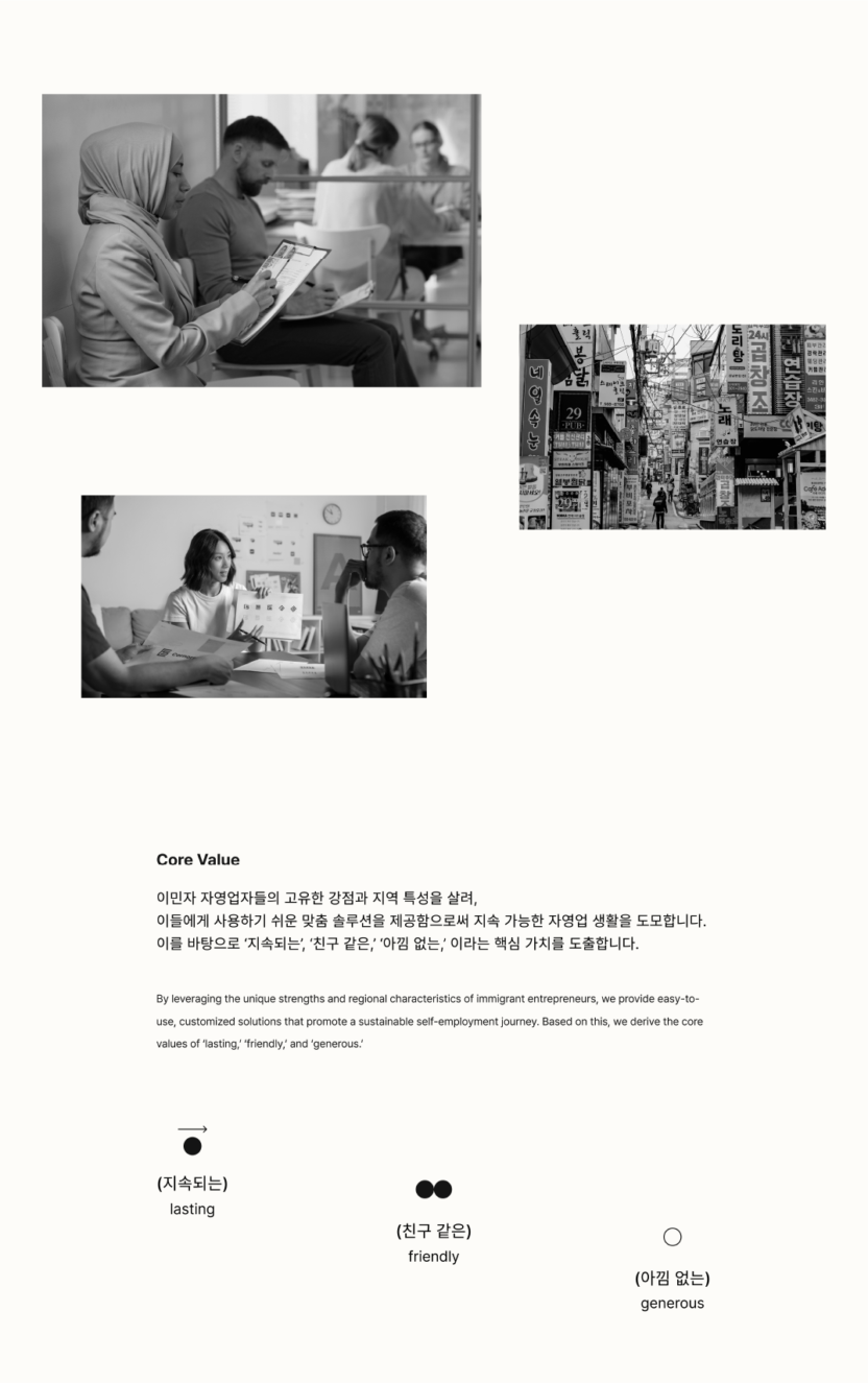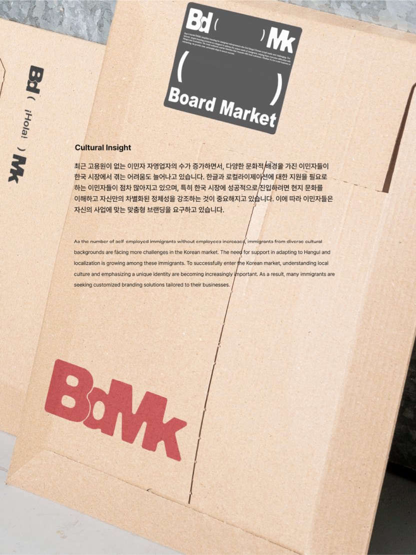 Board Market(BdMk)은 한글이 이색적이고 어려운 이민자 자영업자들을 위해 브랜딩을 간소화합니다. 이들의 독특한 필요에 맞춘 간단한 맞춤형 브랜딩은 한글과 로컬라이제이션에서 겪는 이민자들의 어려움을 해결하며, 현지 고객들에게 공감받을 수 있는 진정성 있는 마켓을 만듭니다. 신규 사업이든 리브랜딩이든 명확하고 실천 가능한 단계를 제시합니다.
