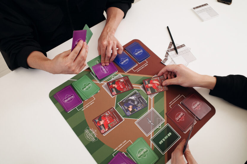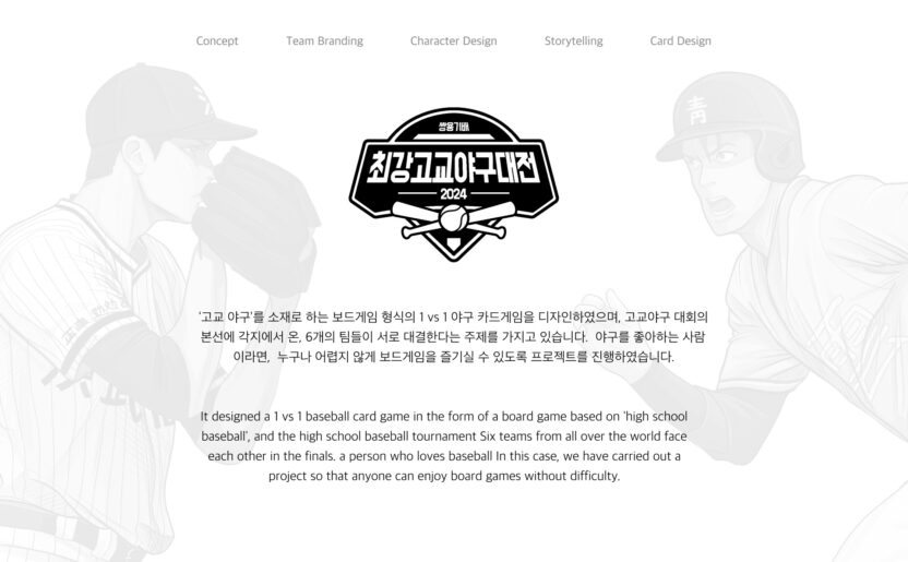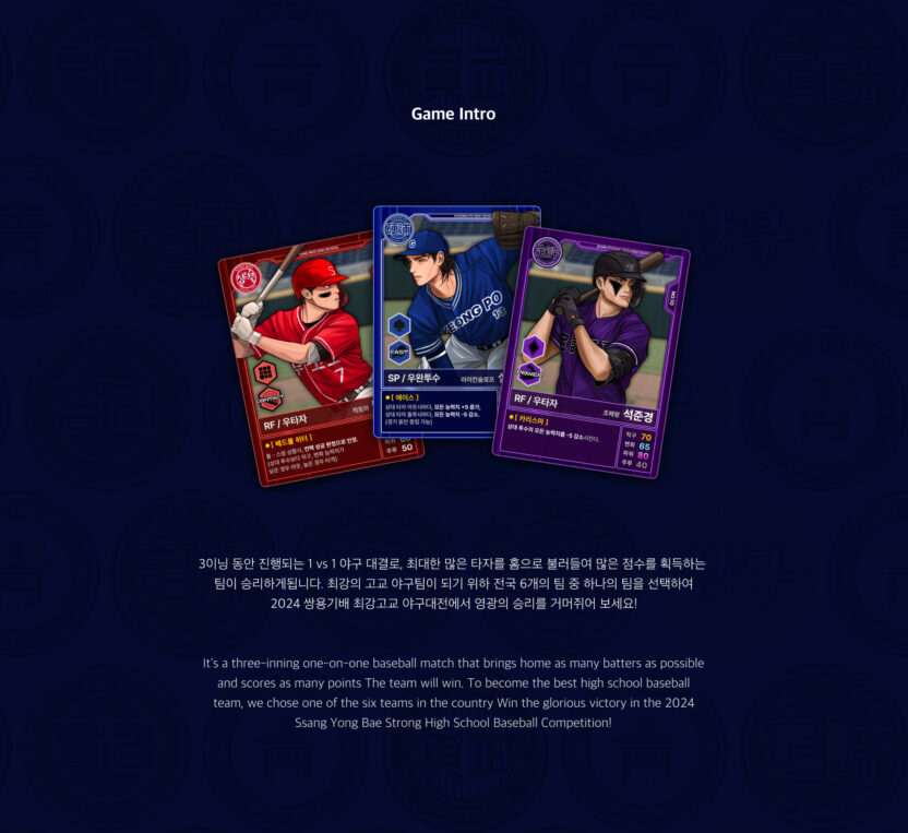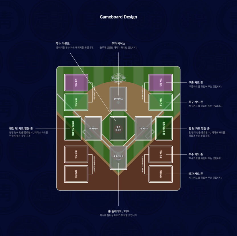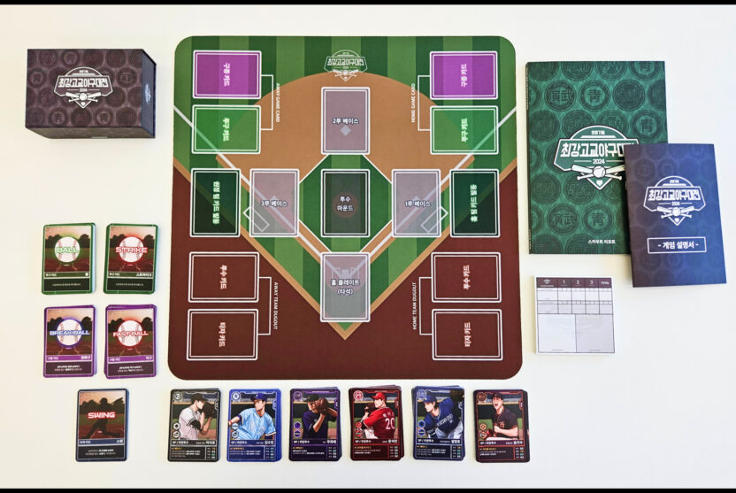 최강고교야구대전'은 6개의 가상의 고교야구 팀을 소재로 1vs1로 즐기는 보드게임입니다. 플레이어는 6개의 팀 중 원하는 팀을 각자 선택해 서로 공수를 전환하며 총 3이닝 동안 카드를 이용하여 보드게임을 즐길 수 있습니다. 야구를 좋아하시는 분이라면 누구나! 부담 없이 '최강고교야구대전'을 즐기실 수 있습니다.