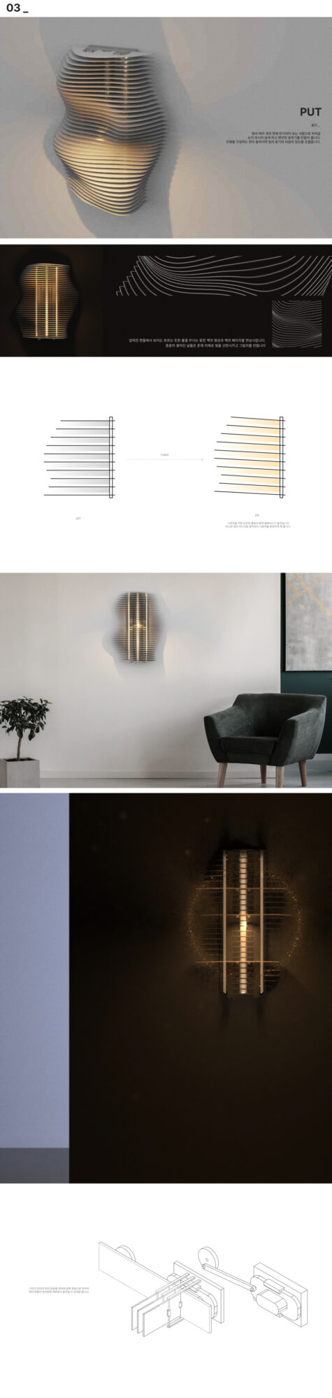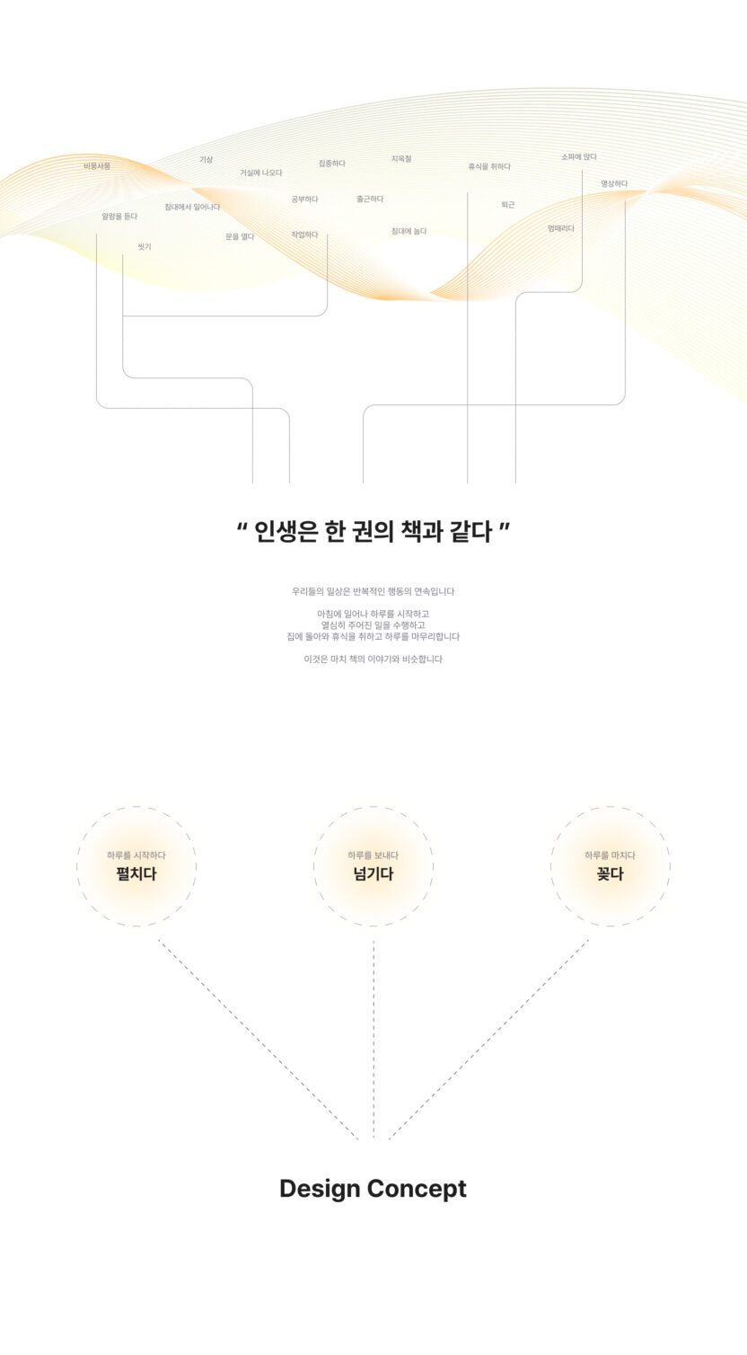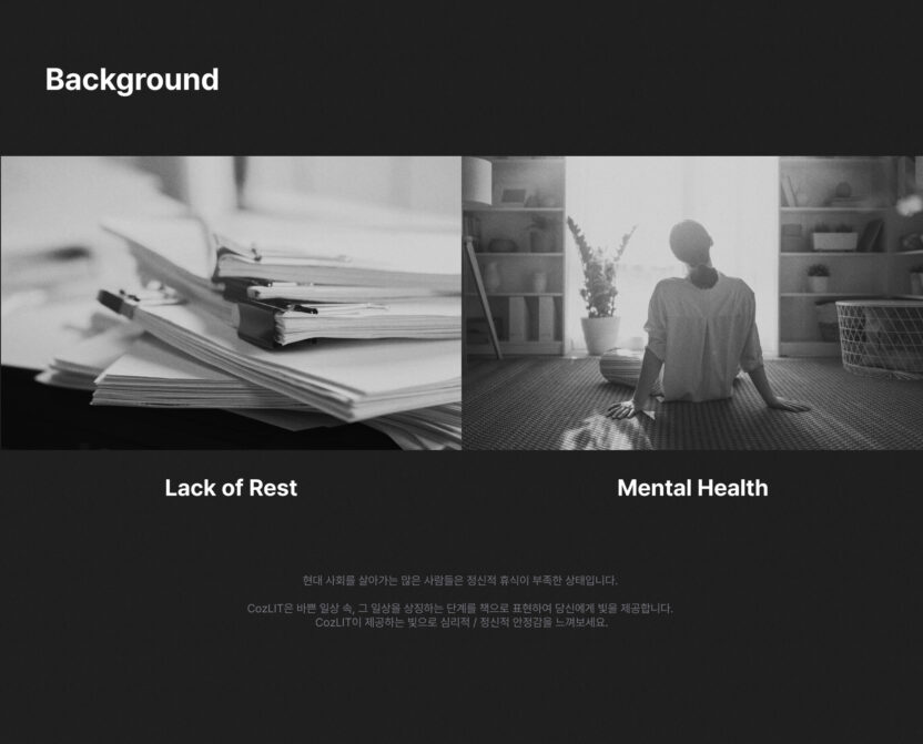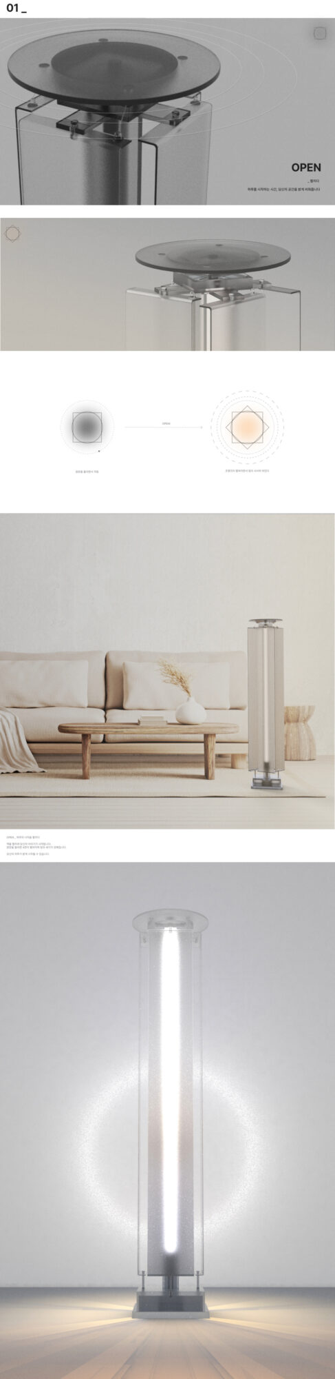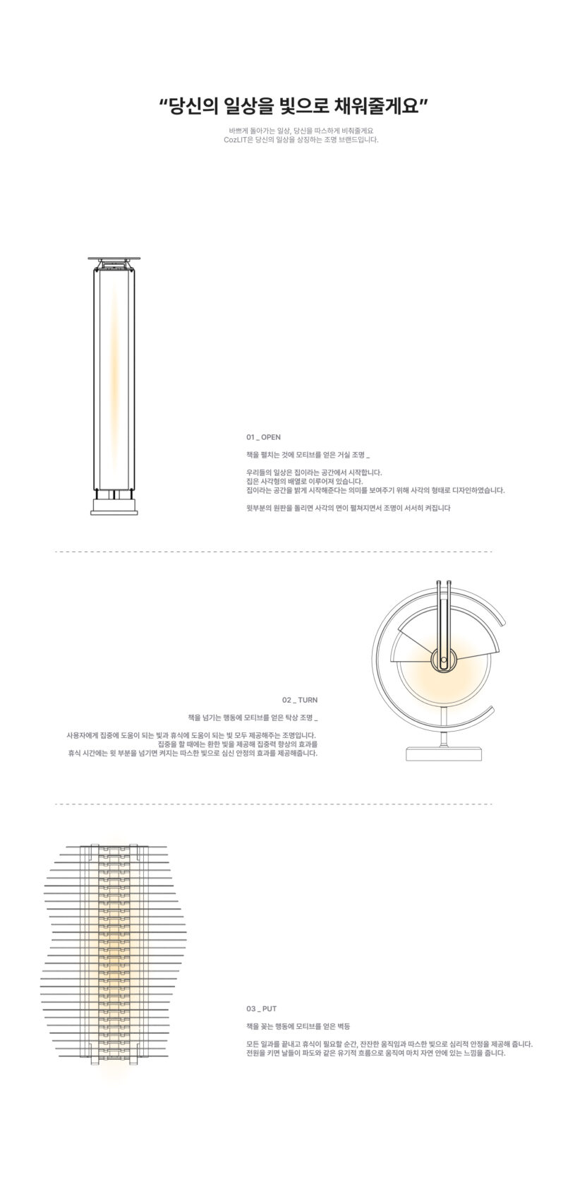 사람들은 아침에 일어나 하루를 시작하고, 열심히 주어진 일을 수행하고, 집으로 돌아와 휴식을 취하고 하루를 마무리합니다. 이것은 마치 책이 펼쳐지고, 페이지가 넘어가고, 책을 덮고 꽂는 순간과 같습니다. COZLIT은 책을 넘기고, 펼치고 꽂는 동작들에서 영감을 받아 탄생한 조명입니다. 단순한 조명이 아닌, 책과 함께하는 순간의 따스함과 설렘을 담아내어 특별한 경험을 선사합니다. 조명을 펼쳐 불을 밝히고, 넘겨서 밝기를 조절합니다. 이 모든 행위는 COZLIT을 익숙하면서도 색다른 조명으로 만들어 줍니다.