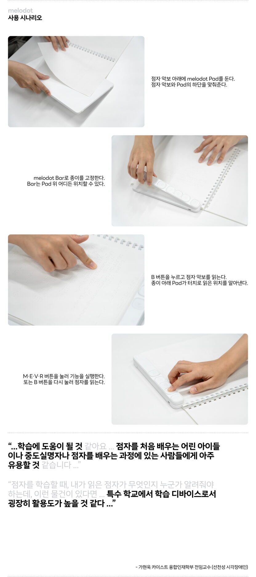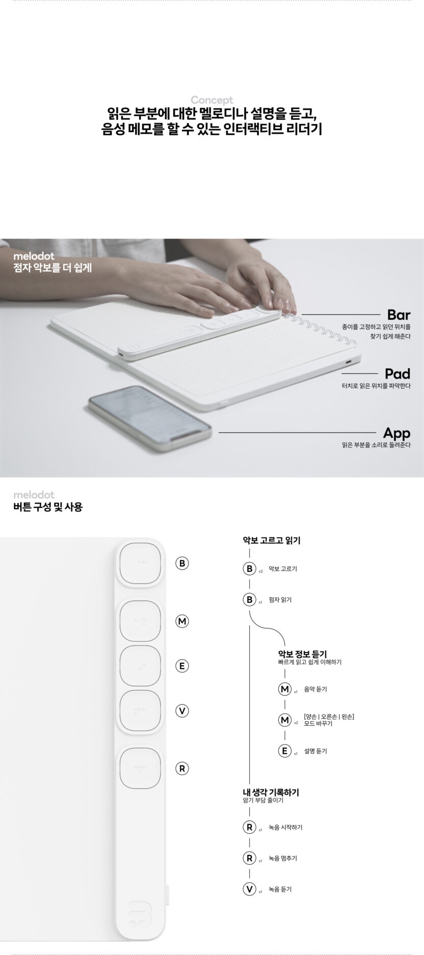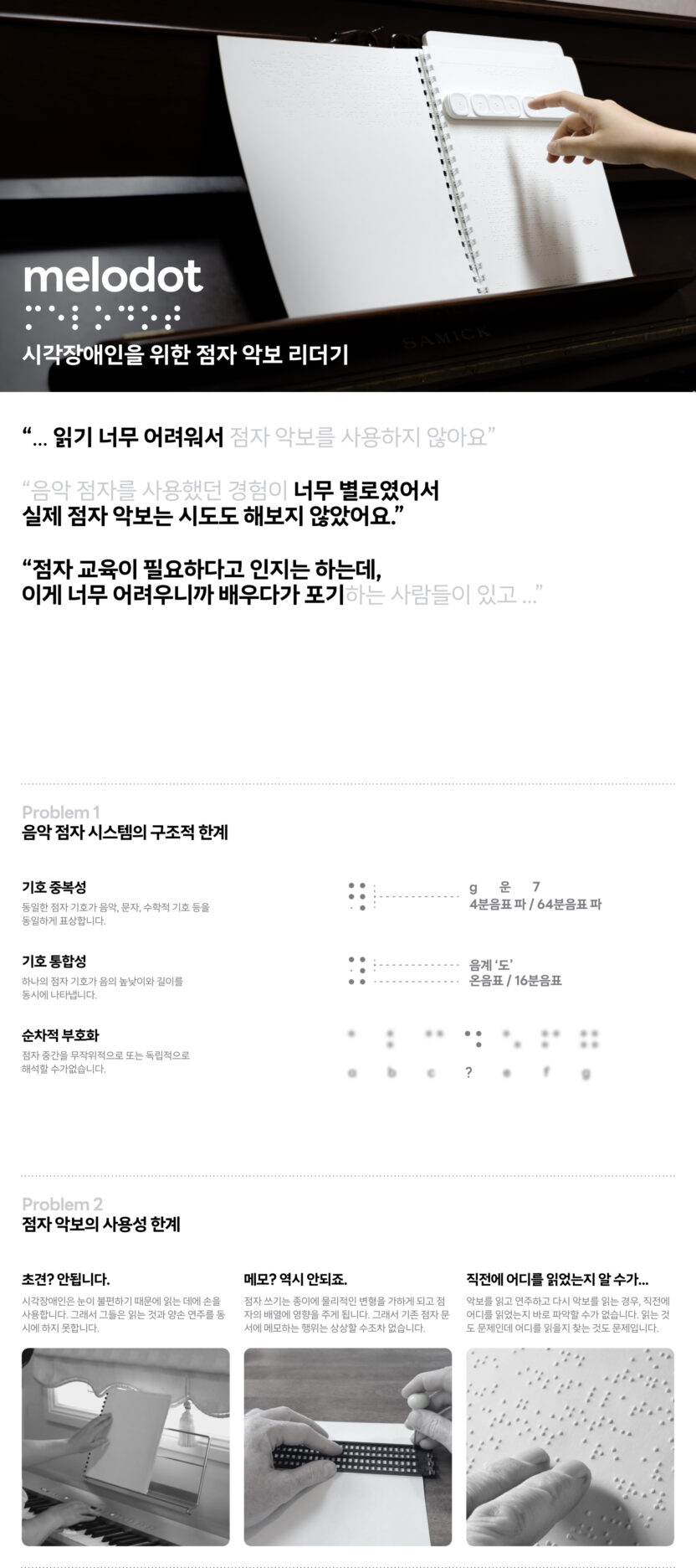 <melodot>은 시각장애인을 위한 새로운 점자 악보 리더기이다. 점자의 구조적 문제로 인해 점자 악보는 시각장애인의 음악 학습에 있어서 진입 장벽이 되곤 한다. 이 제품은 터치 패널을 도입하여 종이 점자 악보의 새로운 활용 방안을 제시하고 그 진입 장벽을 낮추고자 한다. 또한, 음악 학습을 넘어서 시각장애인과 비시각장애인 간의 정보 격차 해소에도 도움을 줄 것으로 기대한다.