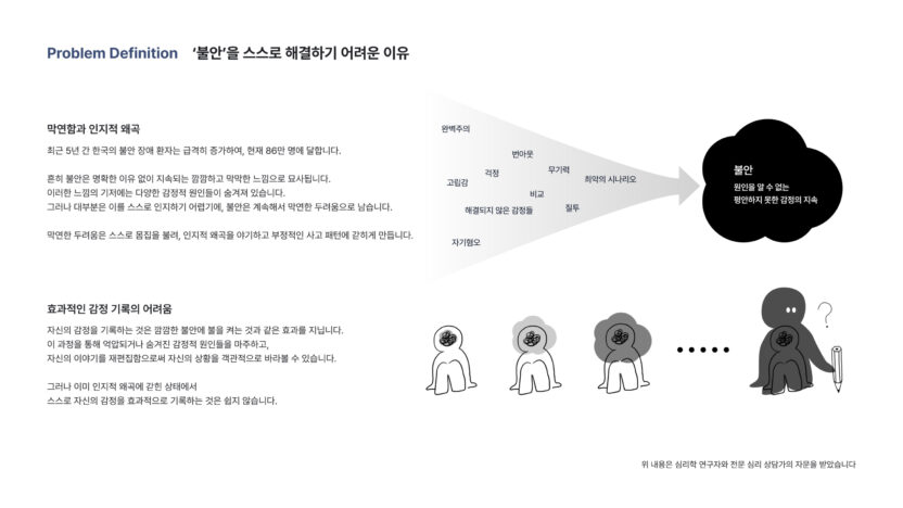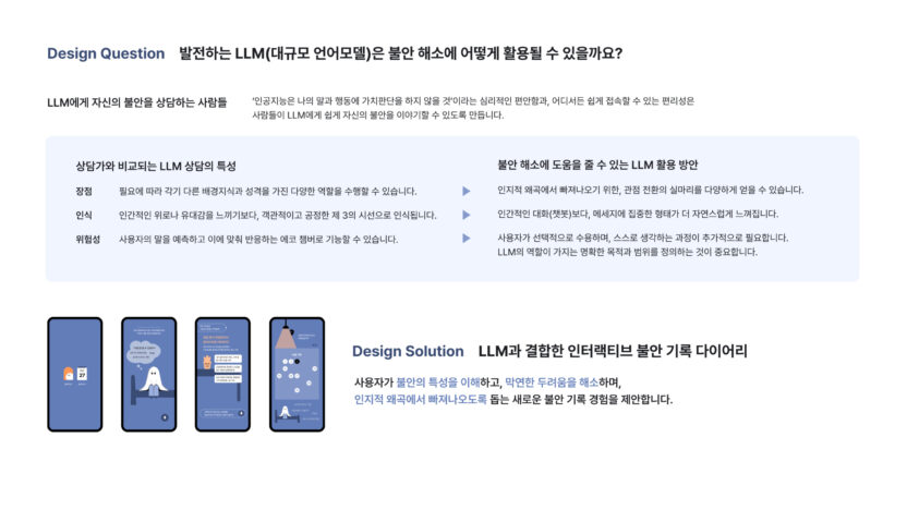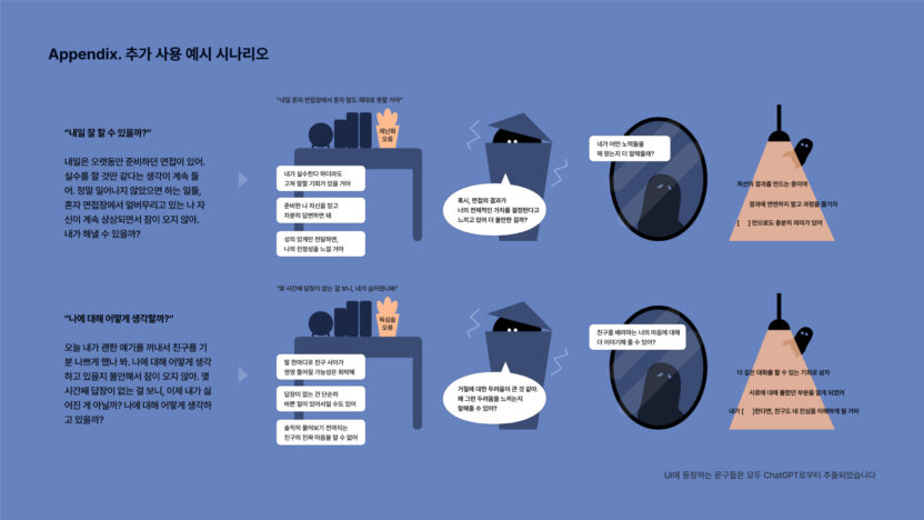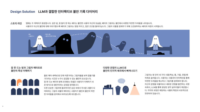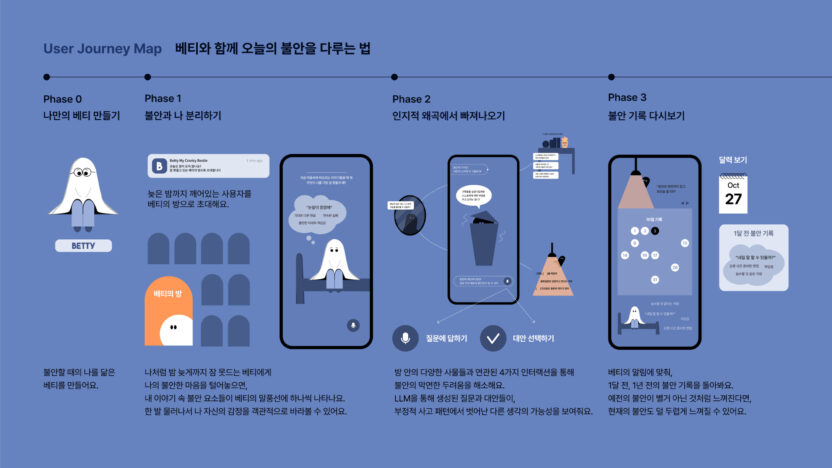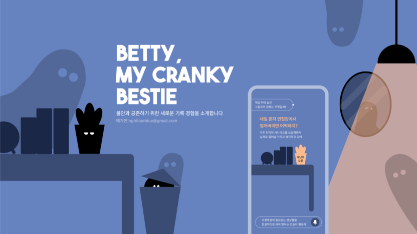 <Betty, My Cranky Bestie>는 LLM과 결합된 인터랙티브 감정 다이어리 서비스이다. 사용자는 자신의 불안을 투사한 존재의 여정을 따라가며 마음을 들여다보고, 터널 시야에서 벗어난다.