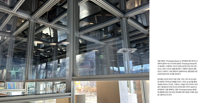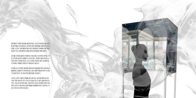 는 감각에 대한 예민함으로써 편두통에 대한 새로운 이해를 제안한다. 작품 안에 들어선 관람객은 고립된 공간에서 자신의 감각에 온전히 집중하게 되며, 거울의 역할을 동시에 하는 창을 통해 세상을 불완전하게 조망한다. 자신의 감각과 존재를 끊임없이 인지함에 따라 주변과 익숙하게 상호작용하지 못하는 경험은 편두통의 고통에 대한 공감의 메시지를 전한다.