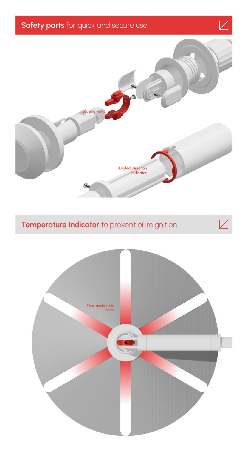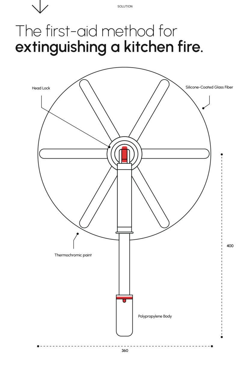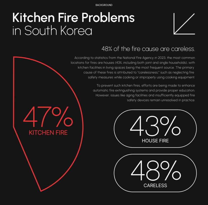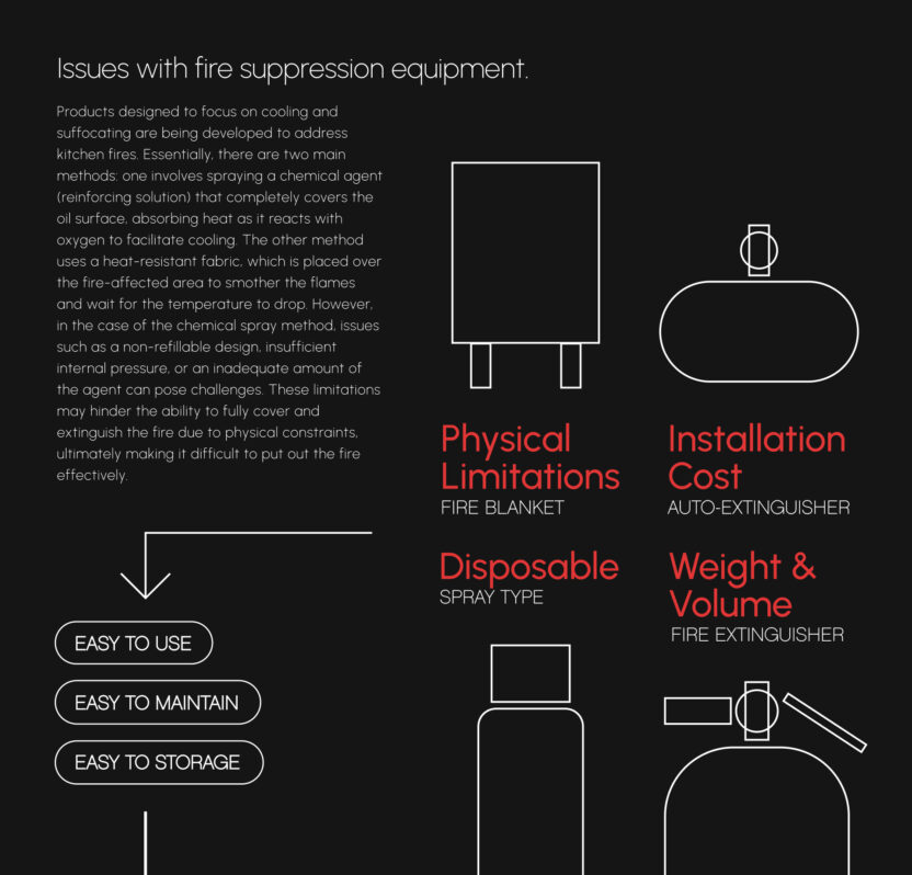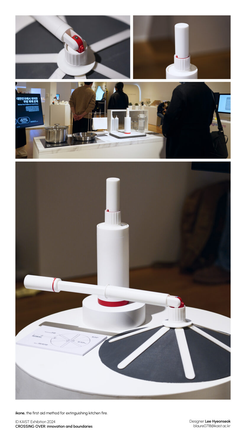<ikone>은 주방 화재에 대응할 수 있는 가장 빠르고 간편한 소화용구이다. 주방화재는 기름과 가스 등 인화성 물질을 취급하는 공간에서 발생하는만큼 적절한 방식의 초기 대응이 필요하다. 이 제품은 직관적인 사용 방식으로 초기 진압 과정에서의 오류를 최소화하며, 기존의 재래식 소화기에서 발생하는 2차 피해가 없어 화재 상황에 대한 정확한 인지 없이도 부담없이 대응할 수 있게 도와준다.