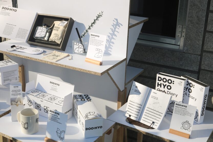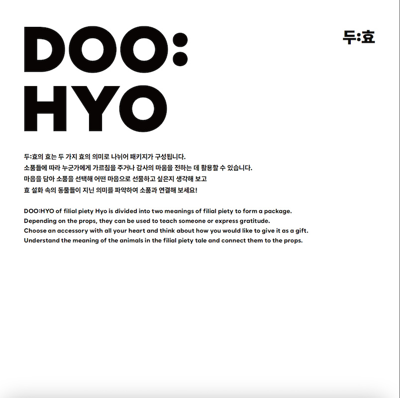 대전 중구의 효문화진흥원을 통해 현대적 효의 가치를 탐구하고, 이를 기반으로 ‘두효’라는 효 소품 브랜드를 기획했다. 이 브랜드는 부모와 자녀 간의 소통을 증진하고, 효의 긍정적인 이미지를 부각하기 위해 두 가지 의미를 담은 소품으로 구성되어 있다. 최종적으로 다양한 세대가 함께 효를 실천할 기회를 제공하는 것을 목표로 하였다.