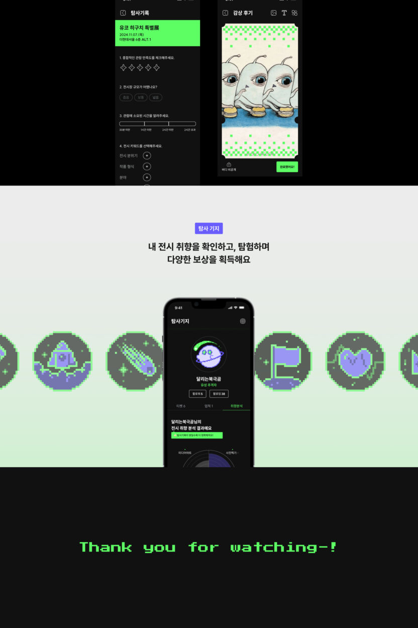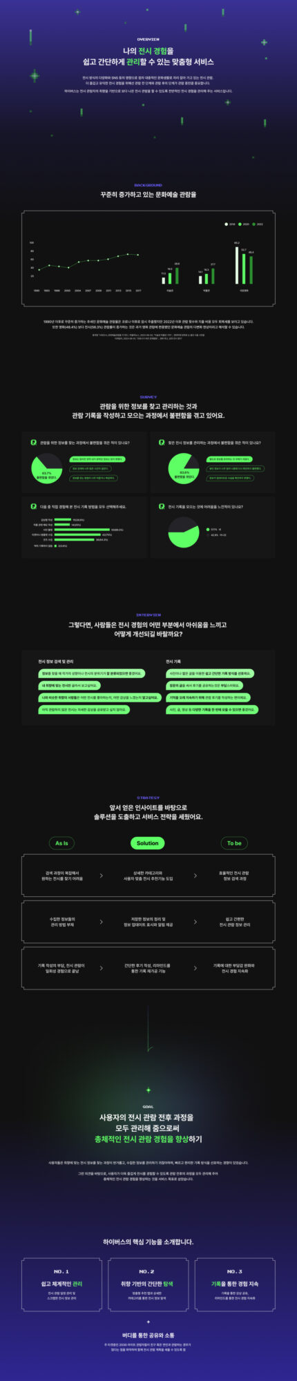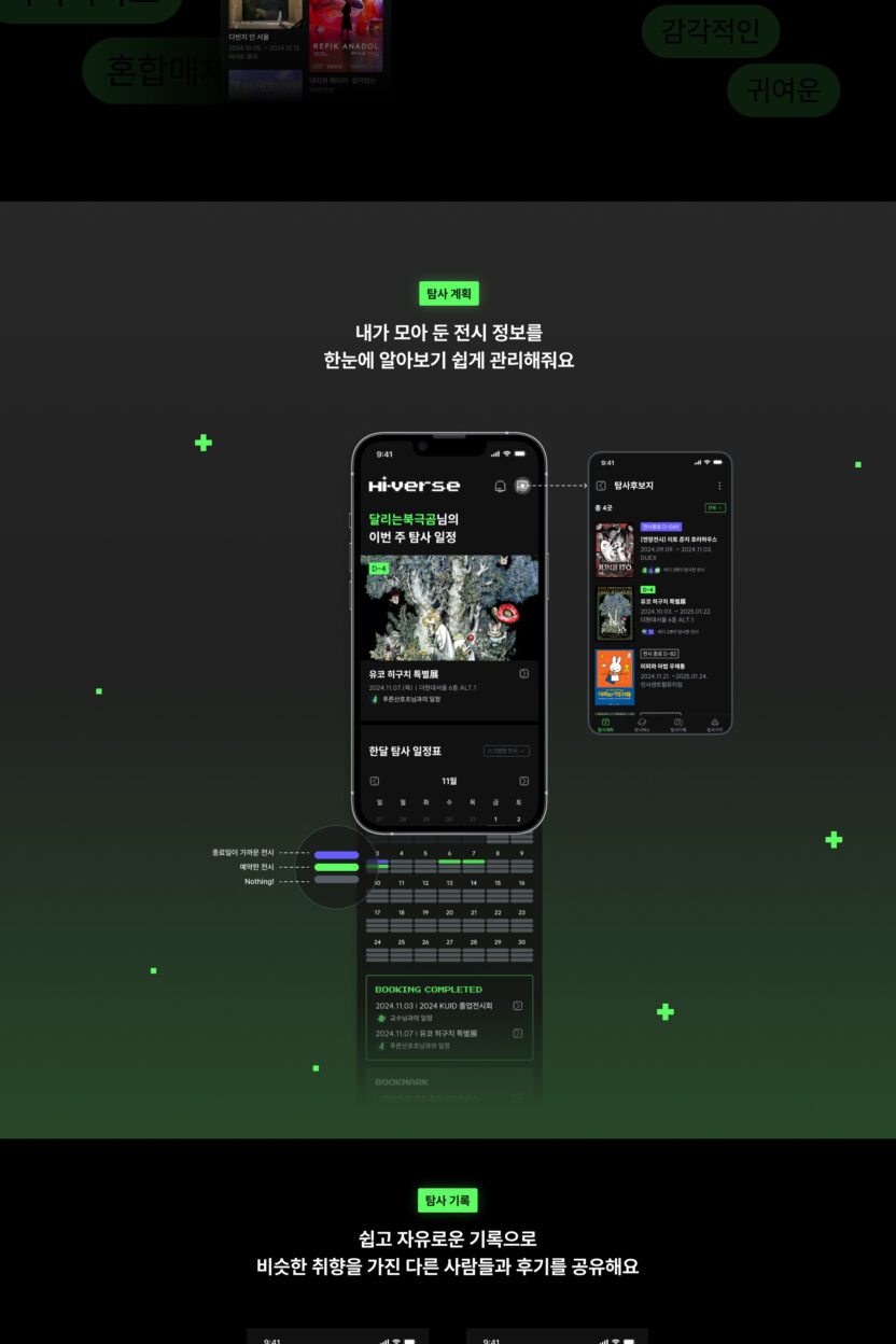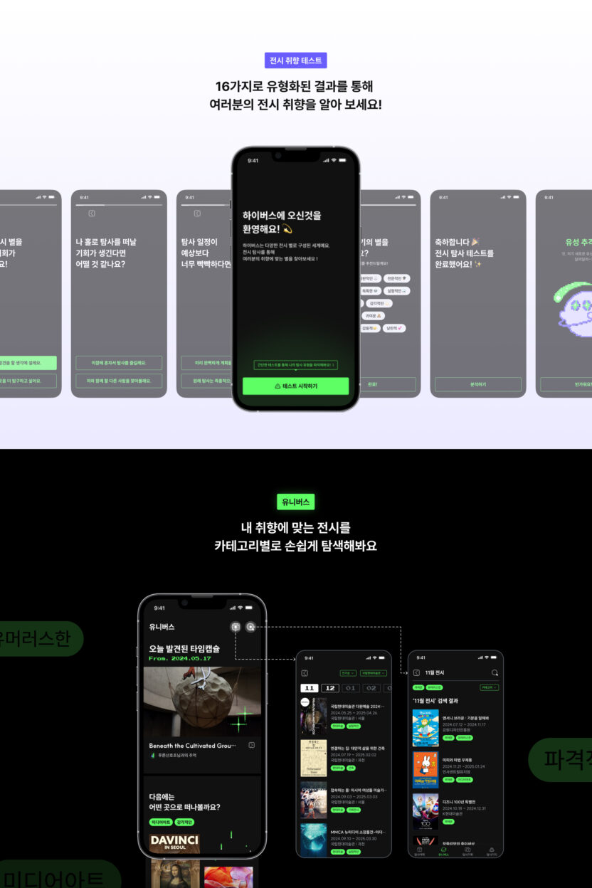 전시 관람은 점차 대중적인 문화생활로 자리 잡았지만, 관람자가 겪는 경험은 여전히 불편한 부분이 많습니다. 이에 하이버스는 전시 관람을 위한 모든 과정을 '전시 경험'으로 정의하고, 관람 전후 단계를 체계적으로 관리해 사용자가 더 즐겁고 유익한 전시 경험을 누릴 수 있도록 도와줍니다. 이제 번거롭고 일회적으로 끝나는 전시 관람은 잊고, 하이버스에서 쉽고 재미있게 전시를 탐사해 보세요!