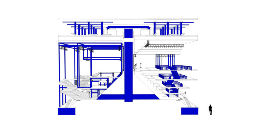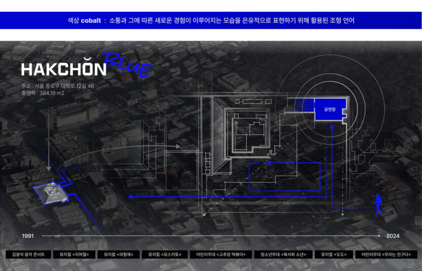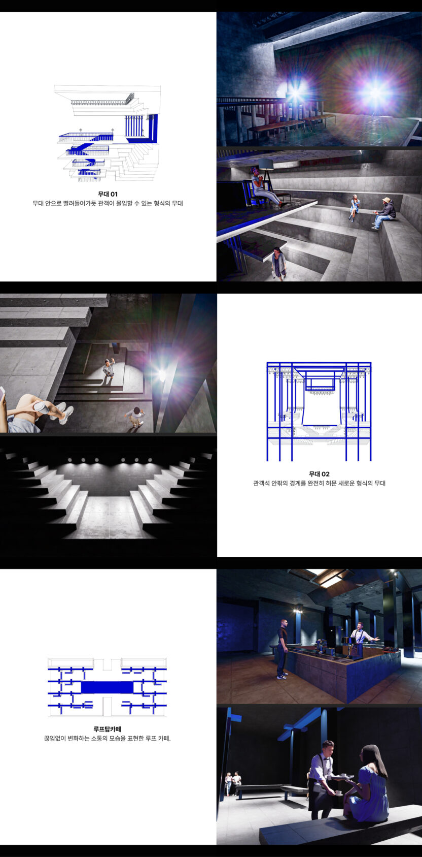 사이트로는 33년간 새로운 도전과 연극계의 가능성을 탐구해 온 학전 블루 소극장을 선정하였으며, 기존 공간의 제약을 벗어나 완전한 소통의 무대가 될 수 있도록 건물을 재설계하였습니다. 공간 설계 위해 소통을 네 가지 유형으로 분류하여 분석하고 이를 공간 언어로 시각화하는 과정을 거쳤습니다. 전반적인 공간은 사람 간의 소통하는 모습에서 영감을 받아 소통의 형태가 심화되고 변모하는 과정을 공간 안에 담아 소통 자체가 하나의 연결된 공간 장치로 느껴지게 하였습니다. 그리고 계단 형식을 활용하여 사용자들의 동선이 공간 안에서 경계 없이 흐르도록 하였습니다. 사용자들의 동선을 통해 관객석과 무대를 구분짓던 기존의 형식을 자연스럽게 벗어날 수 있게 됩니다.