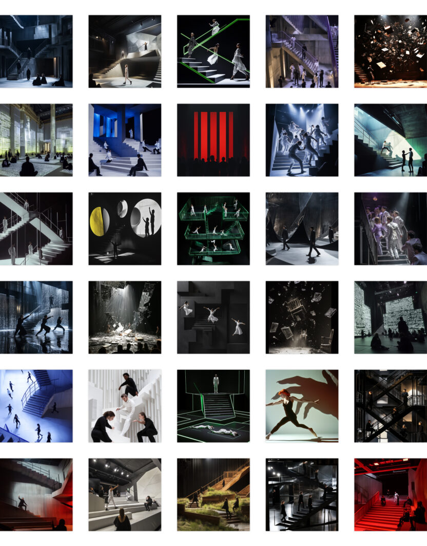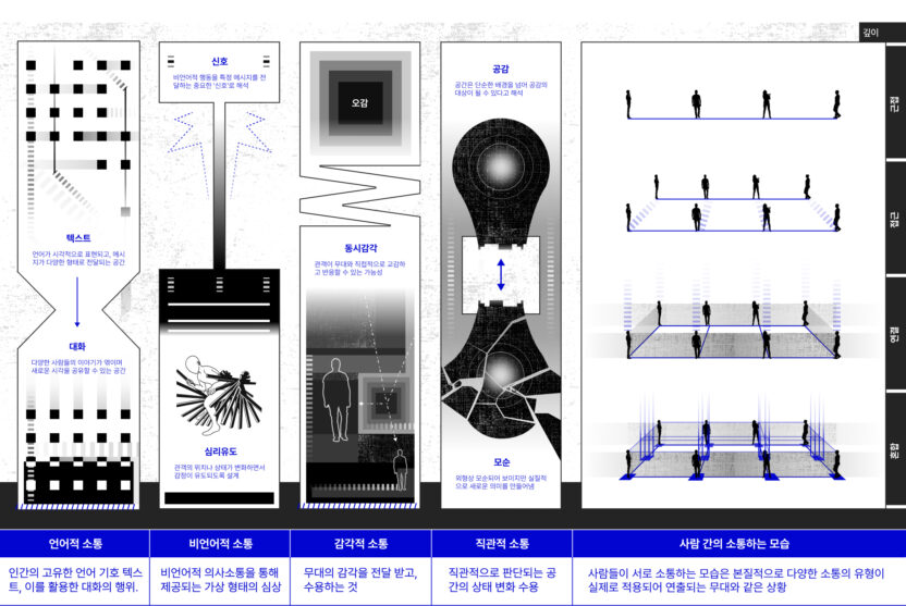 소통의 유형에서 더욱 세분화된 여러 방식들은 공간 내부에서 연출되는 연극 프로그램에 적용되었습니다. 이들의 다양한 공연 장면은 AI 프로그램인 ‘MidJourney’를 활용하여 제작된 연출 이미지로 감상할 수 있습니다.