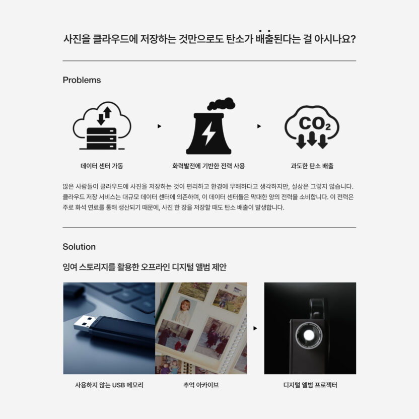 사진을 클라우드에 저장할 때 발생하는 탄소 배출 문제를 해결하기 위해, 빔 프로젝터가 결합된 개인 이미지 저장 데이터 센터를 제안합니다. Filum은 아날로그 앨범의 감성을 유지하면서, 사용하지 않는 USB 메모리를 활용하여 오프라인 디지털 앨범의 개념을 구현합니다. 이를 통해 탄소 배출을 줄이고, 사용자가 소중한 추억을 더욱 깊이 간직할 수 있도록 돕습니다.