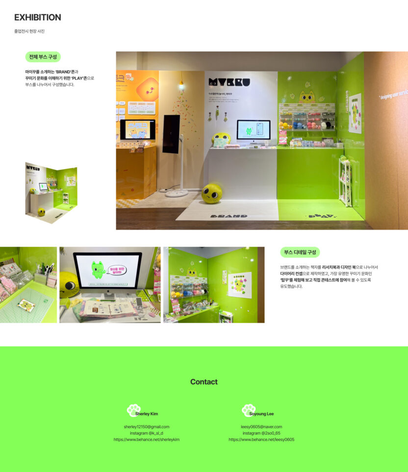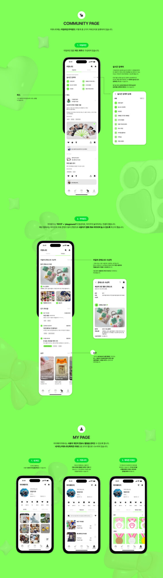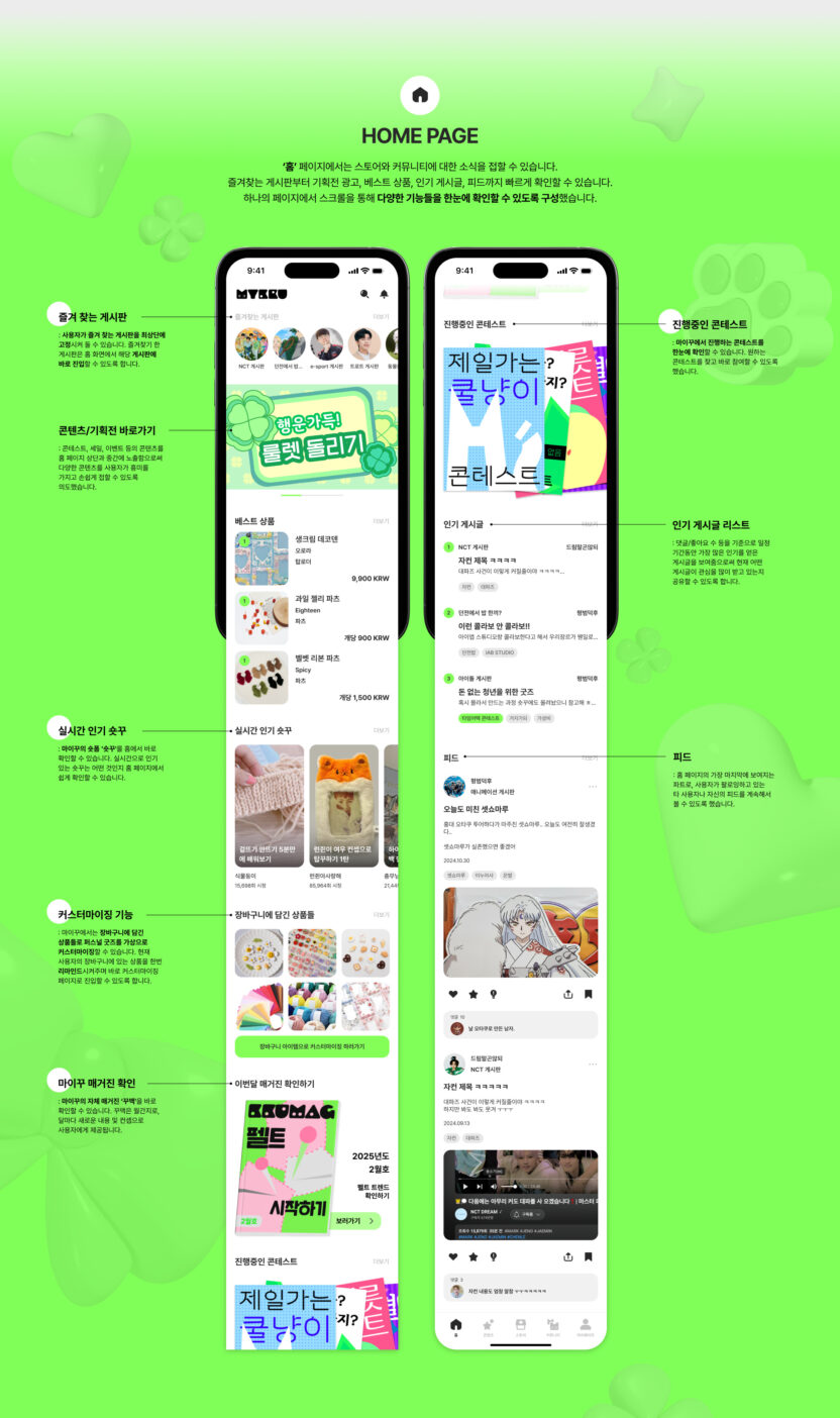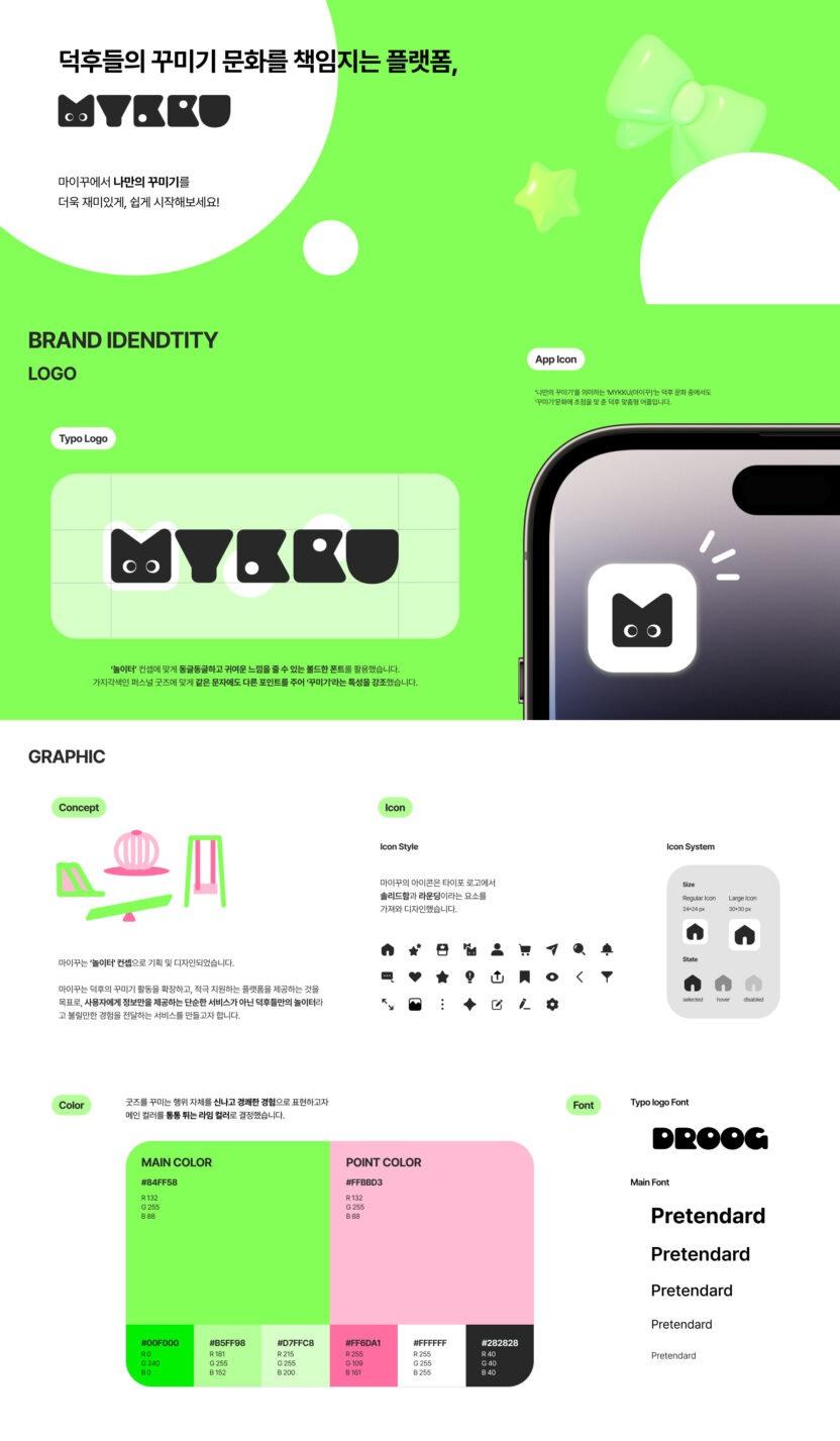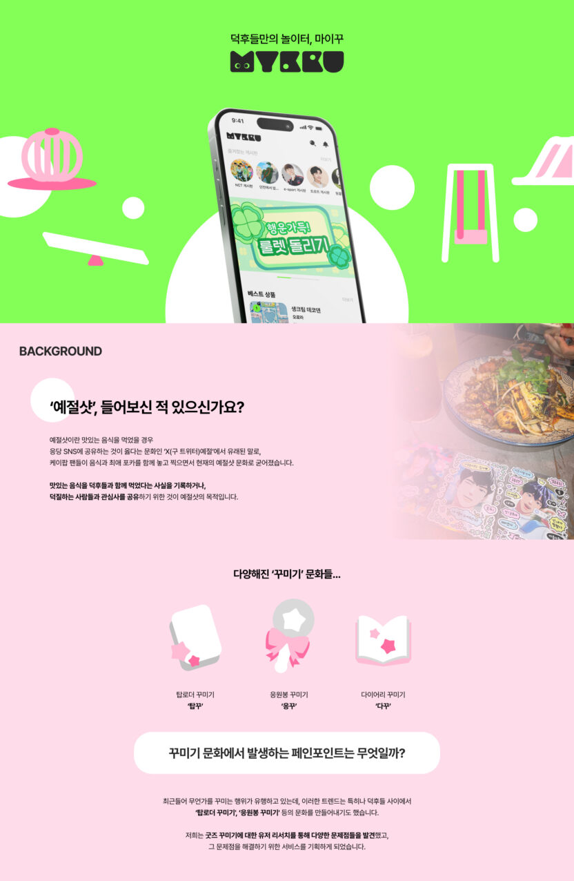 ‘나만의 꾸미기'를 의미하는 ‘MYKKU(마이꾸)’는 덕후 문화 중에서도 ‘꾸미기'에 초점을 맞춘 덕후 맞춤형 어플입니다. 마이꾸는 스토어 뿐만 아니라 커뮤니티, 콘텐츠 등 다양한 종류의 경험을 제공합니다. 다양한 활동을 통해 재미와 자극을 받는 마이꾸에서의 경험을 ‘놀이터’라는 콘셉트로 디자인했습니다. 리서치 과정에서 발견한 창작의 고통, 공유 니즈, 정보 과다의 문제를 중점적으로 해결하기 위한 기능들로 앱을 설계했습니다. 이를 통해 마이꾸는 사용자들에게 굿즈를 꾸미는 데에 필요한 각종 단계를 쉽고 재밌게 기획하여 긍정적인 덕질 라이프를 제공하고자 했습니다.
