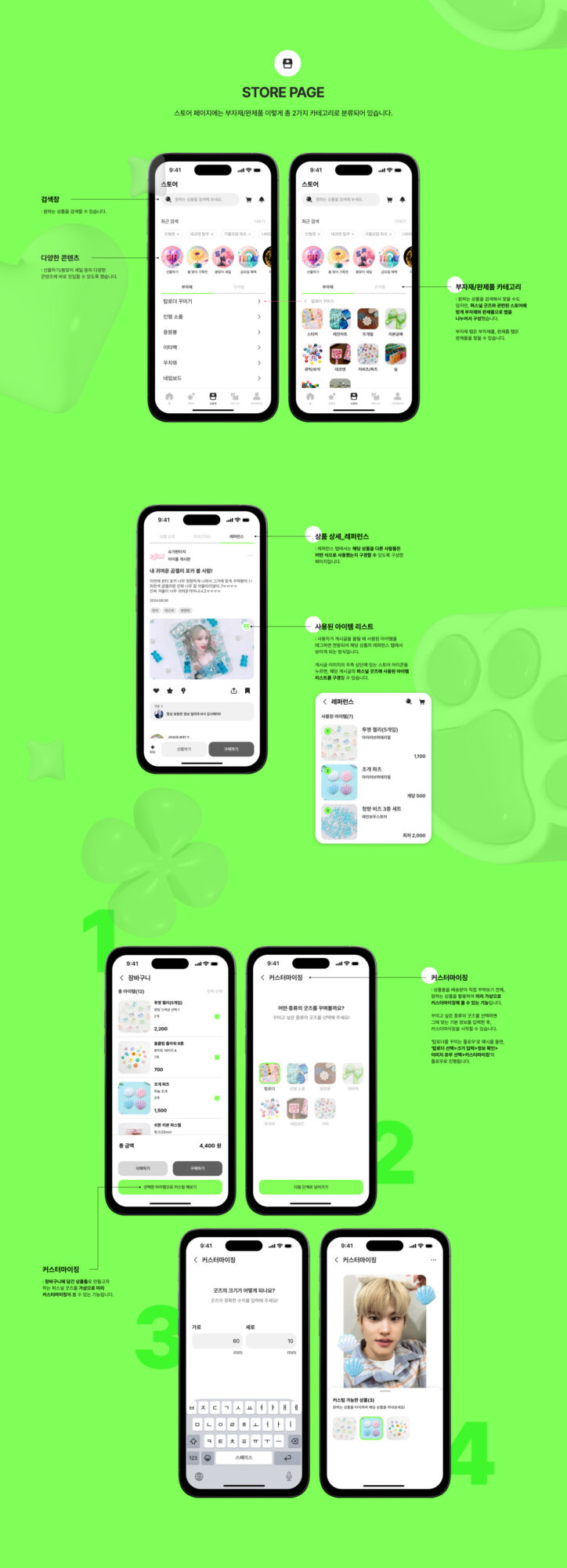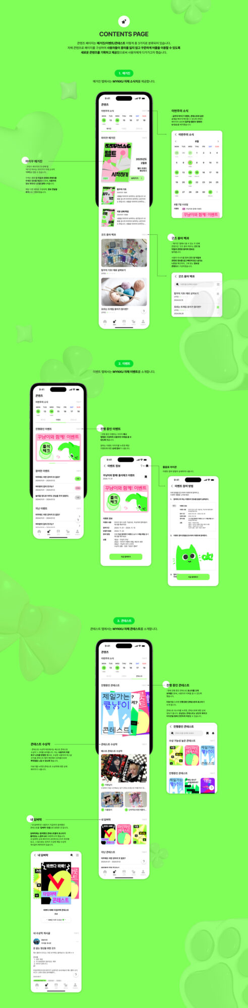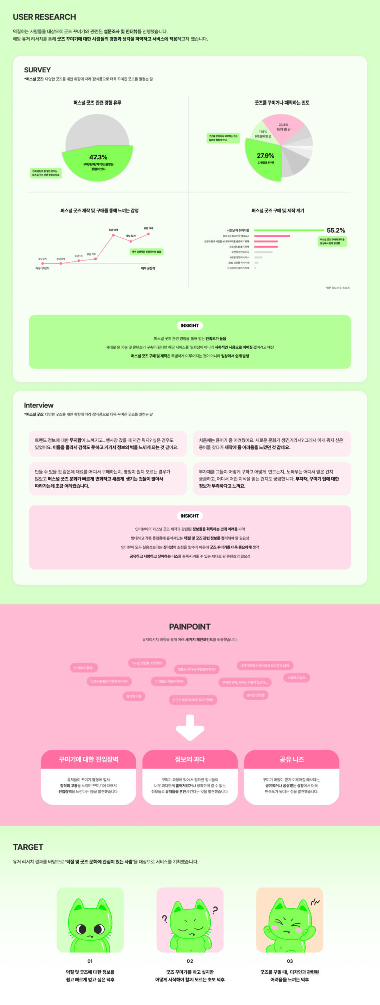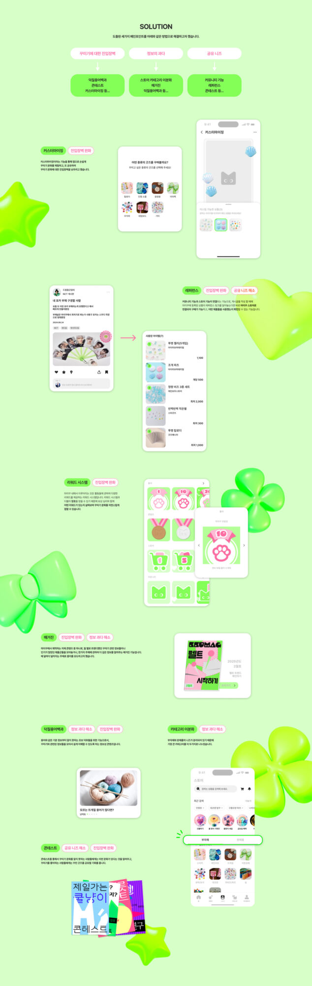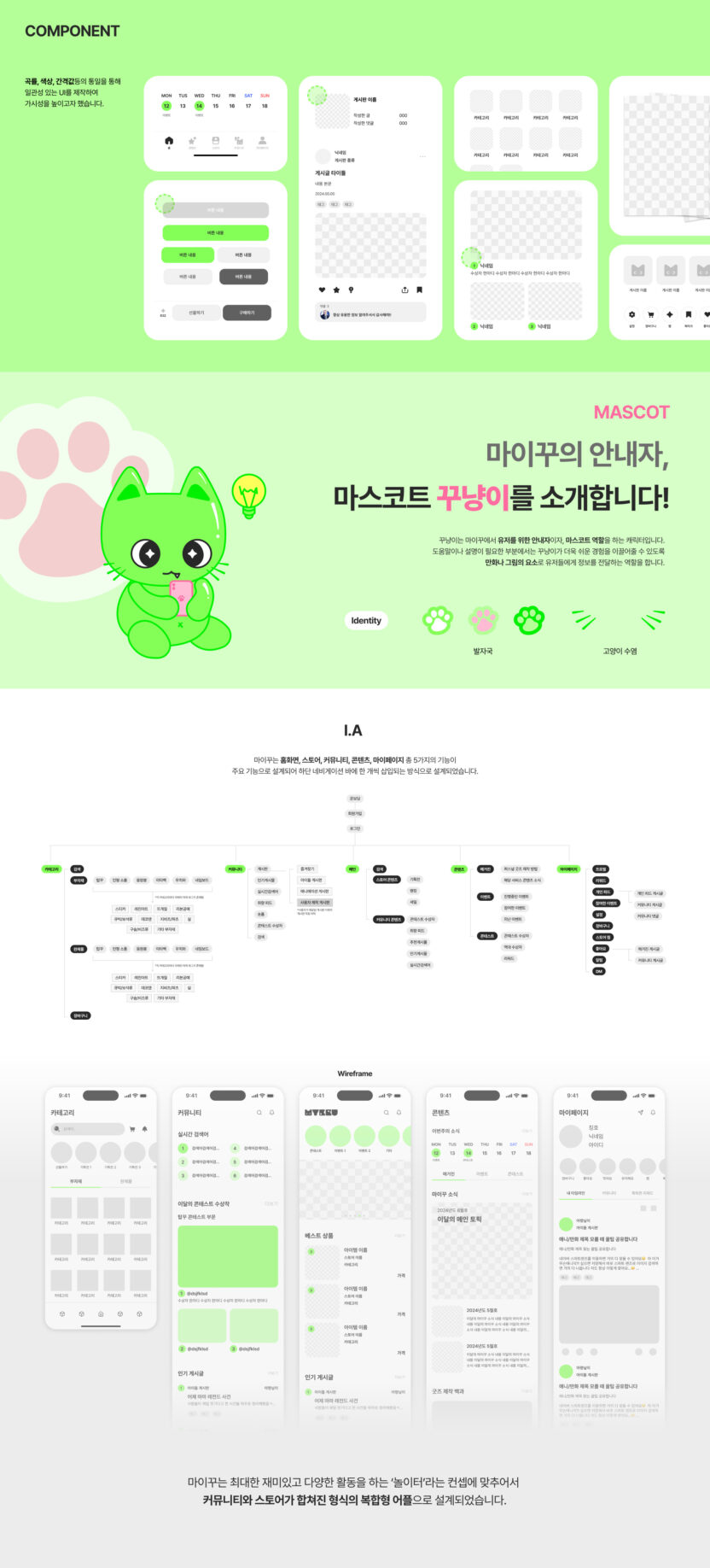 ‘나만의 꾸미기'를 의미하는 ‘MYKKU(마이꾸)’는 덕후 문화 중에서도 ‘꾸미기'에 초점을 맞춘 덕후 맞춤형 어플입니다. 마이꾸는 스토어 뿐만 아니라 커뮤니티, 콘텐츠 등 다양한 종류의 경험을 제공합니다. 다양한 활동을 통해 재미와 자극을 받는 마이꾸에서의 경험을 ‘놀이터’라는 콘셉트로 디자인했습니다. 리서치 과정에서 발견한 창작의 고통, 공유 니즈, 정보 과다의 문제를 중점적으로 해결하기 위한 기능들로 앱을 설계했습니다. 이를 통해 마이꾸는 사용자들에게 굿즈를 꾸미는 데에 필요한 각종 단계를 쉽고 재밌게 기획하여 긍정적인 덕질 라이프를 제공하고자 했습니다.