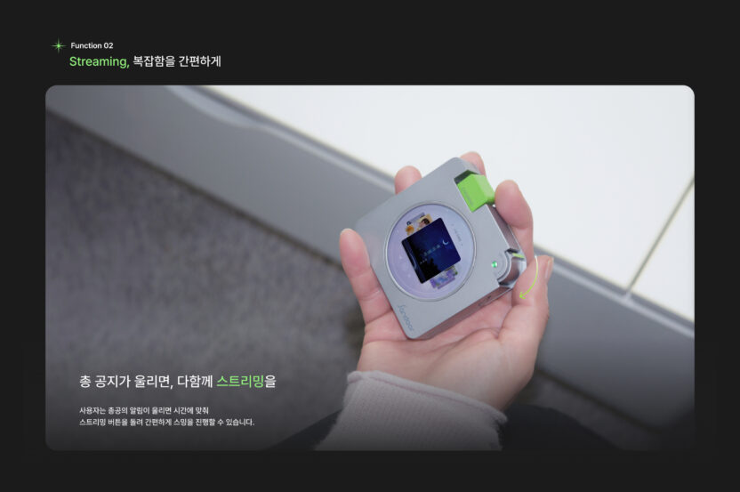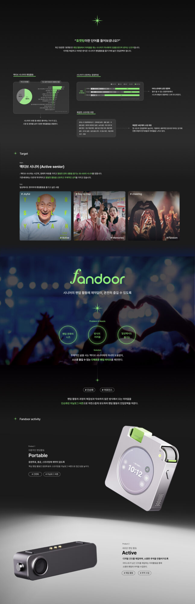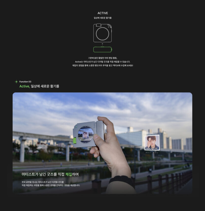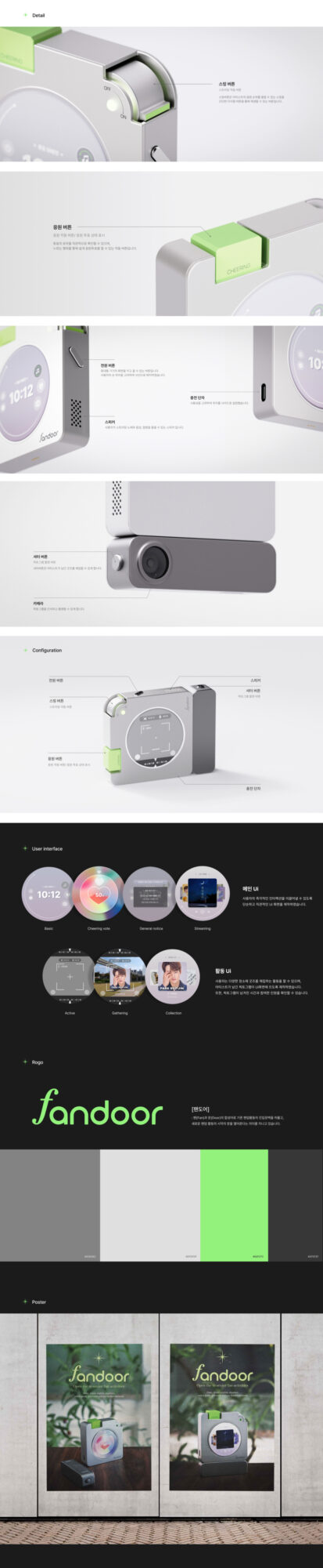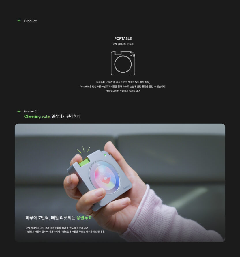 응원 투표와 스밍(스트리밍)을 간편하게 할 수 있는 휴대용 기기, 팬덤 추억을 쌓고 굿즈를 수집하는 활동 기기, 그리고 굿즈를 정리하고 간직할 수 있는 홈 기기를 통해 새로운 팬덤 라이프를 제안합니다.