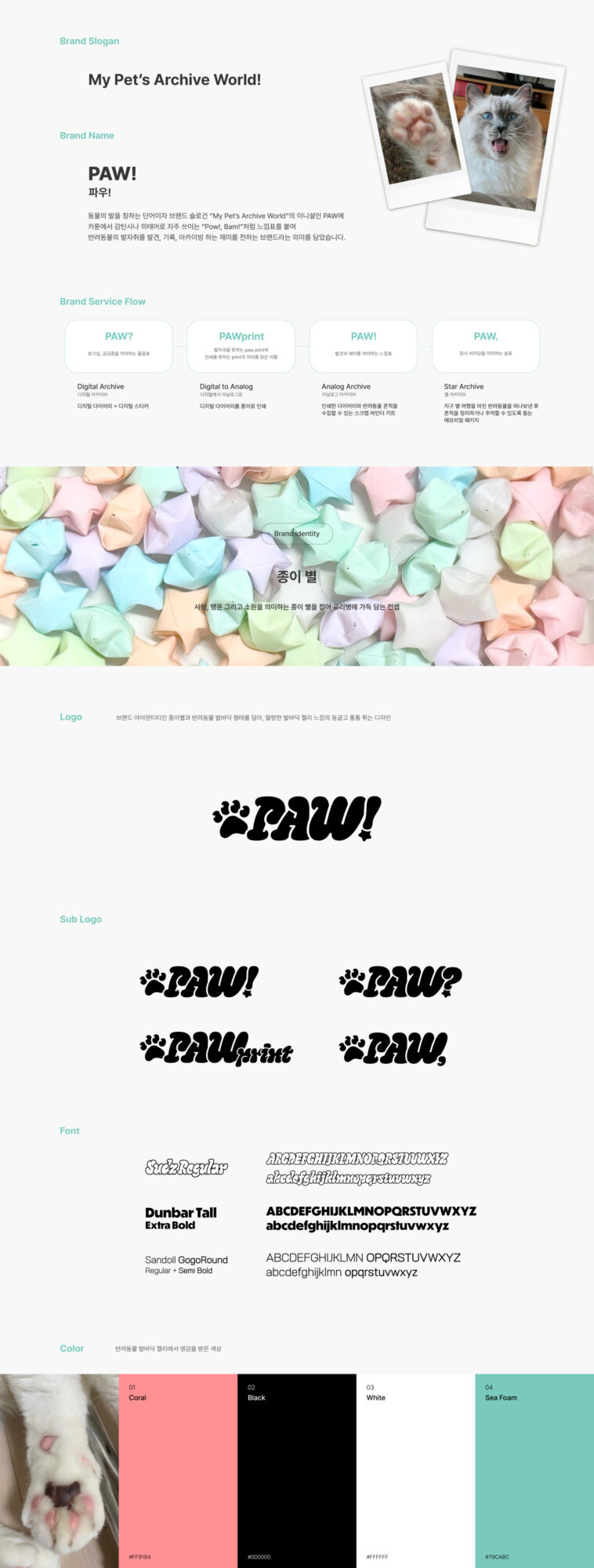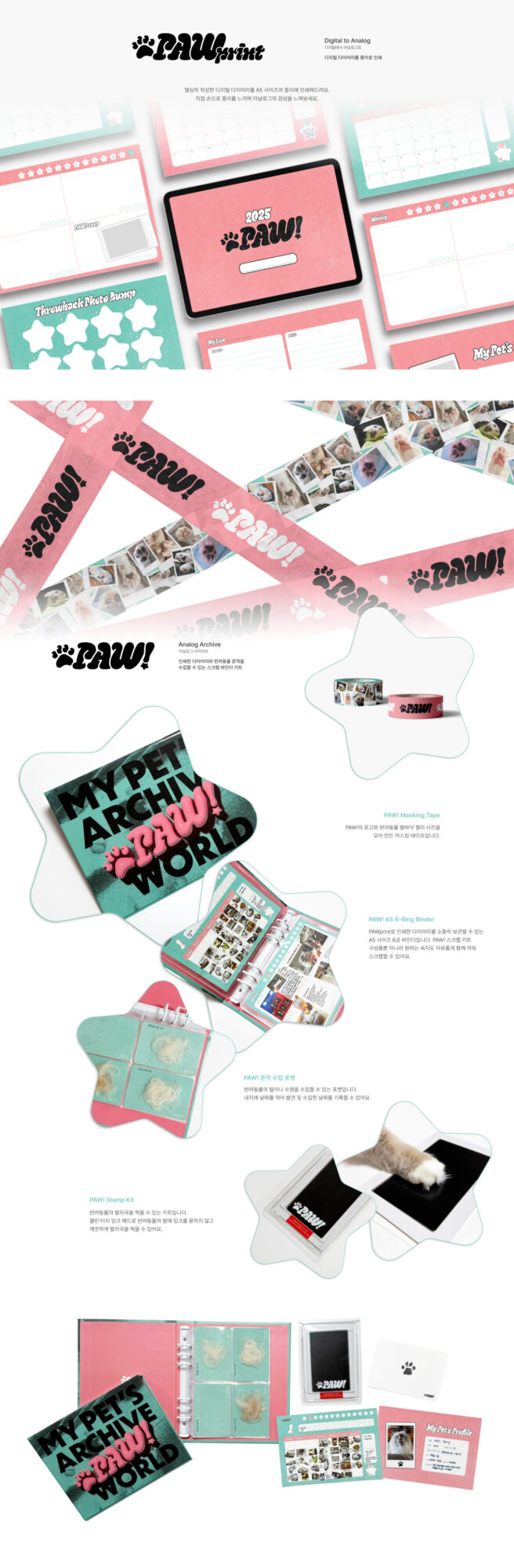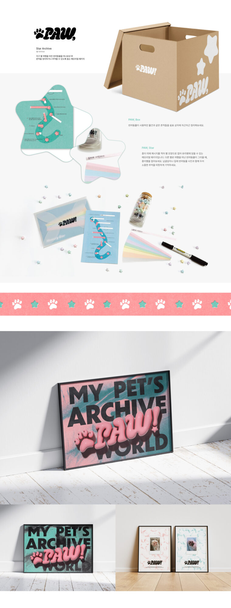 My Pet’s Archive World! PAW!는 반려동물과의 일상과 발자취를 포착하고 아카이빙 하는 재미를 전하며 이별 후의 펫로스 증후군까지 케어하는 브랜드입니다. 사랑, 행운 그리고 소원을 의미하는 종이 별을 유리병에 담아 순간을 오래 간직하는 컨셉을 지닙니다. 디지털과 아날로그를 오가며 디지털 다이어리, 스크랩 바인더, 종이 별 메모리얼 굿즈와 같은 아웃풋을 통해 반려동물과의 소중한 추억을 따뜻하게 보존하고자 합니다.