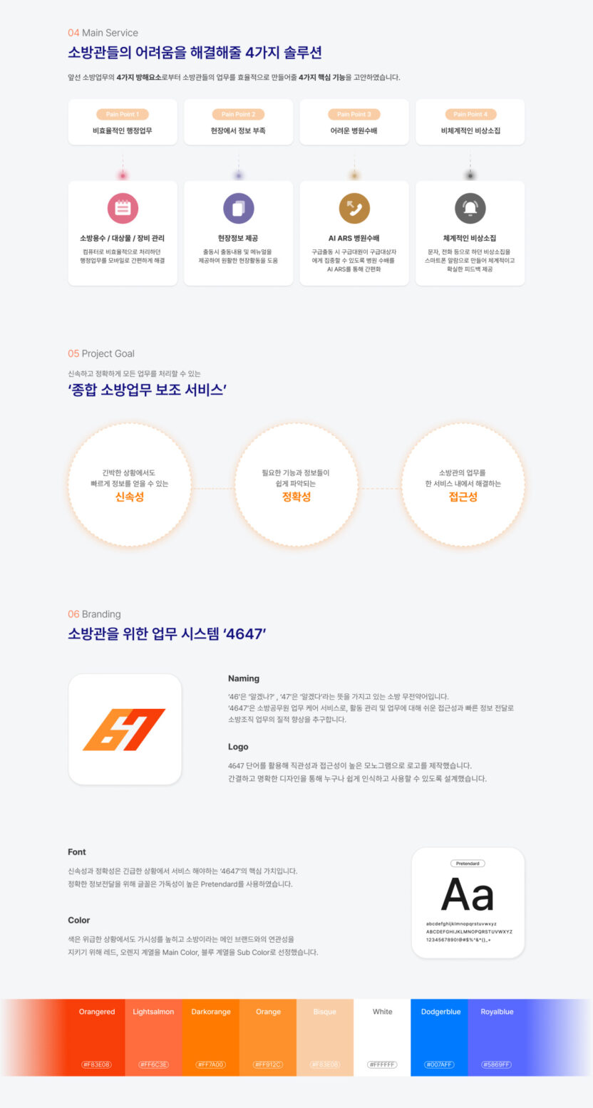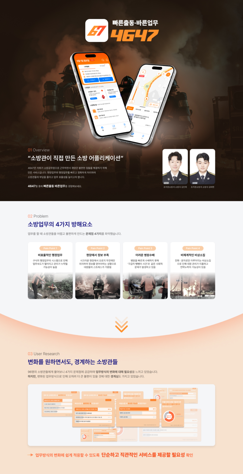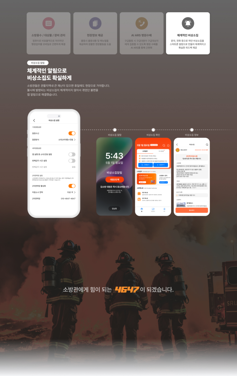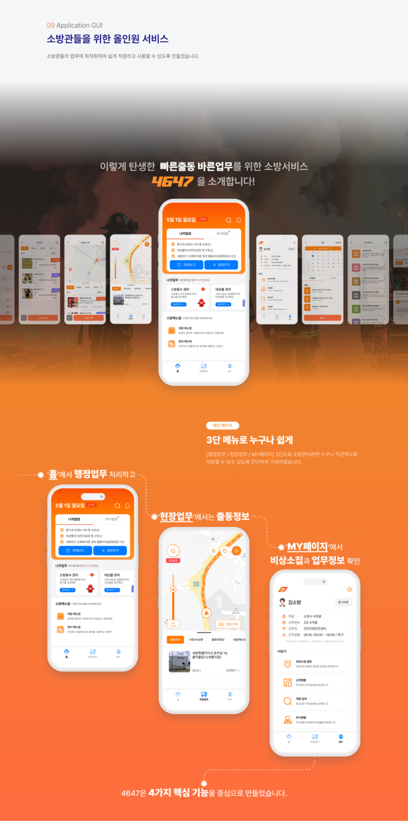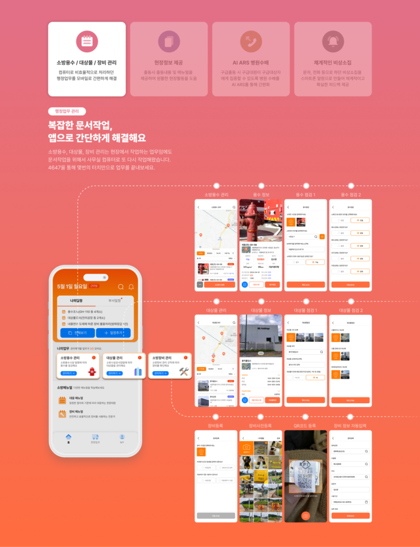 4647은 소방관들이 행정업무와 현장업무에서 겪는 어려움을 해결하기 위해 설계된 어플리케이션입니다. 긴급하고 복잡한 업무를 정확하고 신속하게 처리할 수 있도록 접근성을 높이고, 업무 효율성을 극대화합니다. 이를 통해 본연의 업무에만 집중할 수 있도록 돕고, 현장대응력을 강화해 소방관을 지원합니다.