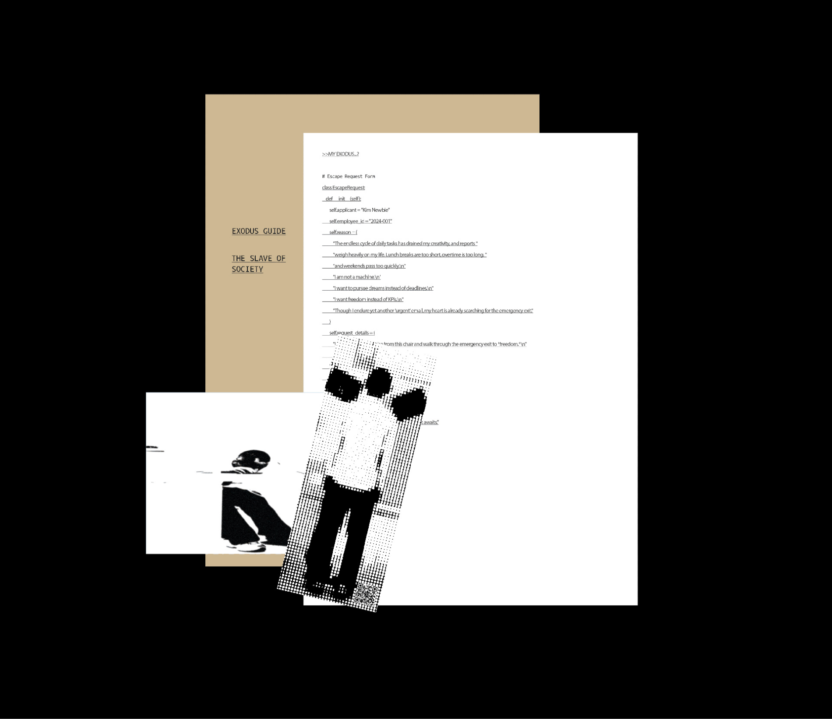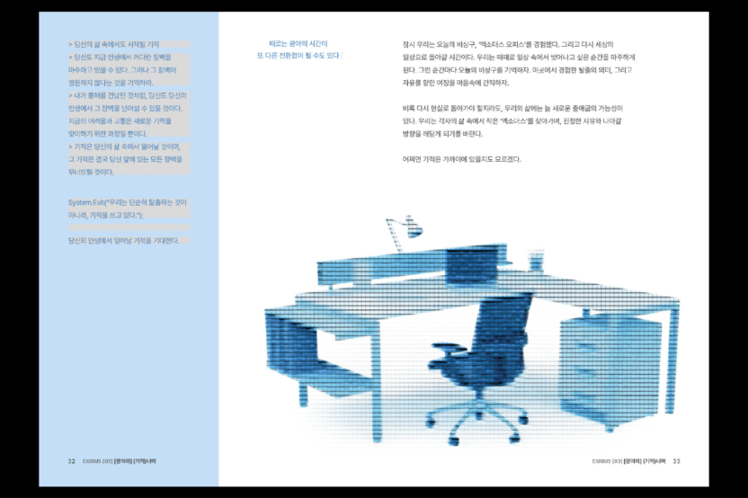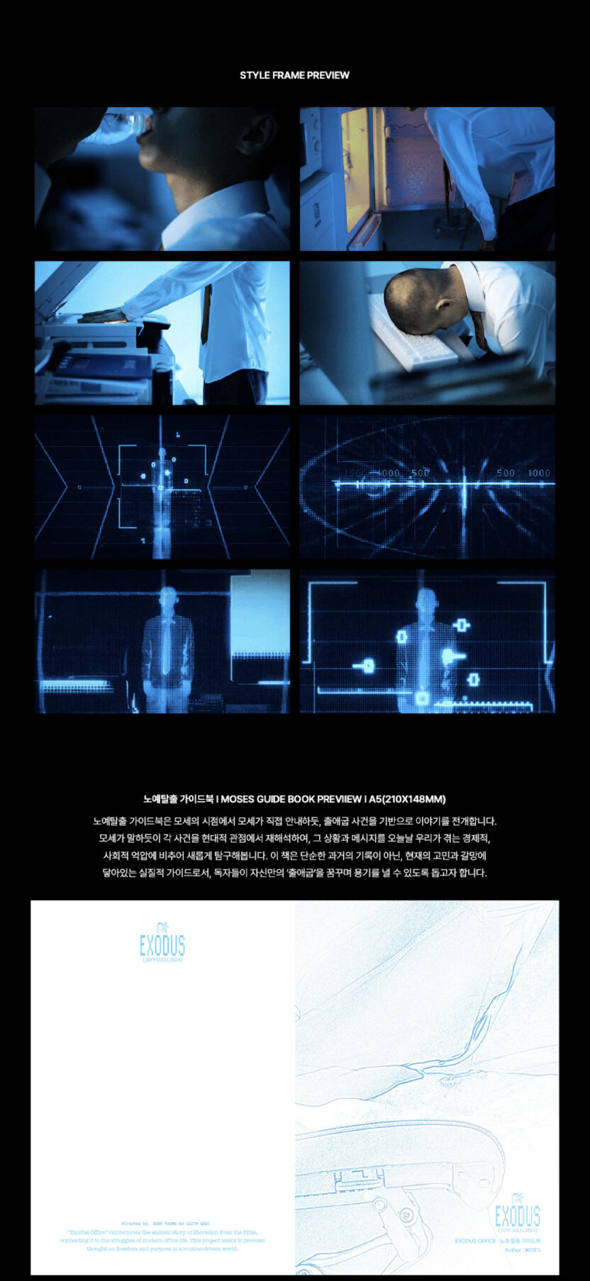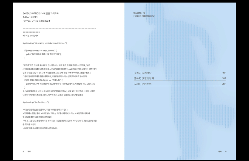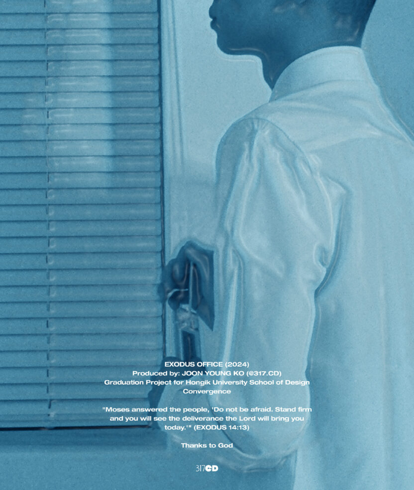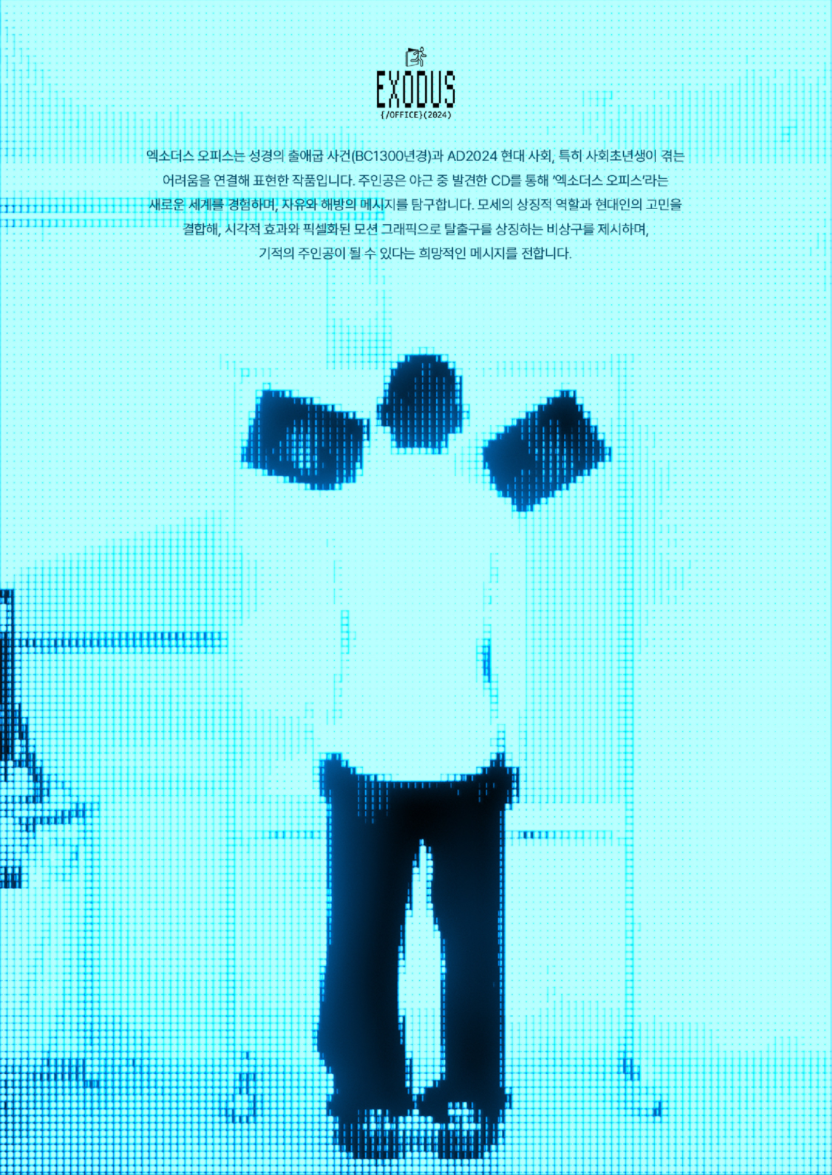 엑소더스 오피스는 성경의 출애굽 사건(BC 1300년경)과 AD 2024 현대 사회, 특히 사회초년생이 겪는 어려움을 연결해 표현한 작품입니다.