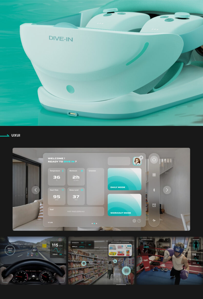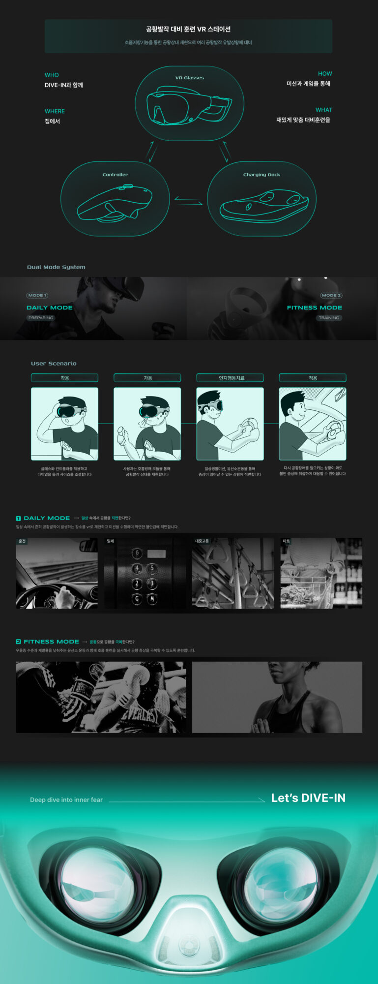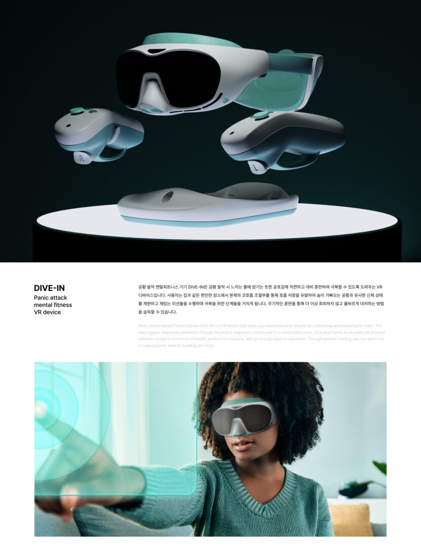 공황 발작 멘탈피트니스 기기 DIVE-IN은 공황 발작 시 느끼는 물에 잠기는 듯한 공포감에 직면하고 대비 훈련하여 극복할 수 있도록 도와주는 VR 디바이스입니다.