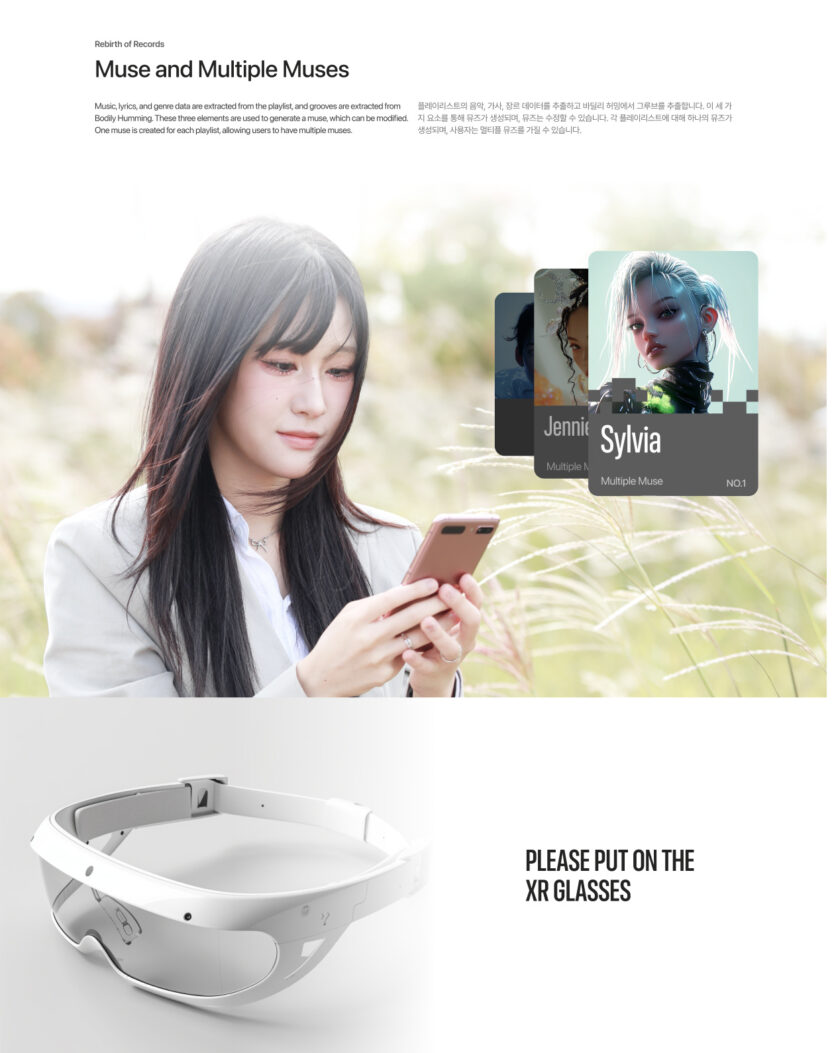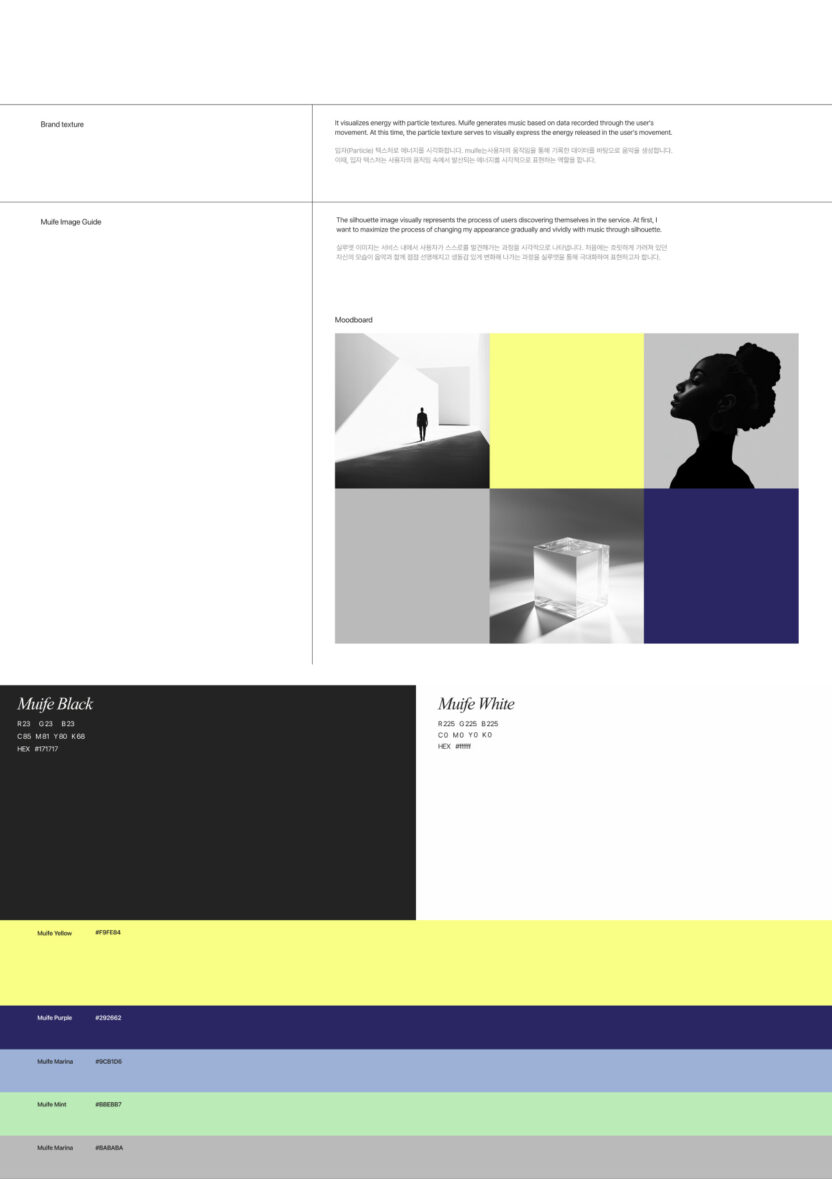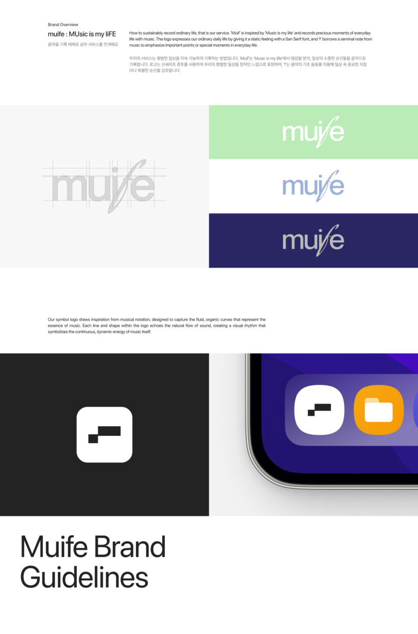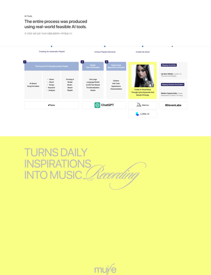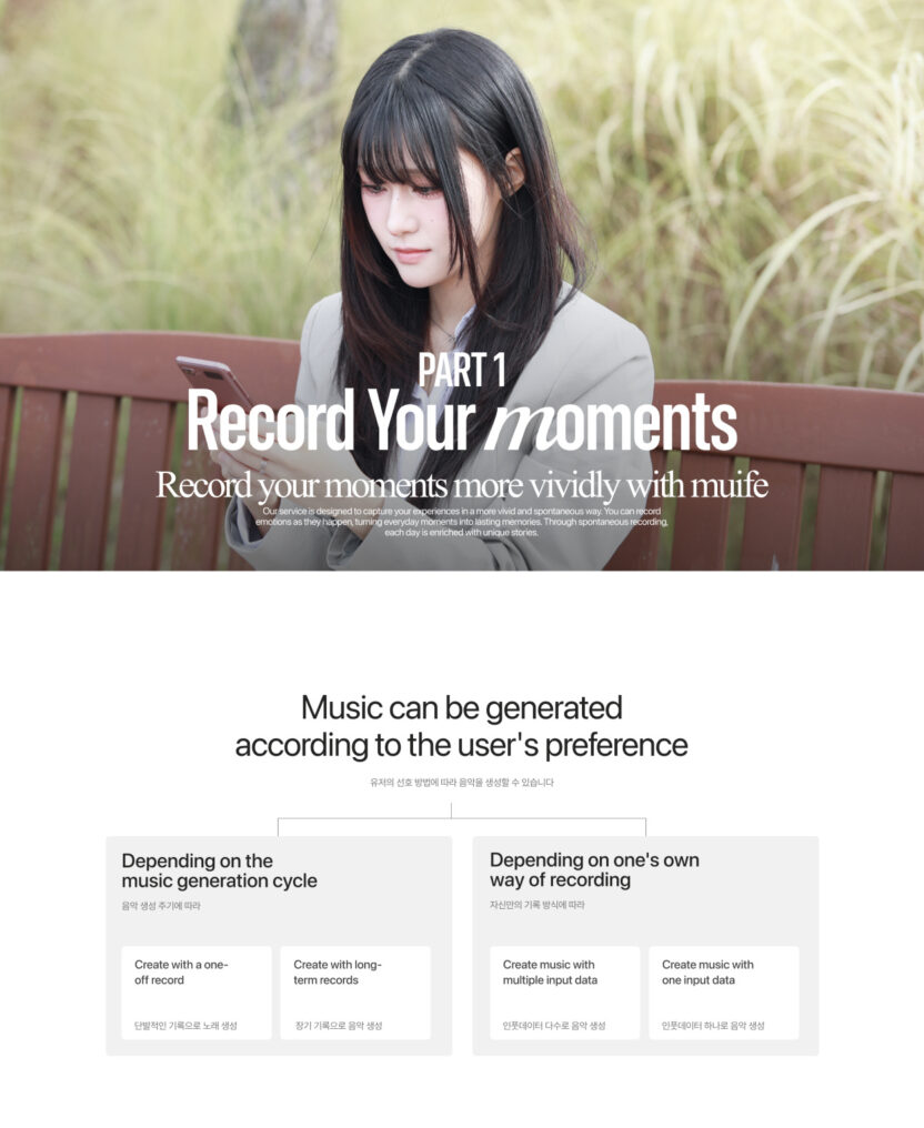 muife는 내 일상을 기록한 영감을 바탕으로 생성형 AI를 통해 음악과 버추얼 커스텀 콘텐츠를 제작하는 XR 음악 크리에이션 서비스입니다.