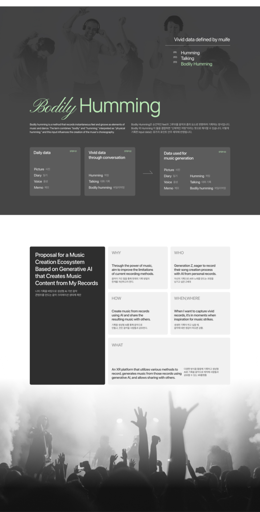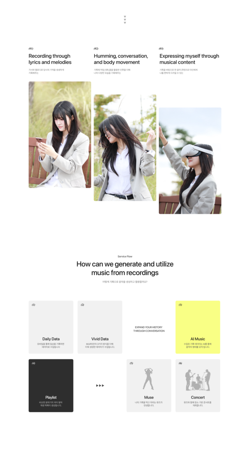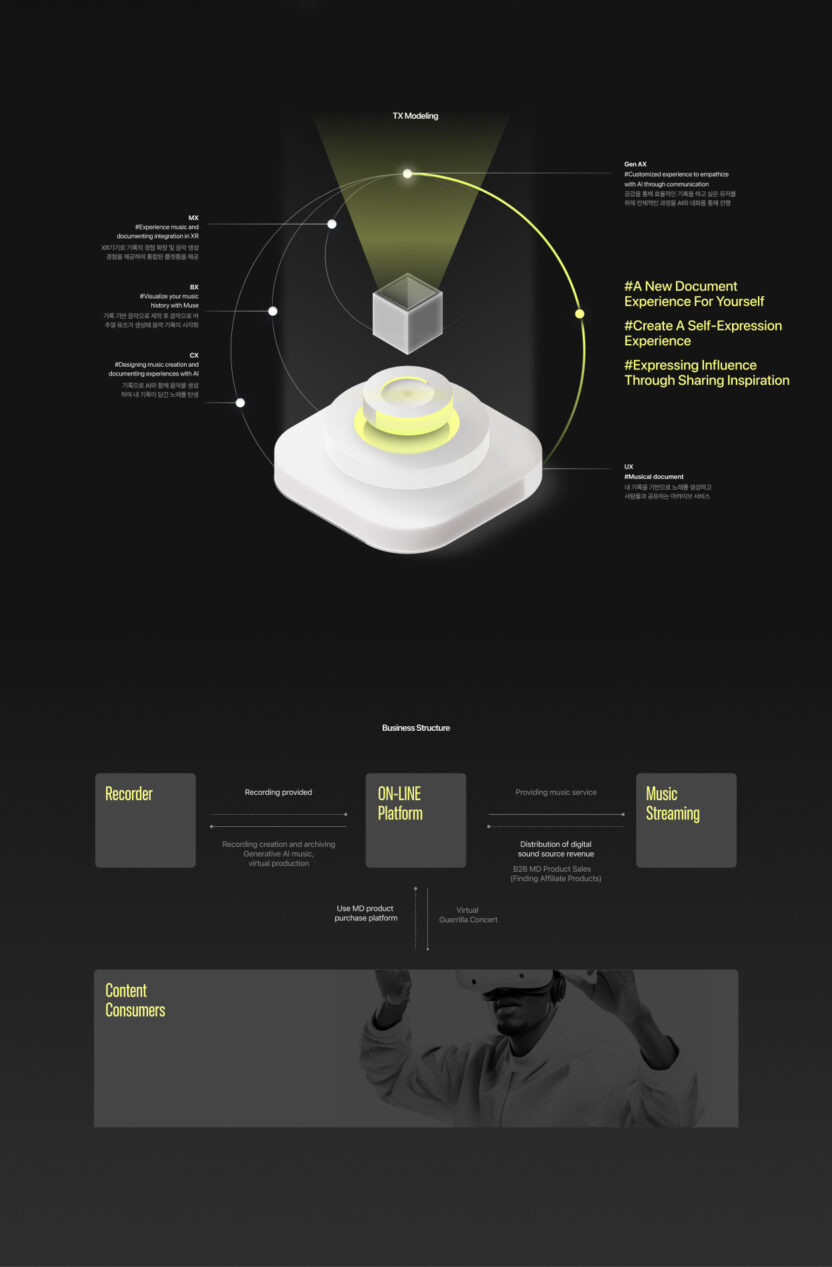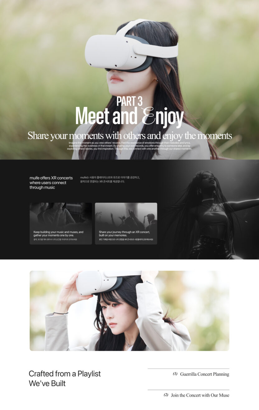 muife는 내 일상을 기록한 영감을 바탕으로 생성형 AI를 통해 음악과 버추얼 커스텀 콘텐츠를 제작하는 XR 음악 크리에이션 서비스입니다.