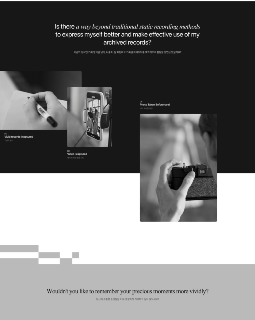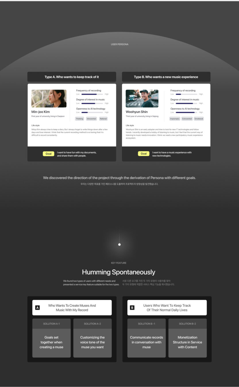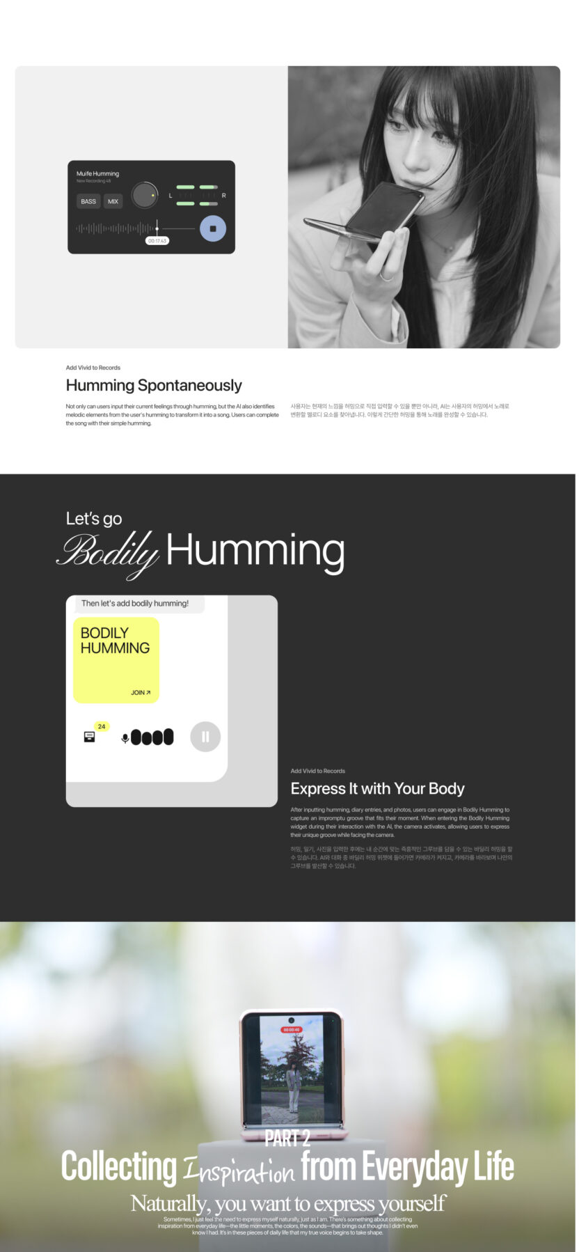 기존의 평면적인 글 기록 방식에서 벗어나 허밍, 바딜리 허밍, 일기, 대화 등 다양한 형식으로 순간적인 영감을 남길 수 있습니다.