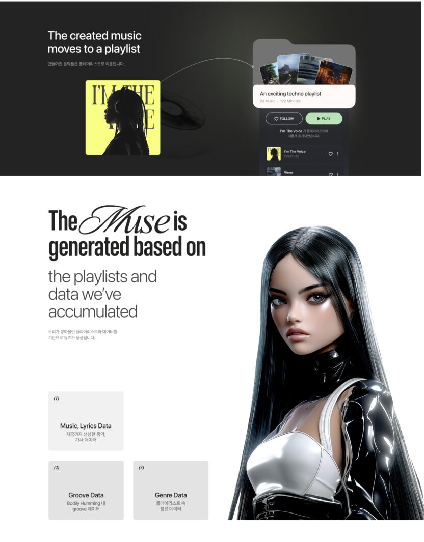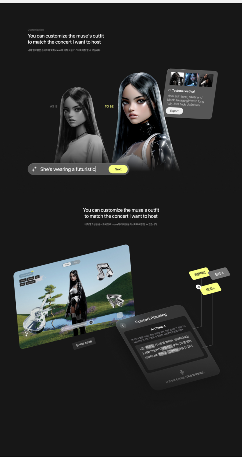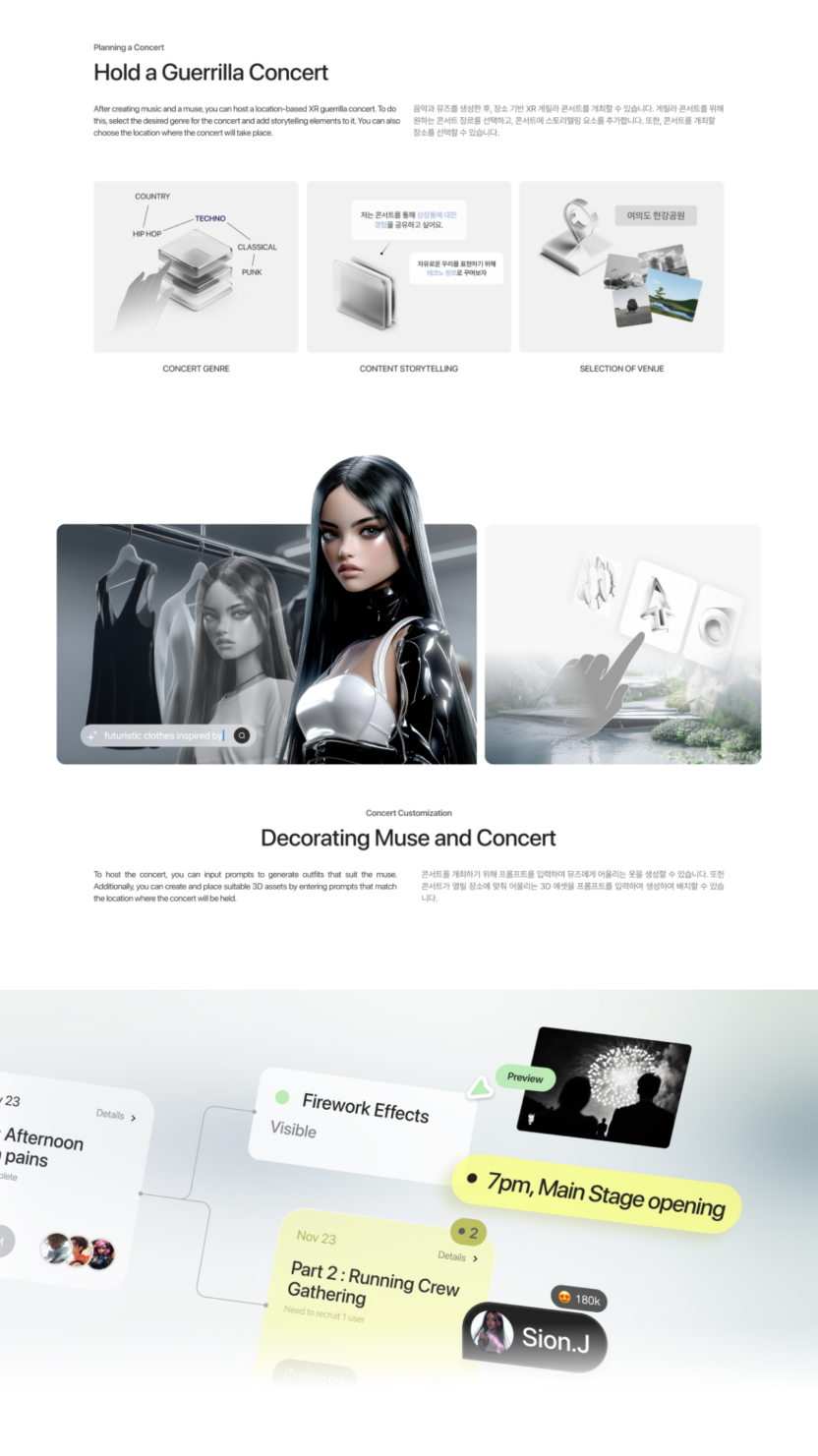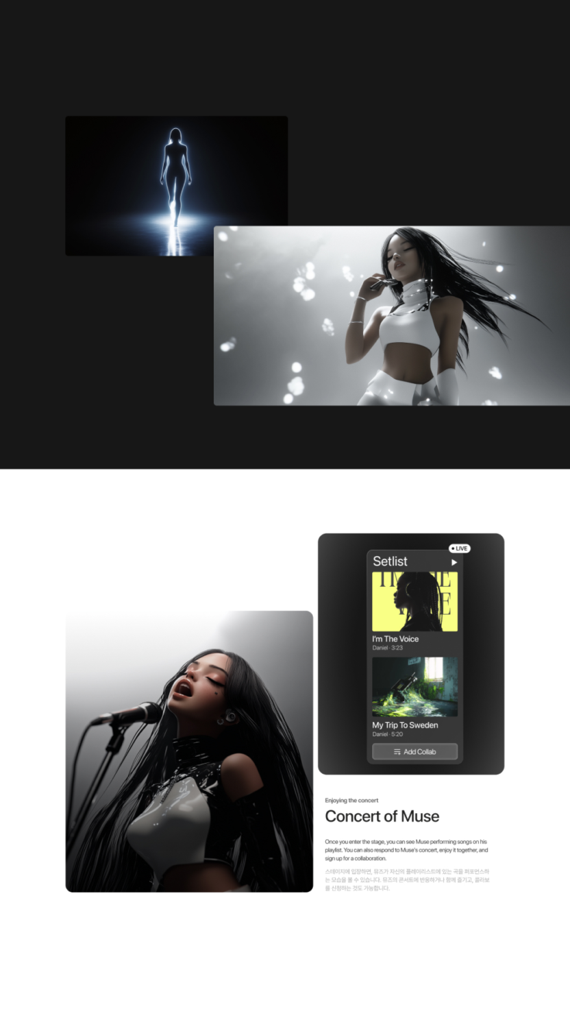 나만의 음악에서 탄생한 버추얼 뮤즈를 통해 콘서트를 열어 나의 이야기를 자연스럽게 사람들과 공유할 수 있습니다.