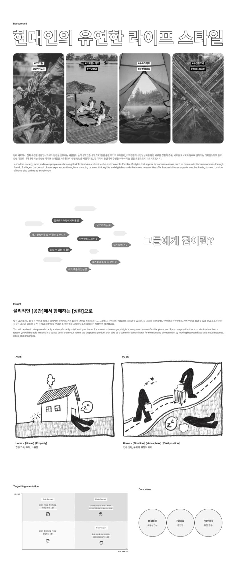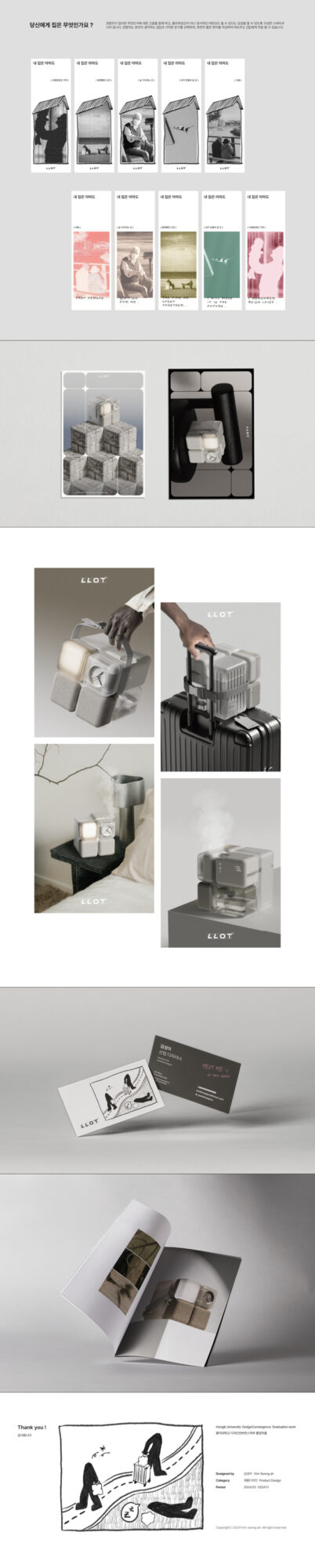올인원 수면 어시스턴트 제품 LLOT(롯)은 5도2촌, 유목라이프, 디지털노마드 등 현대 사회의 유연한 라이프스타일의 확산 속에서, 집 외의 공간에서 불편함 없이 수면할 수 있도록 설계되었습니다.