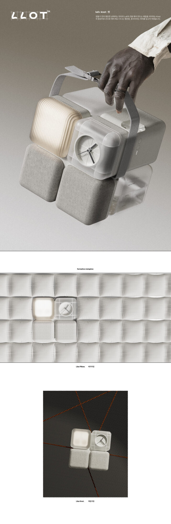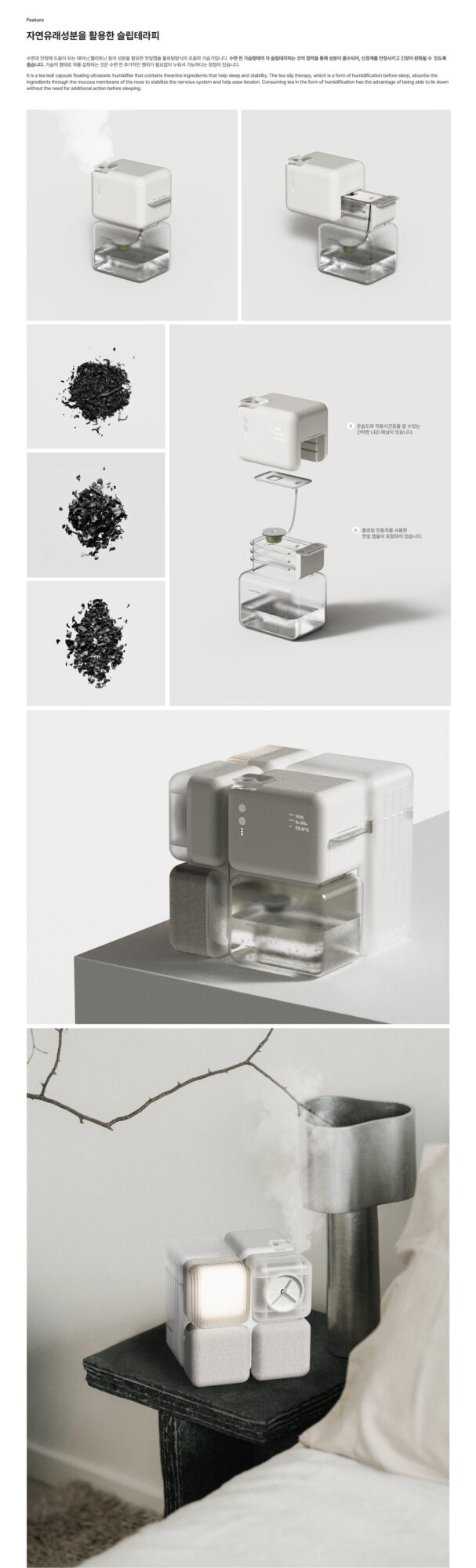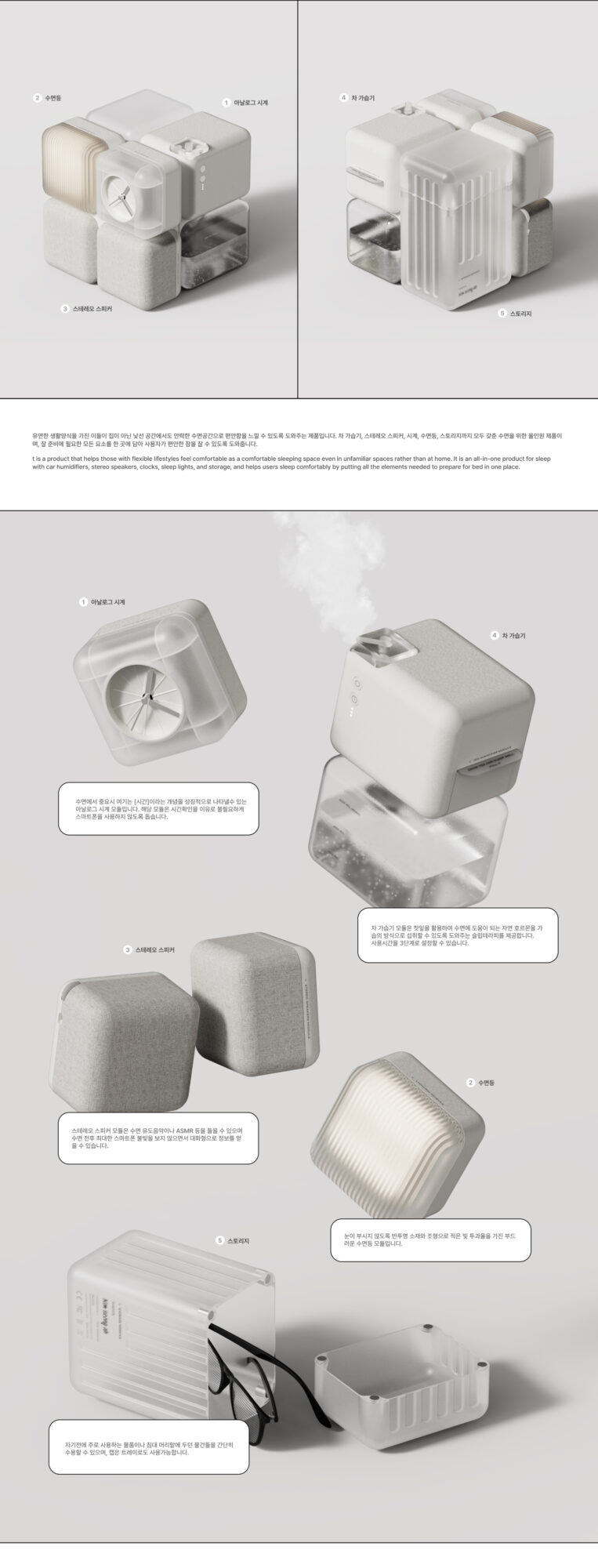 차 가습기, 스테레오 스피커, 시계, 수면등, 스토리지를 하나로 통합해 사용자가 어디서든 편안한 잠자리를 경험할 수 있도록 돕는 이 제품은 수면 환경의 공통분모로 작용하여 낯선 공간에서도 심리적 안온감을 제공하는 가지고 다니는 나의 잠자리입니다.