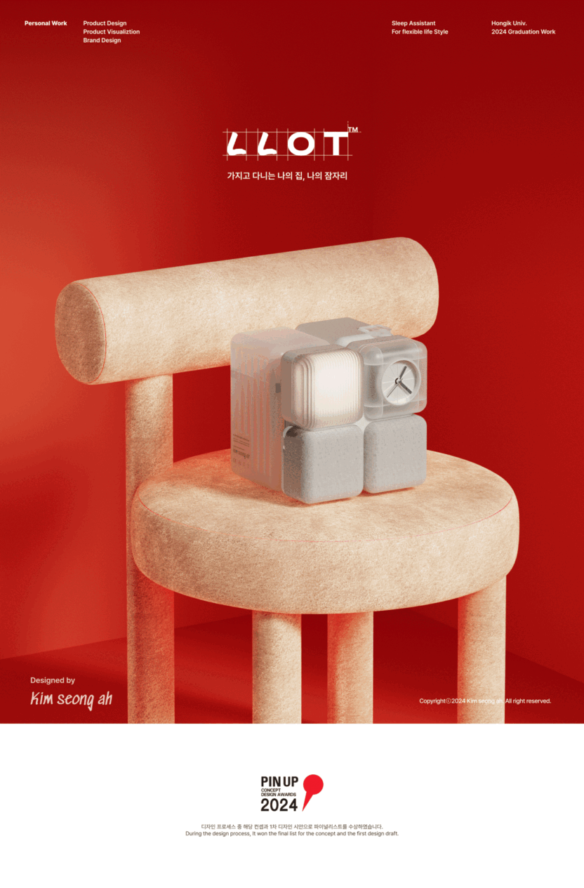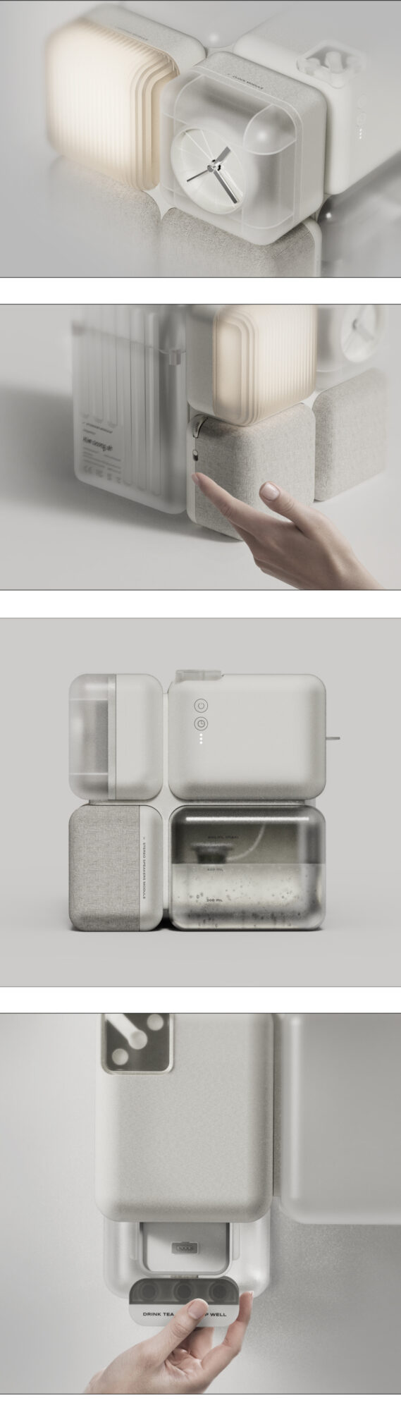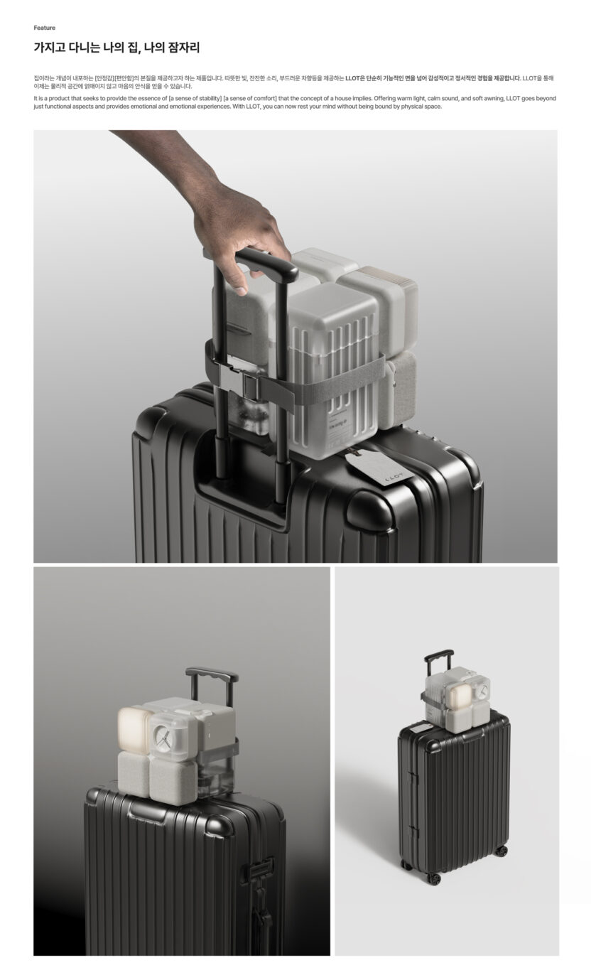 차 가습기, 스테레오 스피커, 시계, 수면등, 스토리지를 하나로 통합해 사용자가 어디서든 편안한 잠자리를 경험할 수 있도록 돕는 이 제품은 수면 환경의 공통분모로 작용하여 낯선 공간에서도 심리적 안온감을 제공하는 가지고 다니는 나의 잠자리입니다.