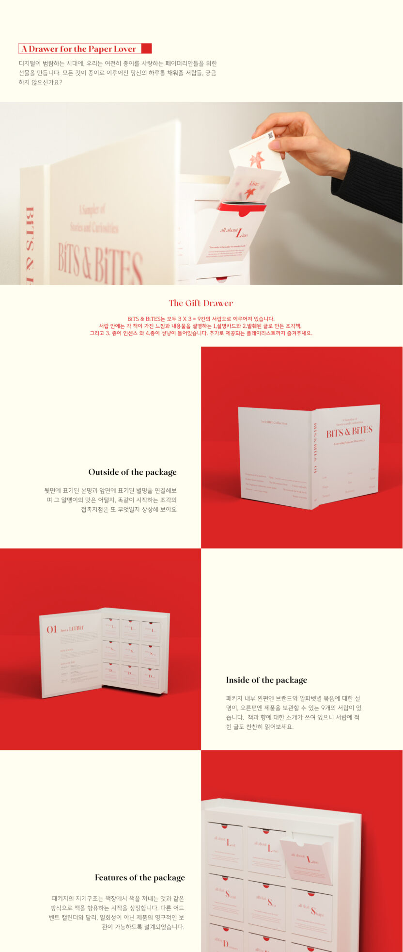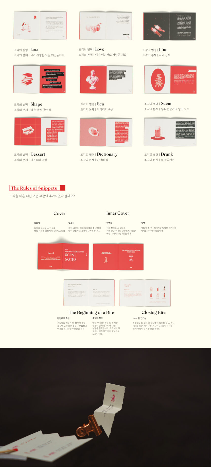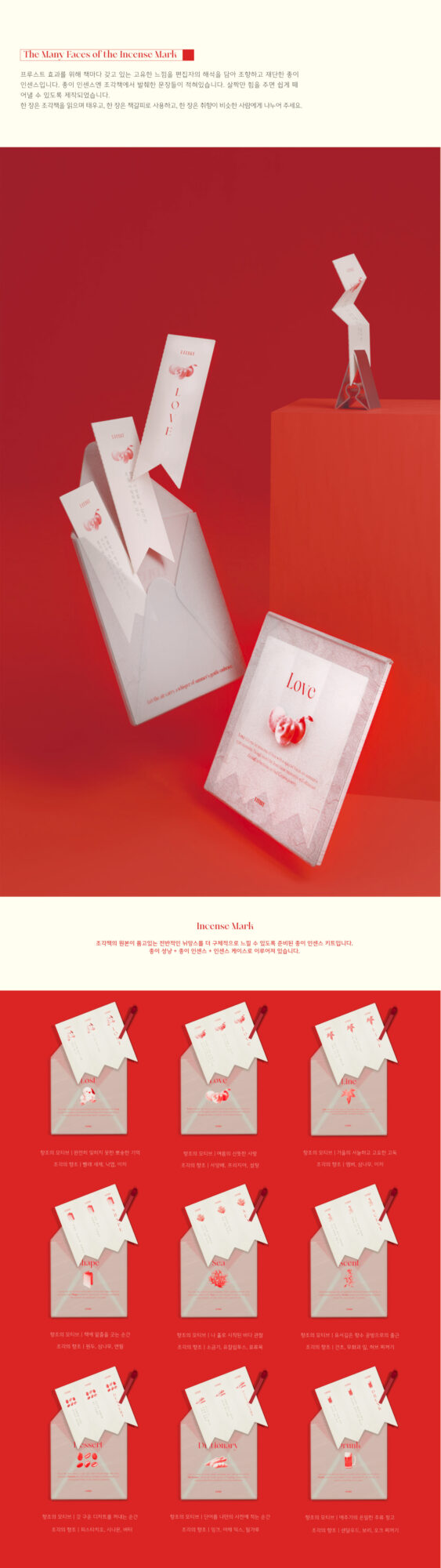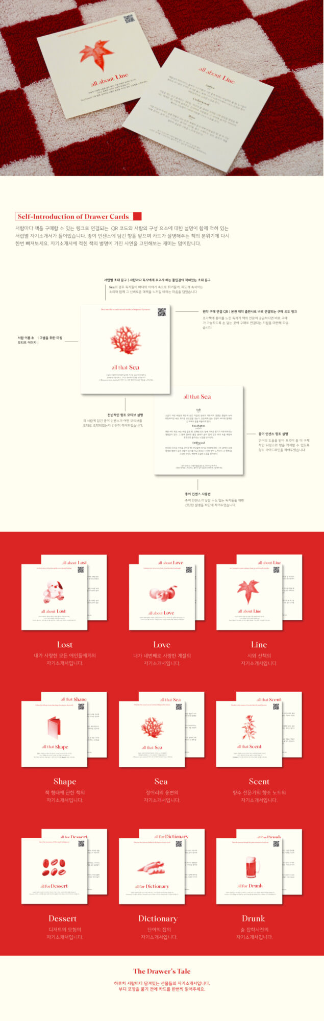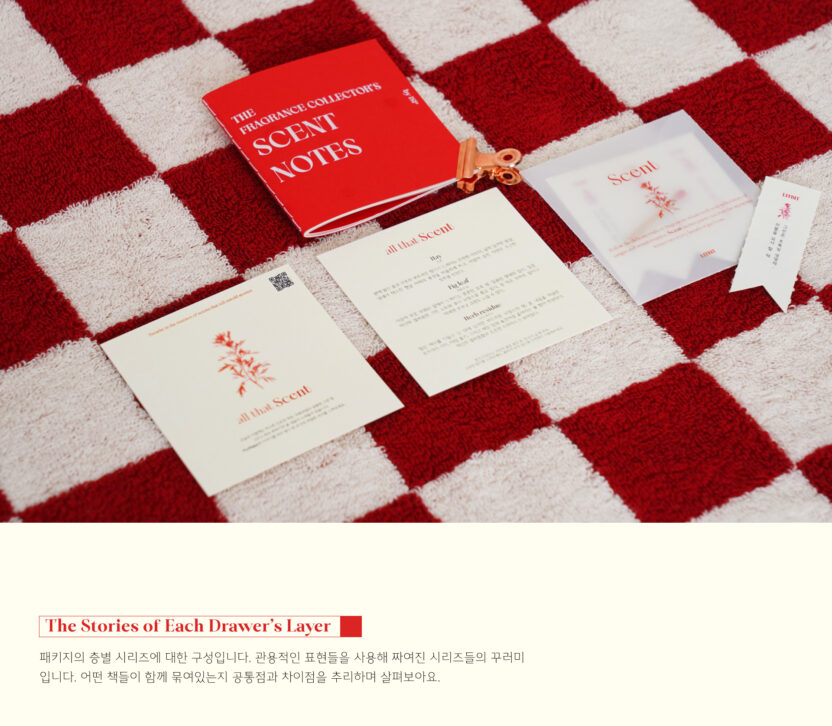 각 칸에는 조각책과 수제 종이 인센스를 담아 책의 감각과 뉘앙스를 느낄 수 있도록 했습니다.