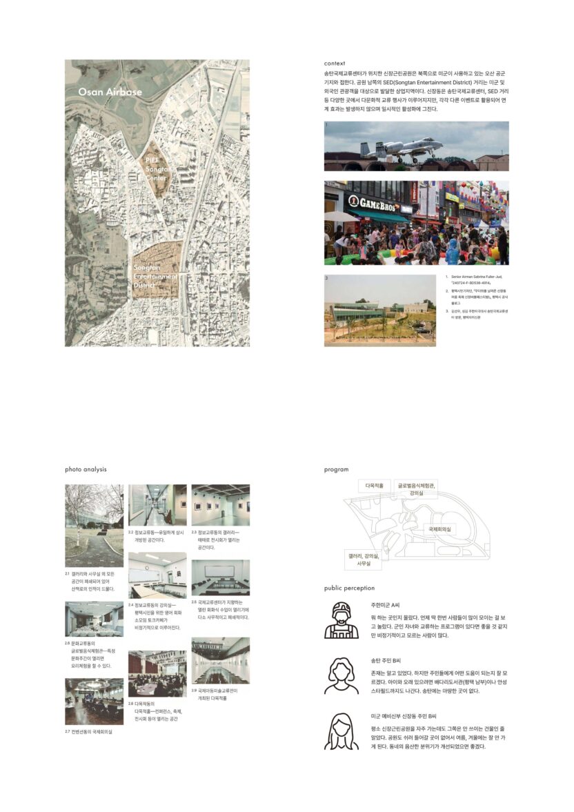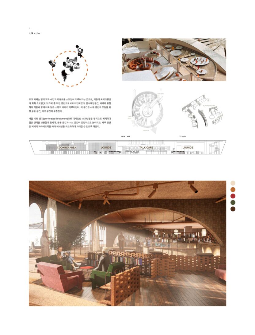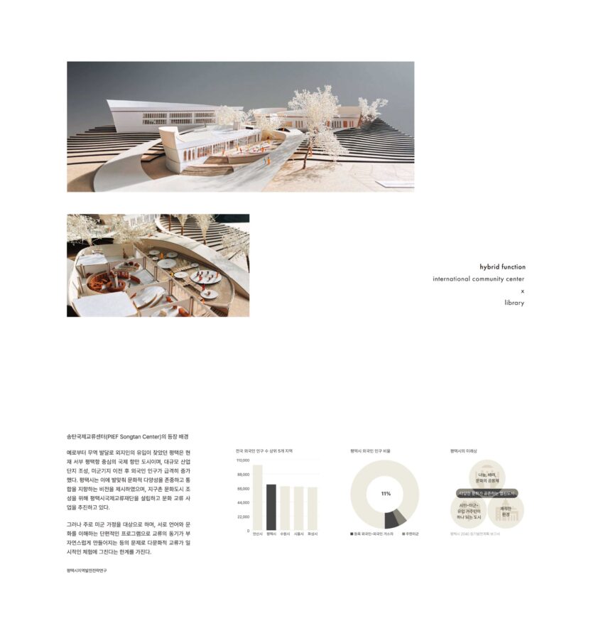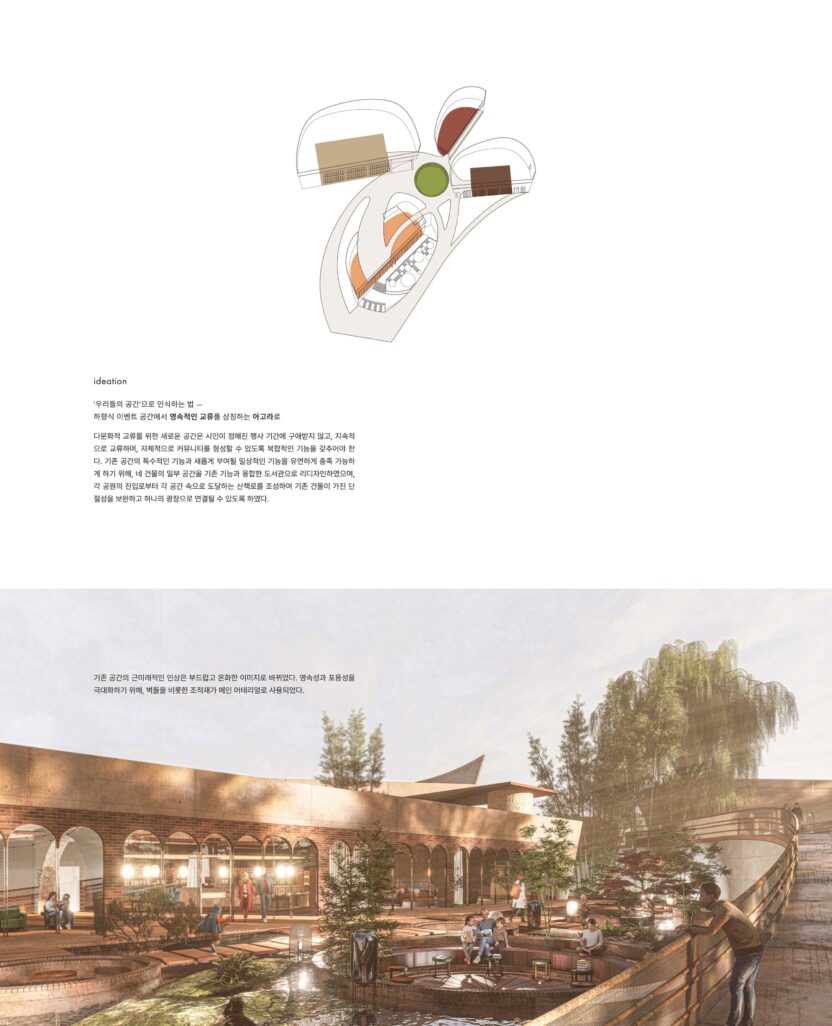 하향식 이벤트 공간에서 영속적인 교류를 상징하는 아고라로 적은 사용성으로 단절된 국제교류센터가 가진 ‘이벤트적 기능’에 도서관의 ‘일상적 기능’을 융합하여, 평택 다문화적 교류의 영속성을 상징하는 복합문화공간으로 리디자인하였다. 공원의 진입로부터 각 공간의 내부까지 도달하는 산책로는 분산된 건물이 가진 단절성을 보완하고 하나의 광장으로 연결될 수 있도록 한다. 기존 공간이 가진 근미래적인 인상은 다문화권 비율이 높은 평택시민을 포용하는 공간으로서 부드럽고 온화한 이미지로 바뀌었다. 벽돌을 비롯한 조적재를 메인 머테리얼로 활용하여, 무역 발달로 오랜 세월 동안 외지인과 융합하여 살아갔던 평택 사회의 영속성과 포용성을 극대화한다.