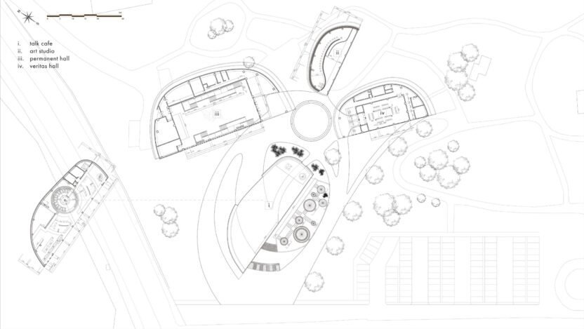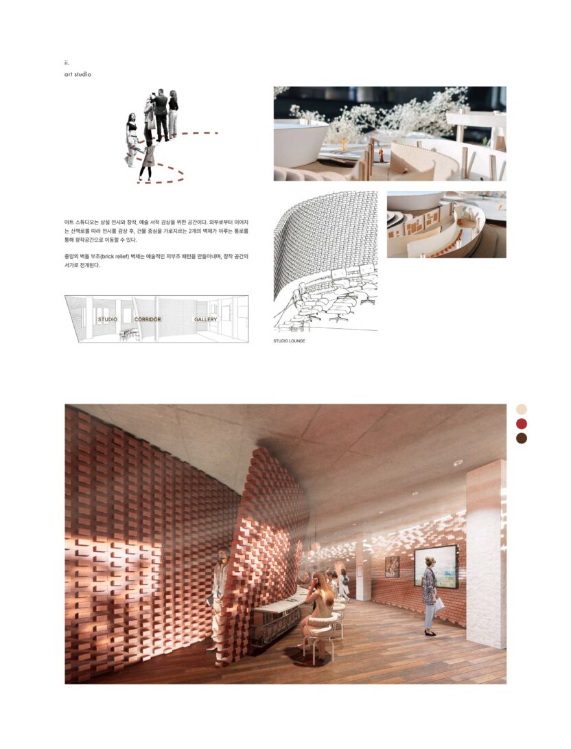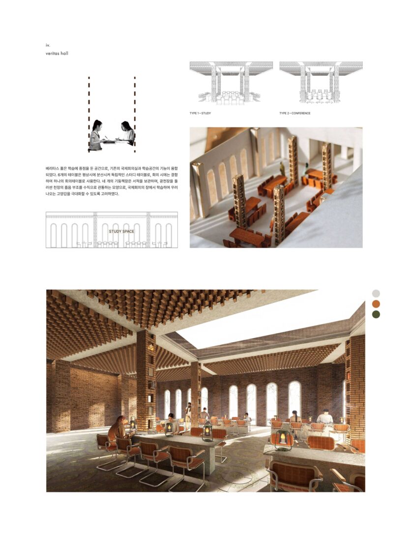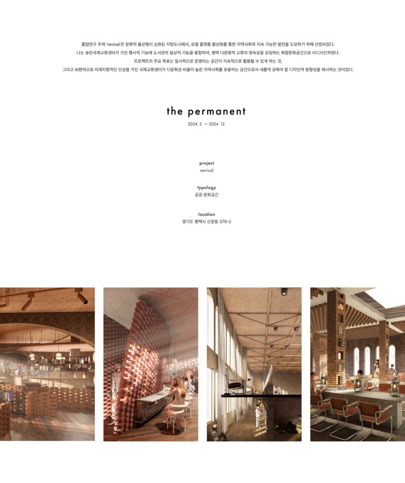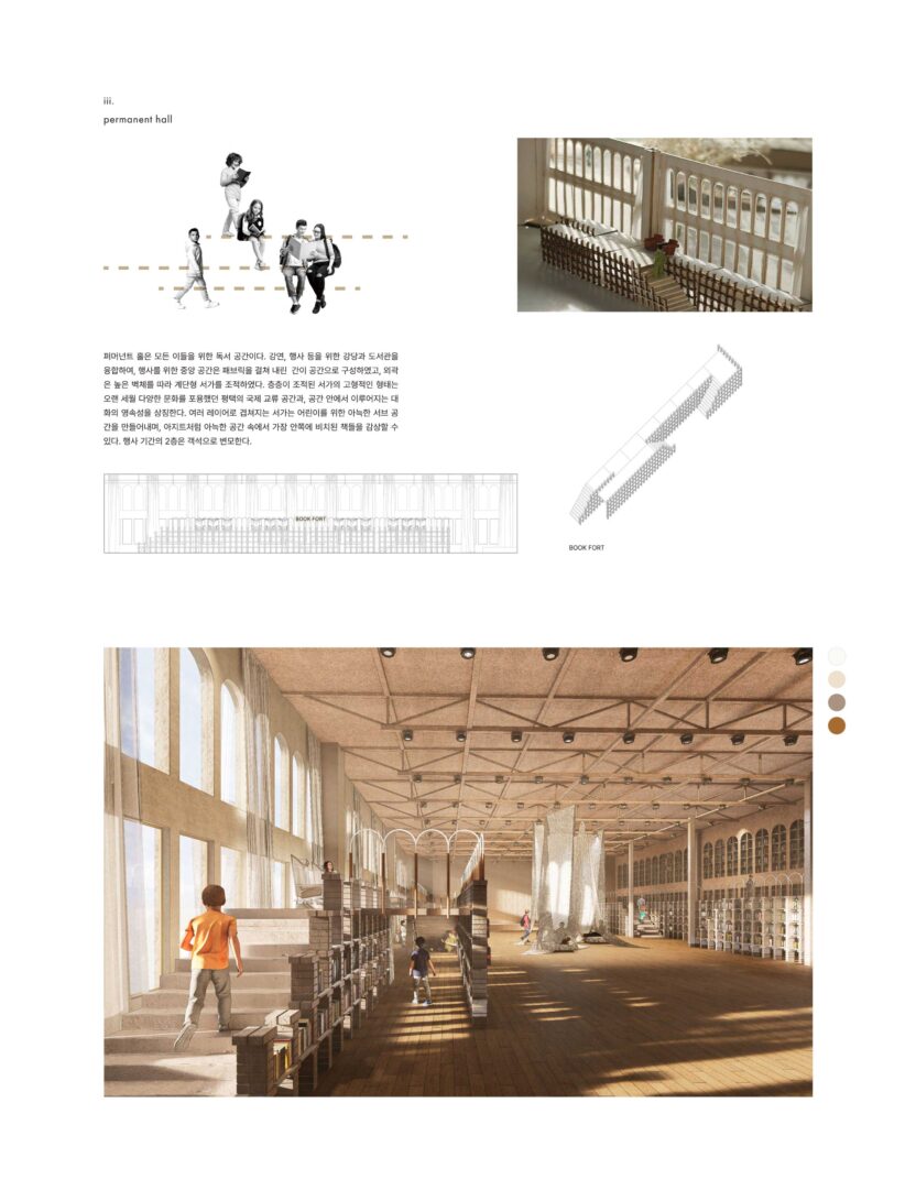 하향식 이벤트 공간에서 영속적인 교류를 상징하는 아고라로 적은 사용성으로 단절된 국제교류센터가 가진 ‘이벤트적 기능’에 도서관의 ‘일상적 기능’을 융합하여, 평택 다문화적 교류의 영속성을 상징하는 복합문화공간으로 리디자인하였다. 공원의 진입로부터 각 공간의 내부까지 도달하는 산책로는 분산된 건물이 가진 단절성을 보완하고 하나의 광장으로 연결될 수 있도록 한다. 기존 공간이 가진 근미래적인 인상은 다문화권 비율이 높은 평택시민을 포용하는 공간으로서 부드럽고 온화한 이미지로 바뀌었다. 벽돌을 비롯한 조적재를 메인 머테리얼로 활용하여, 무역 발달로 오랜 세월 동안 외지인과 융합하여 살아갔던 평택 사회의 영속성과 포용성을 극대화한다.