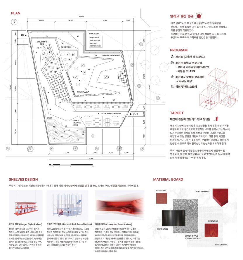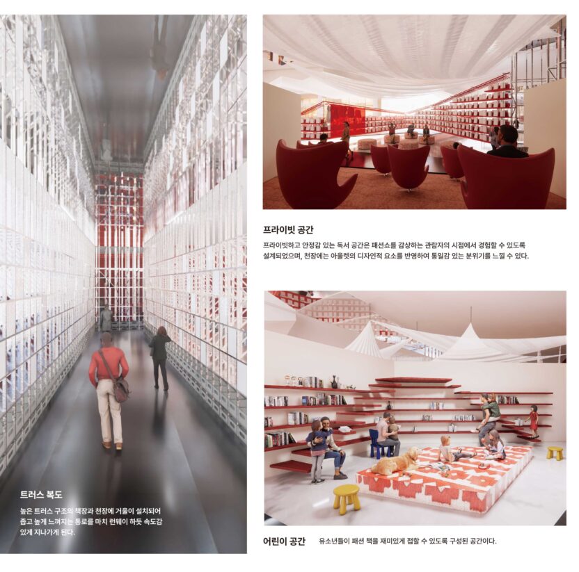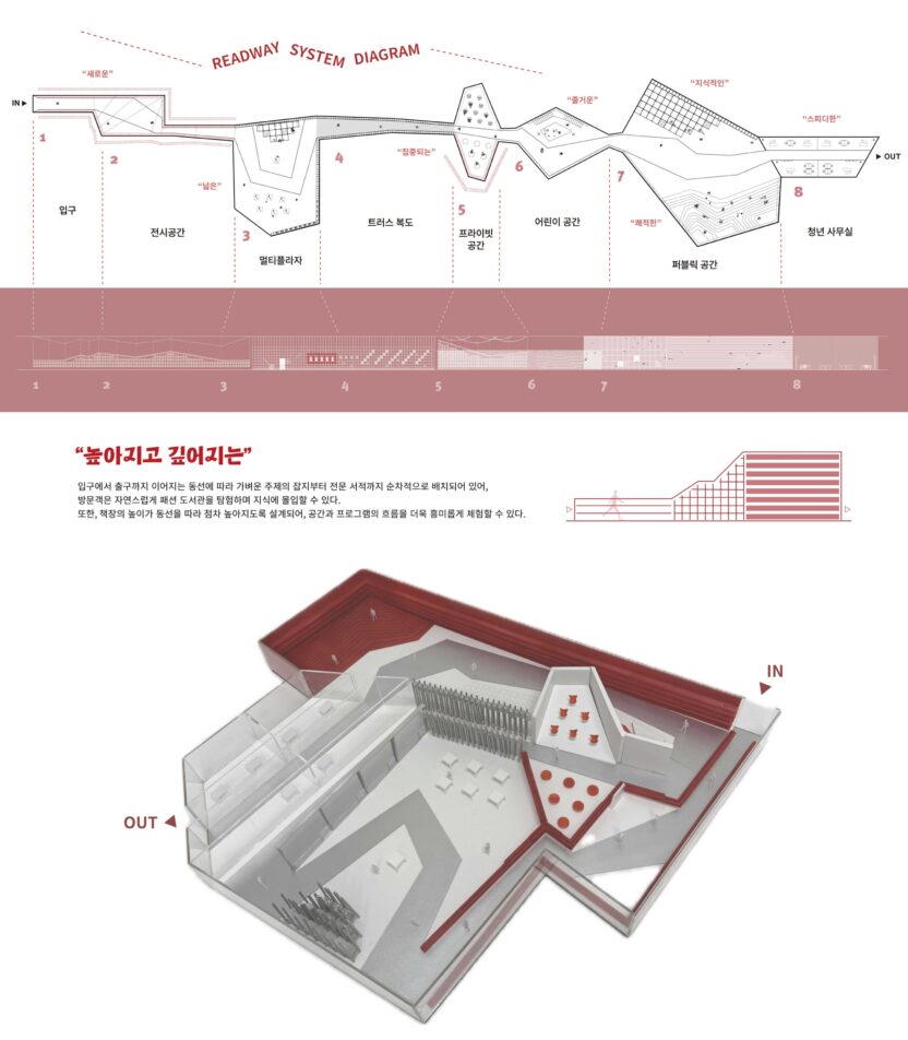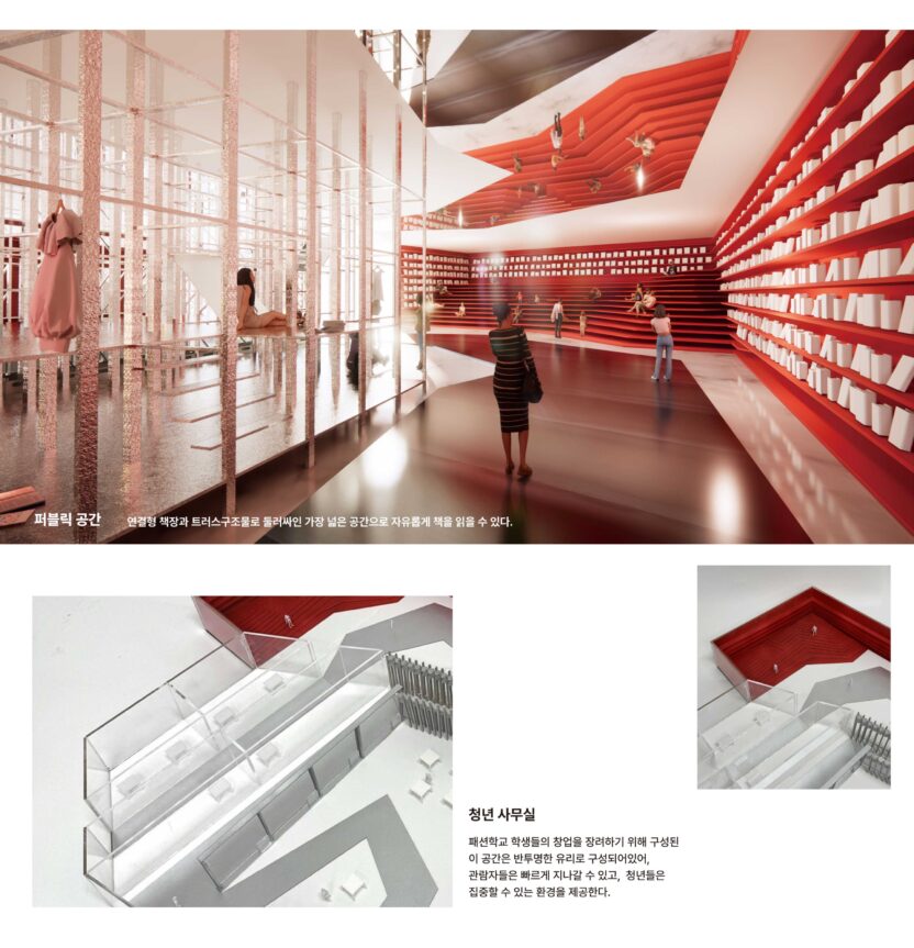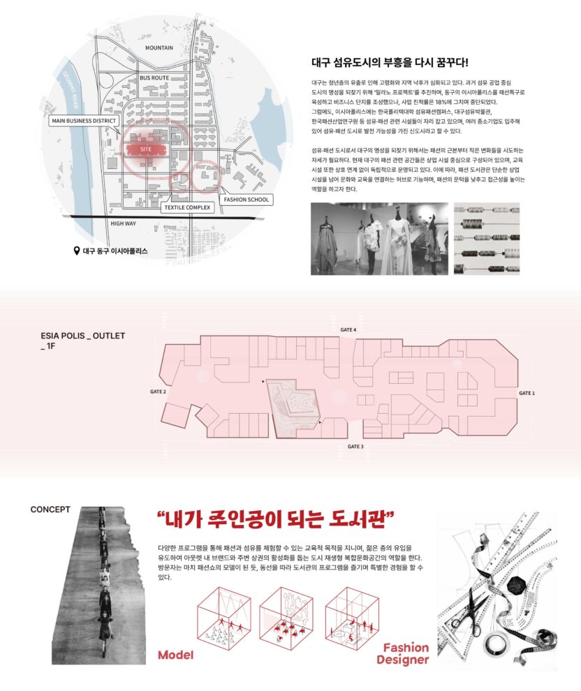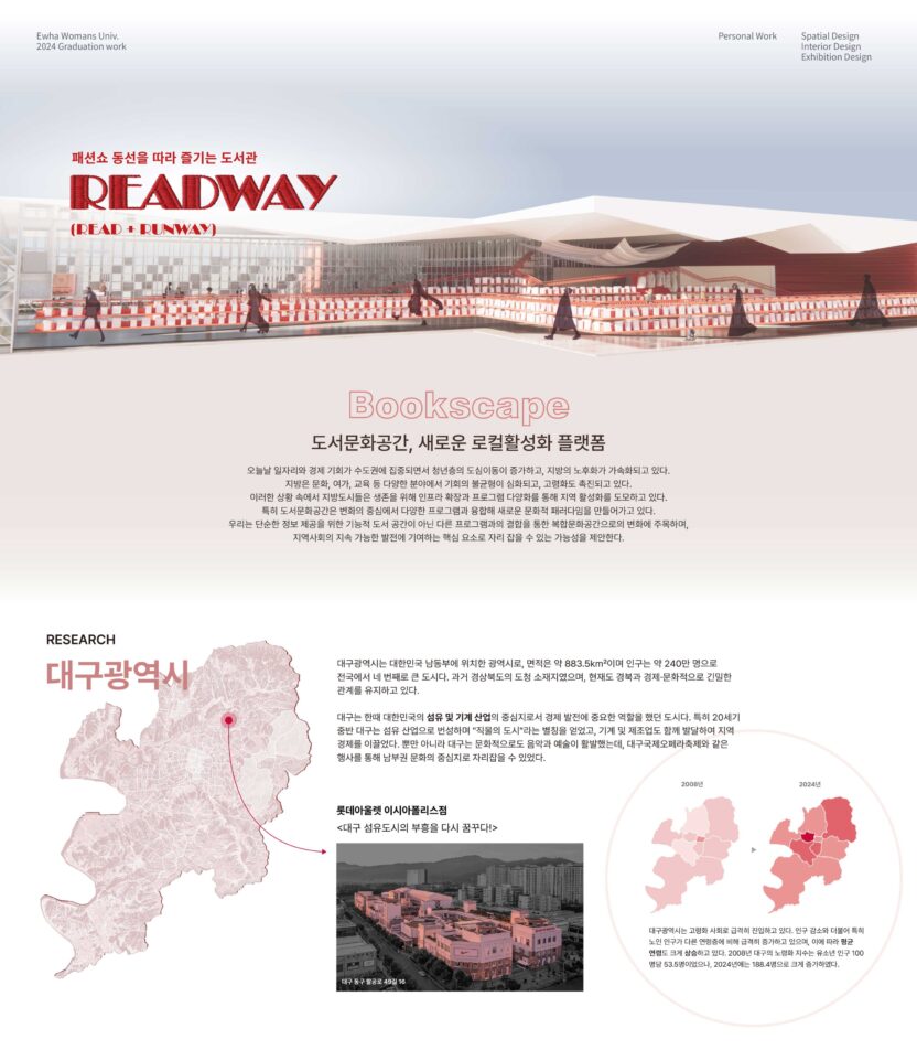 READWAY 도서관은 청년 유출과 고령화 문제를 겪고 있는 대구에 젊은 층의 유입을 촉진하고 지역 활성화를 돕는 도시 재생형 복합문화공간이다. 특히, 한때 대구의 상징이었던 섬유·패션 산업의 명성을 되찾기 위해 'READWAY (Read + Runway)'는 문화와 교육을 연결하는 허브로서 패션의 문턱을 낮추고 접근성을 높이는 역할을 한다. 패션쇼를 비롯한 다채로운 이색 프로그램을 통해 MZ세대가 반드시 방문해야 할 명소로 자리매김하며, 특별한 경험을 제공하는 공간으로 디자인하고자 한다.