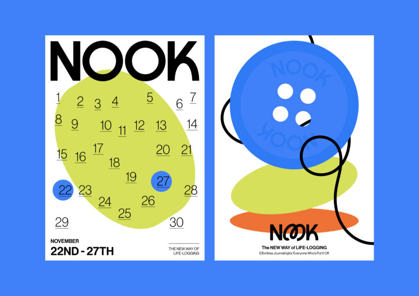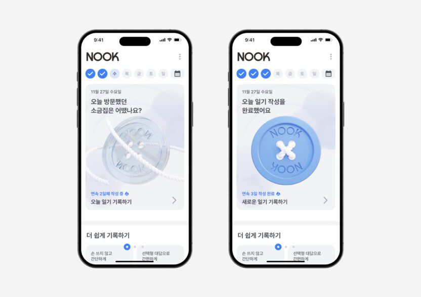 우리는 매일 놓치기 아까운 순간들을 경험한다. 하지만 바쁜 일상에서 이러한 순간을 기록하는 일은 귀찮게 느껴지기 마련이다. 〈Nook〉는 소중한 순간들을 더 쉽게 기록할 수 있도록 돕는 라이프로깅 서비스이다. 사용자의 일상을 관찰하여 오늘의 일기 소재를 제안하고, 간편한 선택지를 제공하는 등, 기존의 일기 작성 과정보다 한층 더 수월한 경험을 제공한다. 일기 작성이 귀찮아서 미뤄왔다면, 새로운 일기의 방식 〈Nook〉와 함께하길 추천한다.