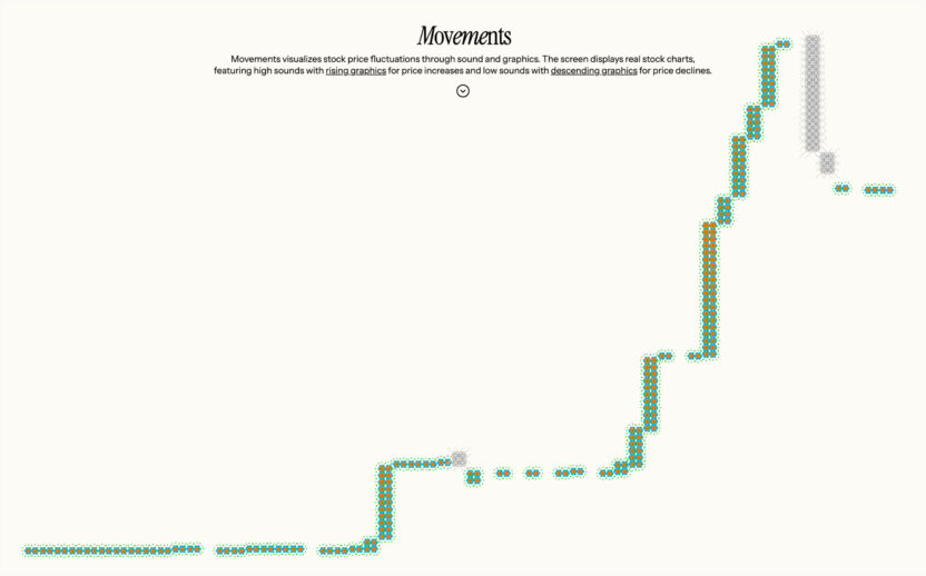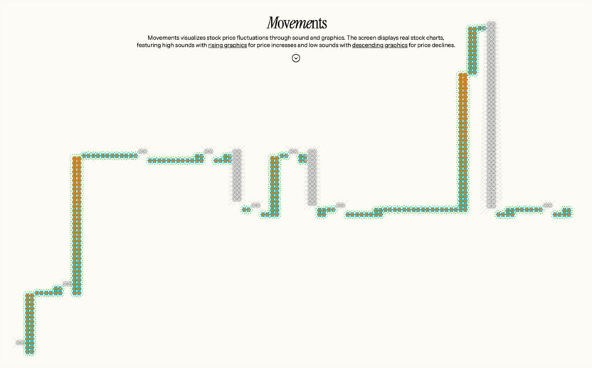 양봉과 음봉이라는 두 가지 기본 요소로 이루어진 주식 그래프는 가격이 위아래로 변동할 때마다 사람의 감정 또한 크게 흔들리게 만든다. 가격이 상승할 때는 입꼬리가 올라가고, 하락할 때는 눈썹이 처지는 모습을 통해 이러한 감정 변화를 나타낼 수 있다. 〈Movements〉는 실시간 암호화폐 주식 차트의 양봉과 음봉을 시각적 및 청각적으로 표현한 작품이다. 양봉과 음봉의 변동은 감정의 변화와 직결되므로, 이를 오실레이터 형태로 반영하였으며, 막대를 구성하는 요소는 꽃에서 영감을 받아 양봉은 피어남을, 음봉은 사그라듦을 상징적으로 나타내었다.