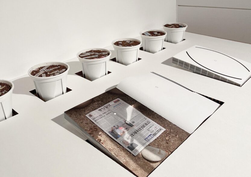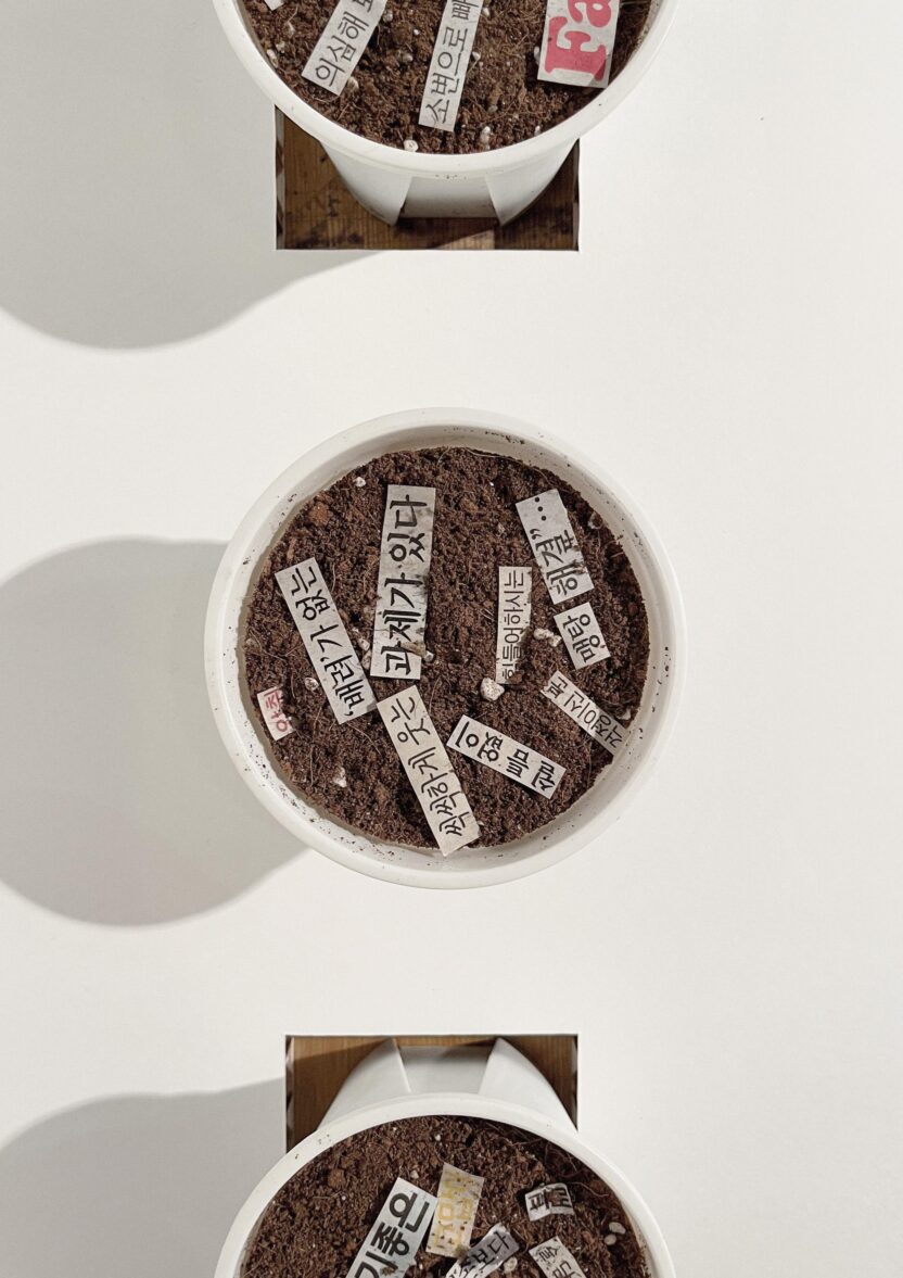 ‘말이 씨가 된다.’라는 말이 있다. 이 표현은 말의 잠재성과 영향력을 씨앗에 비유하여, 생명력을 지닌 씨앗과 유사한 특성을 강조한다. 〈말, 씨앗〉 작업에서는 이러한 말의 생명력을 탐구하기 위해, 언어 그 자체를 씨앗으로 간주하는 관찰이 이루어진다. 이 작업은 두 가지 주요 관찰로 나뉘어 진행되었는데, 첫 번째는 ‘광합성 하는 신문’이다. 여기서는 신문에 실린 다양한 단어들을 화단에 두고, 매일 같은 시각에 촬영하여 그 과정을 아카이빙 했다. 두 번째 관찰은 ‘화분에 담긴 말들’이다. 신문에 실린 단어들은 작업자에 의해 임의로 선정 및 분류되어, 화분 안에서 문장과 의미를 만들어낸다. 우연히 조합된 단어들은 예상치 못한 강한 연결을 만들어내기도 한다.