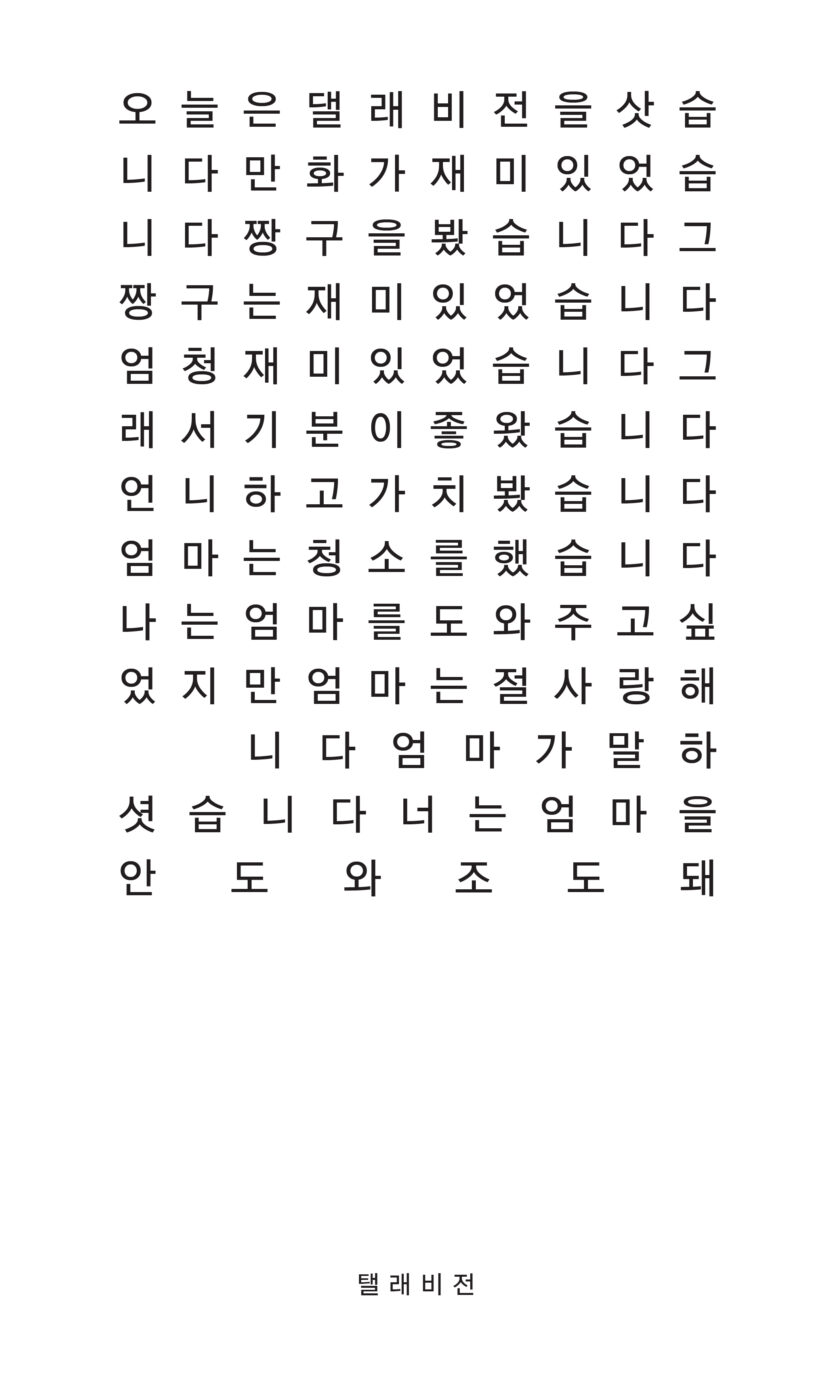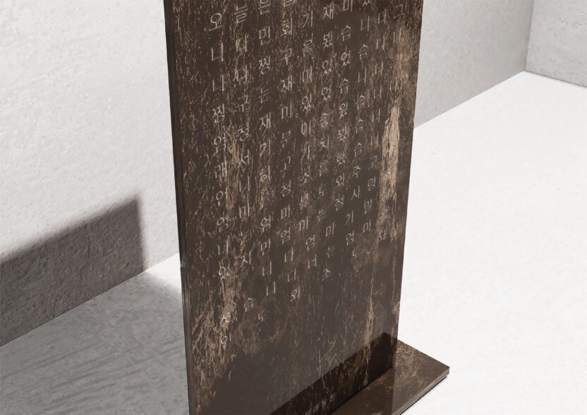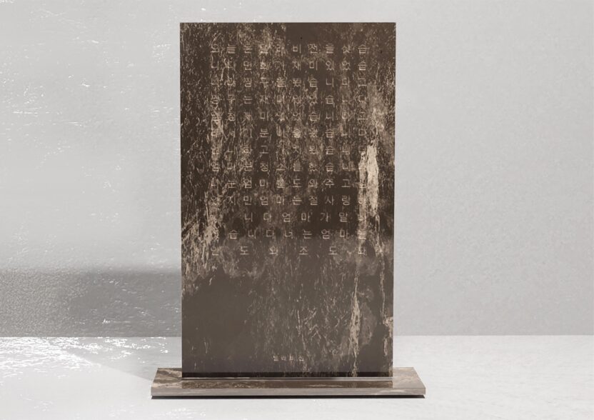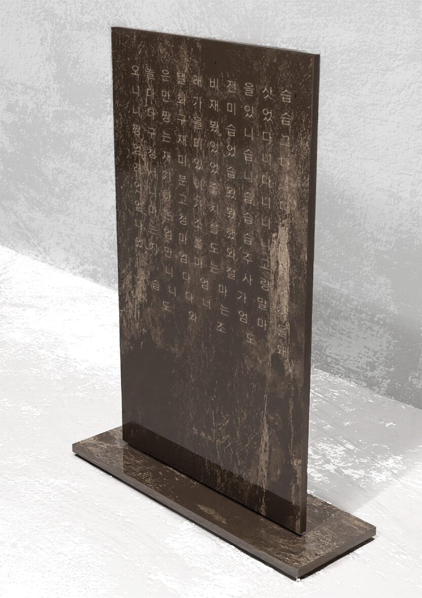 어린 시절엔 가족이 세상의 전부이기 마련이다. 〈사랑〉은, 김민정의 옛 일기장에 빼곡하게 쓰인 가족과의 에피소드를 소재로 한 설치물이다. 기획부터 제작까지, 대리석 사업을 하시는 아빠와 함께했다. 6살에 삐뚤삐뚤 손으로 쓴 글을, 디자이너가 된 현재에 자주 사용하는 디지털 서체로 재구성해 대리석에 새겼다. 사소한 일기와 거대한 작품이라는 상반된 방식이지만, 일기를 적거나 작품을 제작하는 과정에서는 일관되게 변치 않는 가족에 대한 사랑을 엿볼 수 있다.