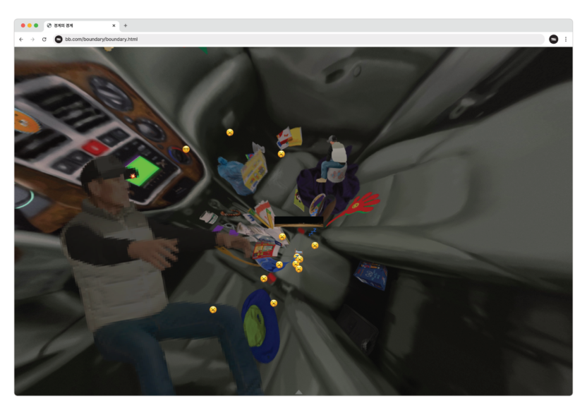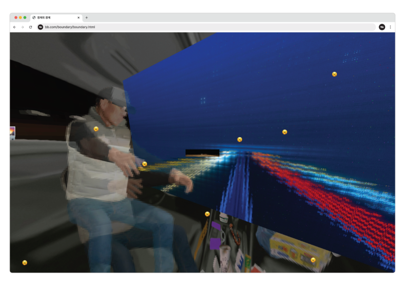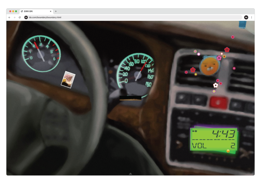 〈경계의 경계〉는, 달리는 차 안이라는 가상의 공간과 그 공간을 화면으로 마주하는 현실의 관람자 사이의 경계를 시청각적으로 담아낸 인터랙티브 웹 작품이다. 어디론가 하염없이 이동하는 창밖의 익숙하고 낯선 풍경과 여러 소리가 공간을 채울 때, 화면 속 만들어진 세계와 자신의 경계 사이에 비집고 들어오는 경험을 하게 된다. 이 작품은 고정된 시점에서 차 안과 창밖을 둘러볼 수 있으며, 여러 이미지와의 상호작용을 통해 정보를 얻고, 다양한 음향와 영상을 감각적으로 체험할 수 있다.