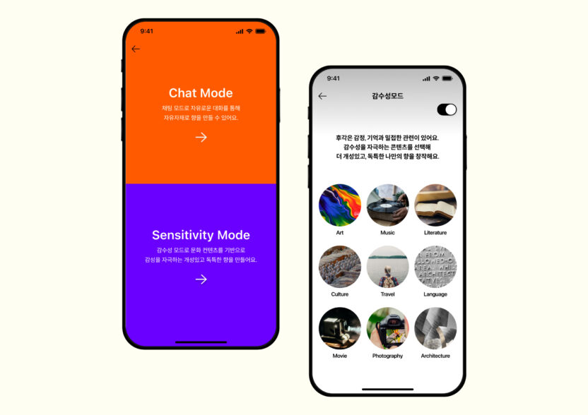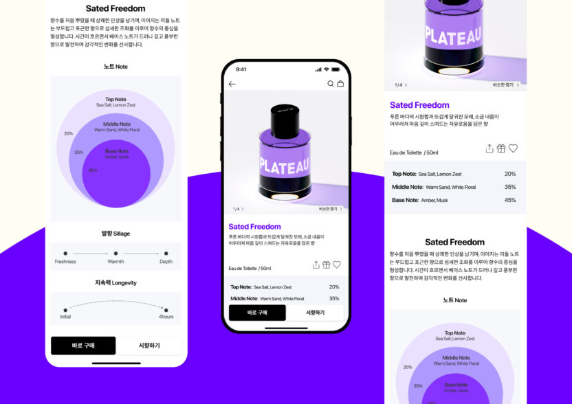 〈Plateau〉는 인공지능을 활용한 맞춤형 향수 제작 서비스이다. 빠른 속도로 기술이 발전하고 다양한 정보에 대한 접근성이 좋아지면서, 사람들은 점점 더 개인화된 경험을 추구하고 있다. 〈Plateau〉는 이러한 트렌드에 맞추어, 개인의 취향을 반영한 맞춤형 향수 제작 서비스를 제공한다. 향수에 있어 시향은 매우 중요한 요소이지만, 기존에는 이를 위해 오프라인 매장을 방문해야 하는 불편함이 있었다. 〈Plateau〉는 기기를 활용한 비대면 시향 서비스를 제공하여, 구매 과정에서의 불편을 최소화한다. 사용자들은 인공지능이 제안하는 개인화된 향수를 온라인에서 편리하게 제작하고 시향함으로써, 감각적이고 만족스러운 경험을 할 수 있다.