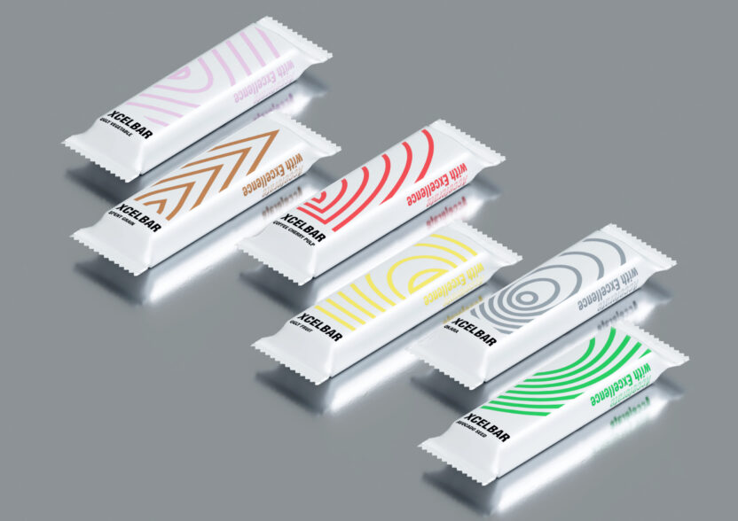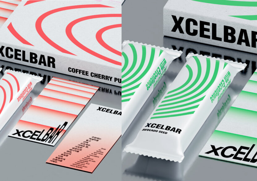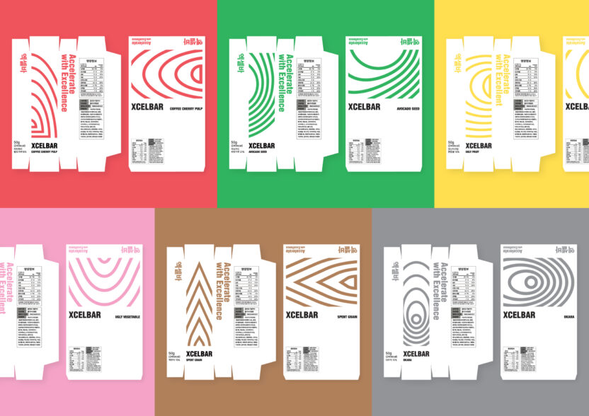 〈XCELBAR〉는 푸드 업사이클링 에너지바 브랜드로, 영양이 높지만 못생기거나 먹기 힘들어 활용하지 못했던 아보카도씨앗, 커피체리펄프, 못난이과일, 못난이야채, 맥주박, 대두박을 활용하여 제작한 에너지바이다. Excellent(훌륭한)과 Accelerate(가속화하다)를 더한 〈XCELBAR〉라는 브랜드명은, 간편하고 뛰어난 에너지로 일상을 활기차게 해주는 제품의 특성을 반영한다. 에너지가 퍼져나가는 파동을 모티프로, 지속가능한 브랜드의 장점을 시각적으로 표현하였다.