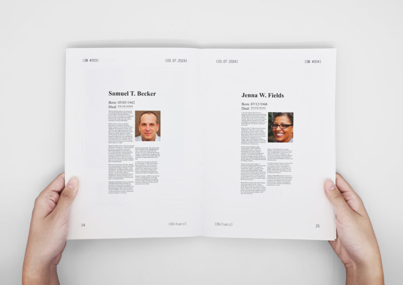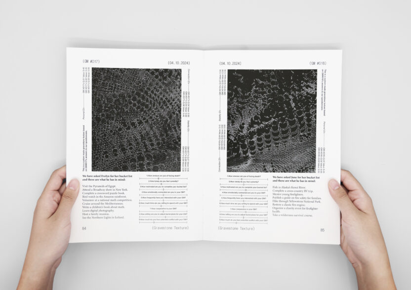 “하카토모(무덤 친구)”는 무덤을 방문하고 돌봄으로서 우정을 형성하는 일본의 문화다. 이 관행은 가까운 가족 관계가 없을 수도 있는 고령 인구를 돕거나, 개인의 사회적, 정서적 필요를 해결하여 최근 인기가 높아지고 있다. GMC(Grave Mate Catalog)는 무덤 파트너 간의 다양한 사례를 시각적 수단과 텍스트로 보여준다. 가상의 이벤트인 GMC 서밋에서 기록된 대화 로그를 통해 그레이브메이트 간의 잠재적인 호환성을 알 수 있다. 각 그레이브메이트는 죽음에 대한 자신의 태도와 파트너에 대한 9가지 질문에 답해야 하며, 이를 바탕으로 맞춤형 묘비 텍스처가 생성된다. 이후 그레이브메이트 쌍은 서로의 호환성을 평가하는 6가지 질문에 함께 답하고, 이를 기반으로 묘지 디자인이 만들어진다.
