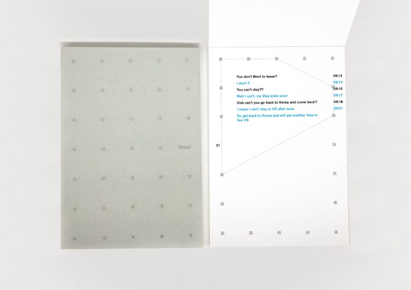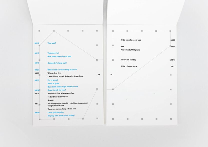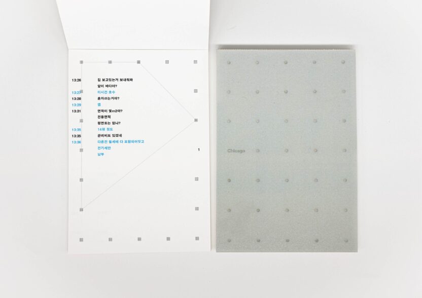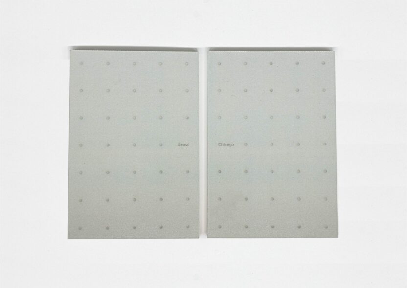 문자 메시지는 공간의 제약을 받지 않는 디지털 소통 방식이다. 〈서울 – 시카고〉는 이러한 문자 메시지를 마치 건축 도면처럼 공간적으로 재구성한다. 문자를 주고받은 사람이 위치한 실제 공간에 따라 텍스트를 분류하고 배치하여, 새롭게 만들어지는 대화의 맥락을 관찰한다. 서울과 시카고의 대화에서 느껴지는 호흡과 맥락을 도면으로써 시각화한다. 두 가지의 언어와 화자의 태도에 따라 문자가 사유하는 공간이 달라진다. 이 둘은 분리되어 있다가 이어지며, 서로의 언어가 고유했다가 혼합되기도 한다.