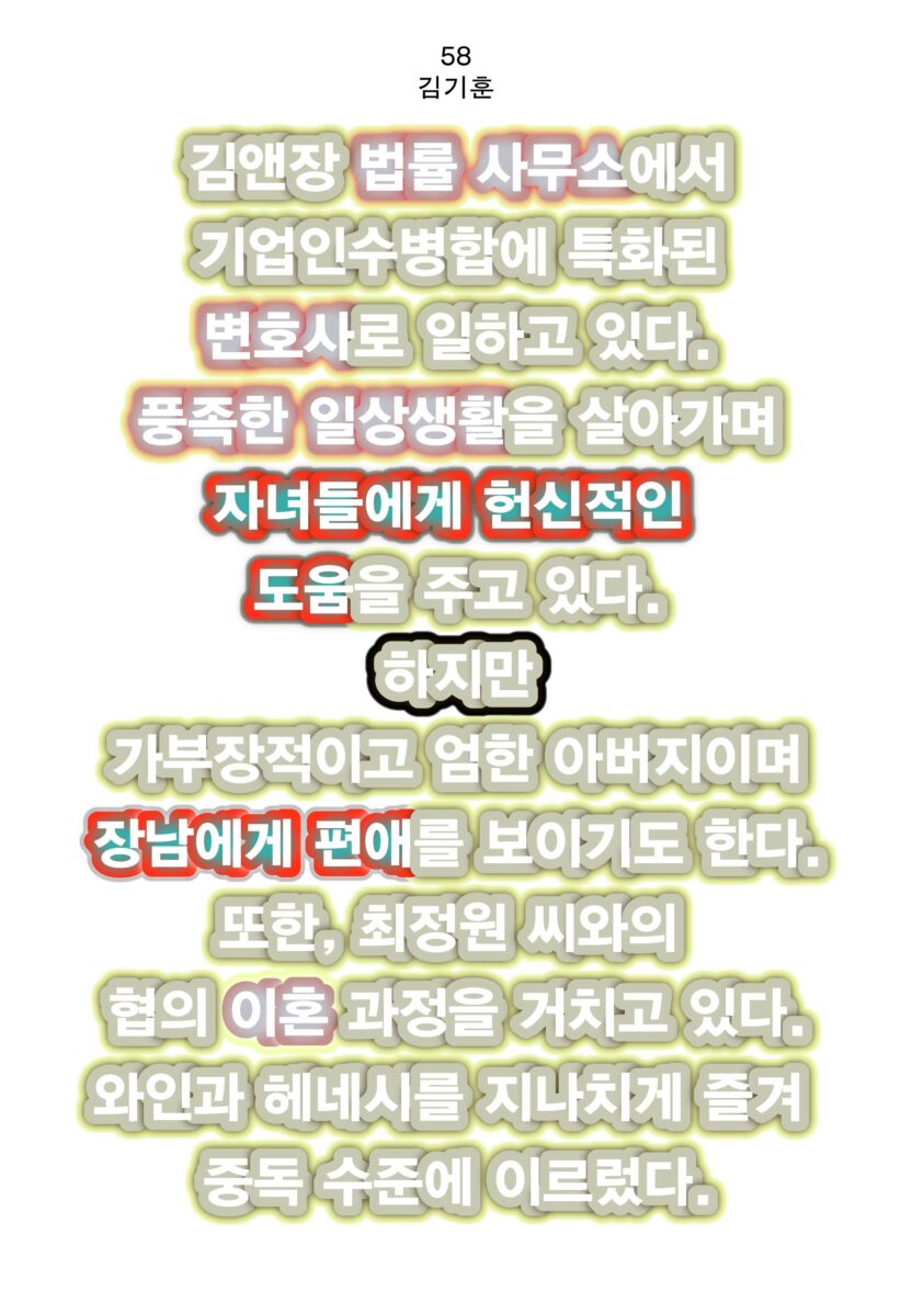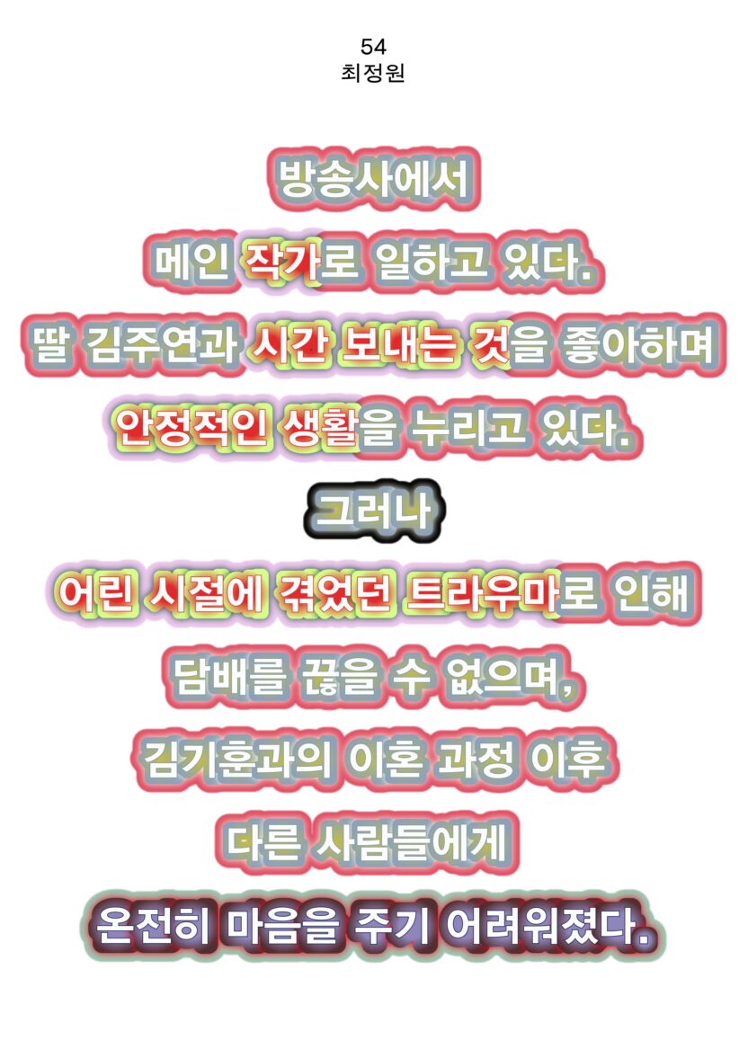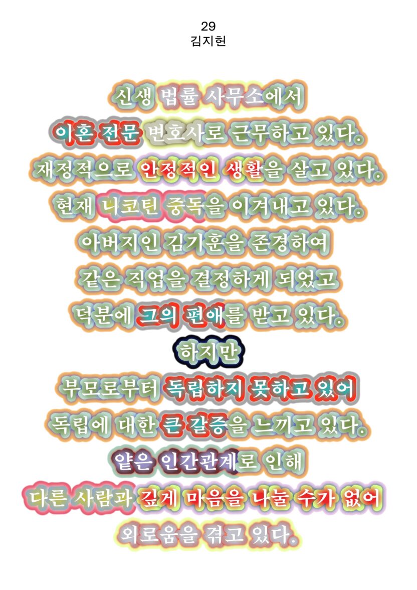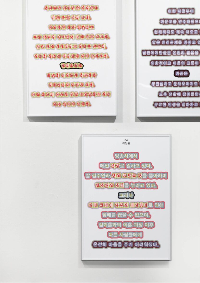 〈Genome Project〉는 10명의 가상 인물을 가족관계도로 시각화한 프로젝트이다. 각 인물의 다양한 정보를 세대별로 분석해 그들 간의 관계를 탐구하였다. 각 인물의 정보는 텍스트로 표현되며, 이러한 텍스트가 유전자의 역할을 한다. 여러 유전자가 모여 문단이 되고, 하나의 게놈을 형성한다. 인물의 정보는 보여주고 싶은 정보와 숨기려는 정보로 나뉘며, 부사를 중심으로 수직적으로 시각화된다. 세대를 거쳐 인물 간의 관계에 따라 이들의 정보는 일치하거나, 반대되거나, 미묘하게 유사한 양상을 보인다. 이를 통해 인물들 간의 관계를 시각적으로 탐구하며, 텍스트가 유전자처럼 세대를 넘어 전달되는 방식을 보여준다.